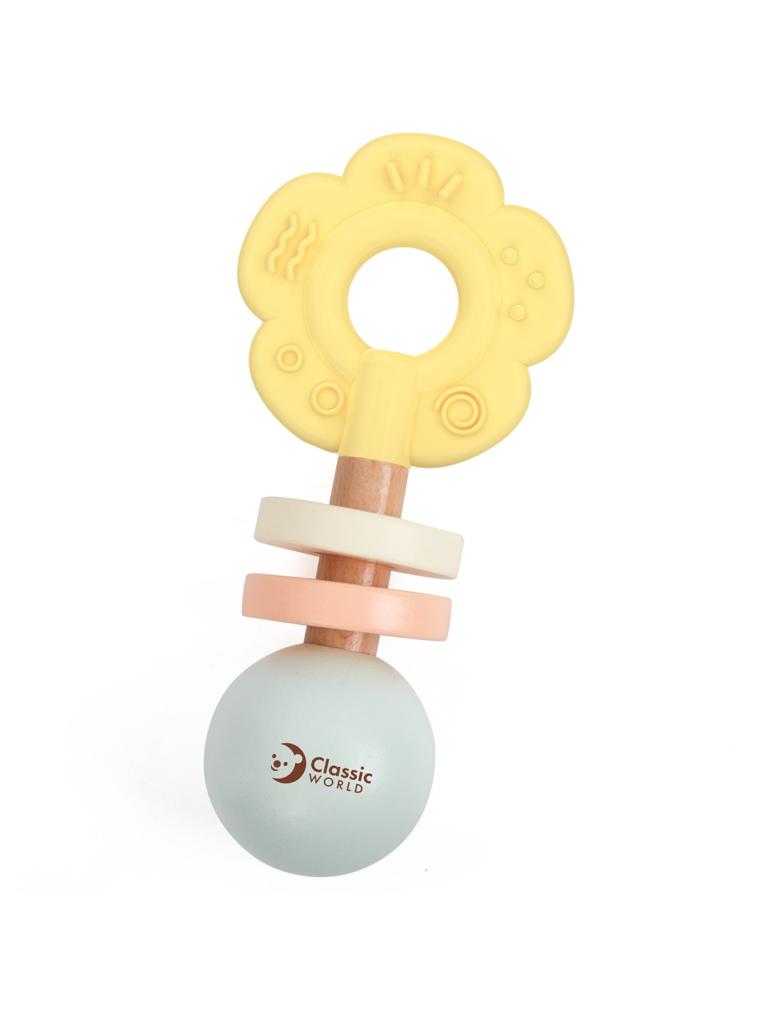 Urocza grzechotka w kształcie kwiatka zaprojektowana została z myślą o najmłodszych dzieciach. Delikatne, pastelowe kolory przyciągają uwagę maluszka, a przyjemna w dotyku powierzchnia i odpowiedni rozmiar sprawiają, że łatwo ją chwycić i potrząsać. Zabawka została stworzona z bezpiecznych materiałów – drewna i silikonu – dzięki czemu nadaje się dla dzieci już od pierwszych dni życia.
