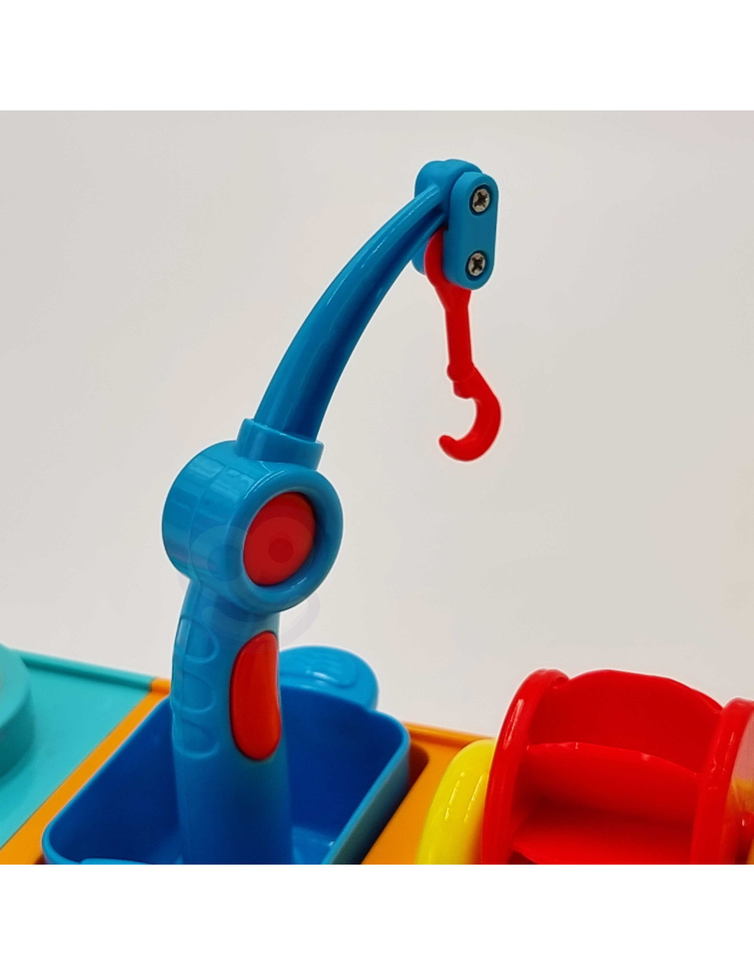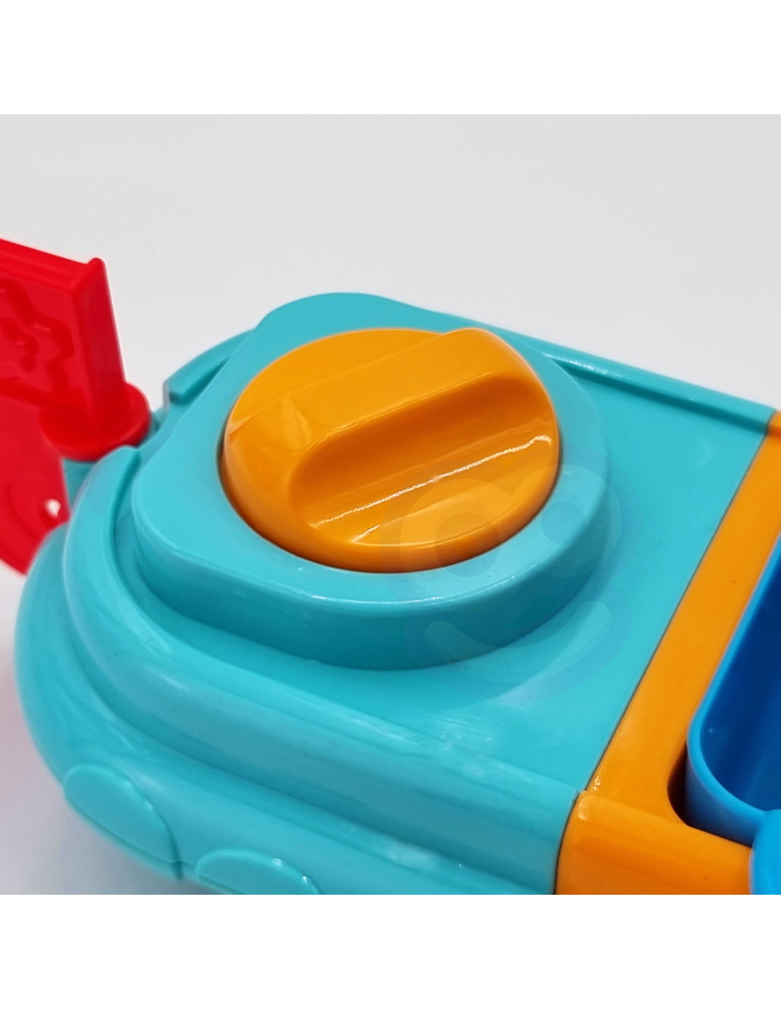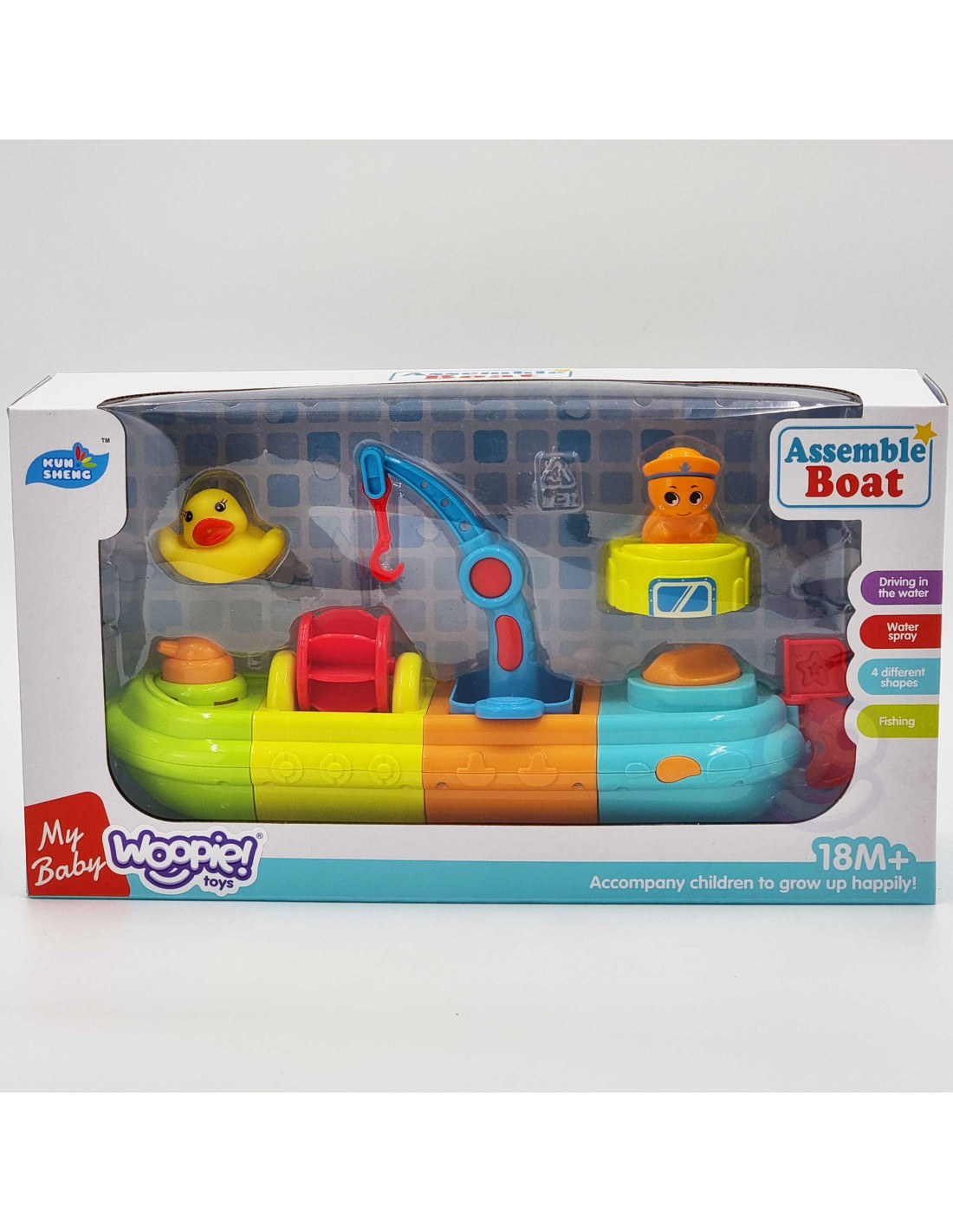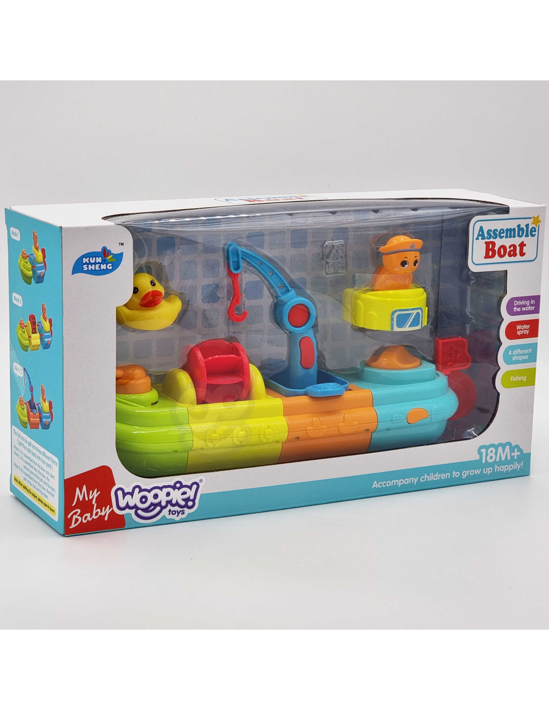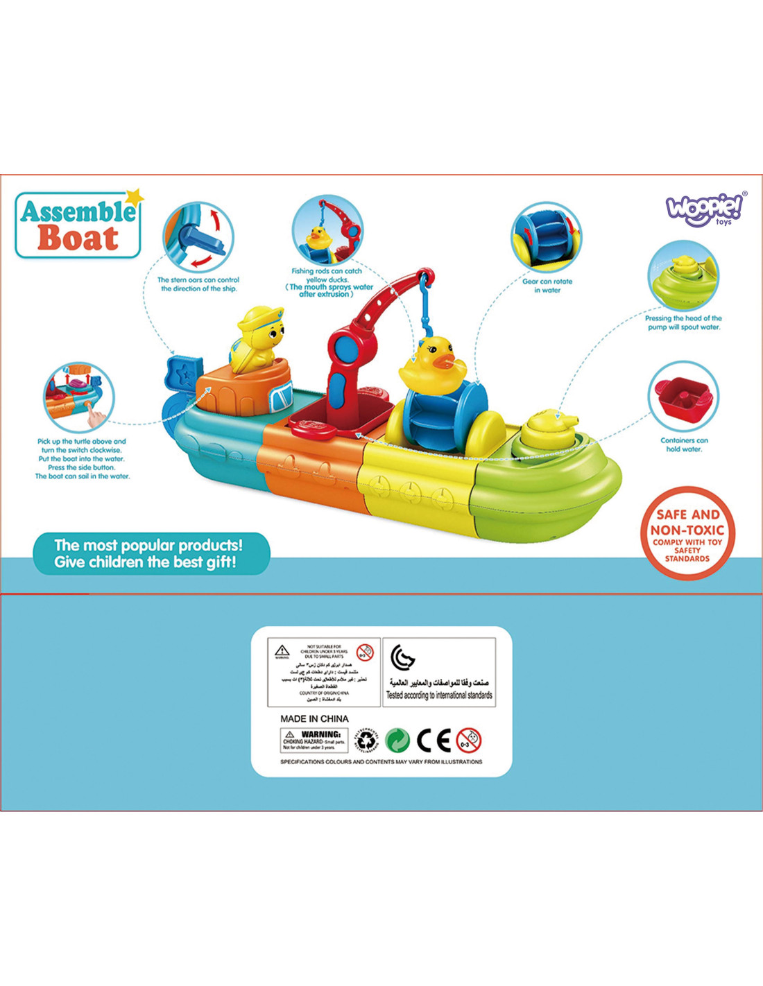 Kolorowa łódź marki Woopie to zabawka umilająca kąpiel dzieciom. Wykonana w formie wielobarwnej łodzi z pasażerami- żółwiem i kaczką. Statek składa się z kilku części. Wyposażony jest w dźwig z hakiem na który możemy zaczepić kaczuszkę, młynek wodny oraz armatkę.