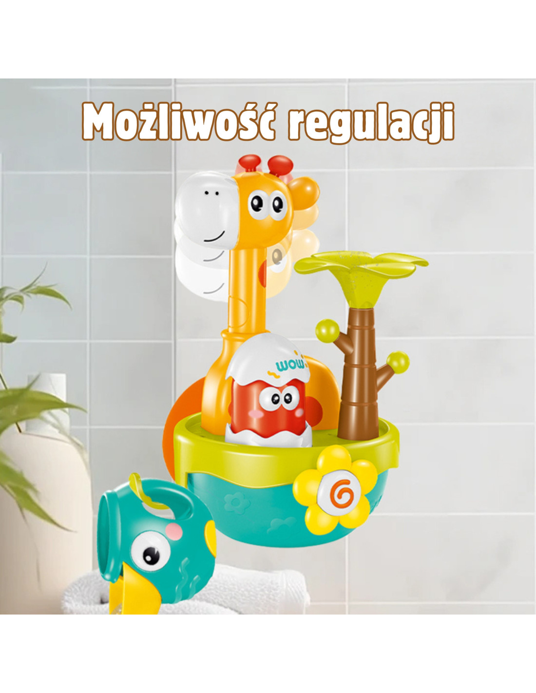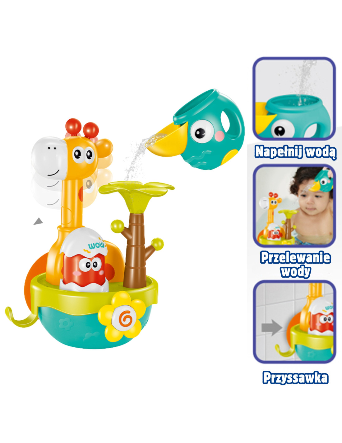 Zmień codzienną kąpiel w fascynującą przygodę z zabawką do kąpieli Żyrafa! Ta urocza zabawka to gwarancja, że Twoje dziecko nie będzie płakać pod prysznicem. Żyrafa mocuje się do wanny za pomocą przyssawki i służy do przelewania wody. W zestawie znajduje się lejek w kształcie kaczuszki, którym dziecko może napełniać zbiornik żyrafy. Po wlaniu wody uruchamia się efekt wodospadu, a z czerwonej postaci w skorupce wysuwa się głowa , co zapewnia dodatkową frajdę. Zabawka jest łatwa do przechowywania dzięki wbudowanemu uchwytowi/haczykowi, co pomaga w kształtowaniu dobrych nawyków porządkowych.