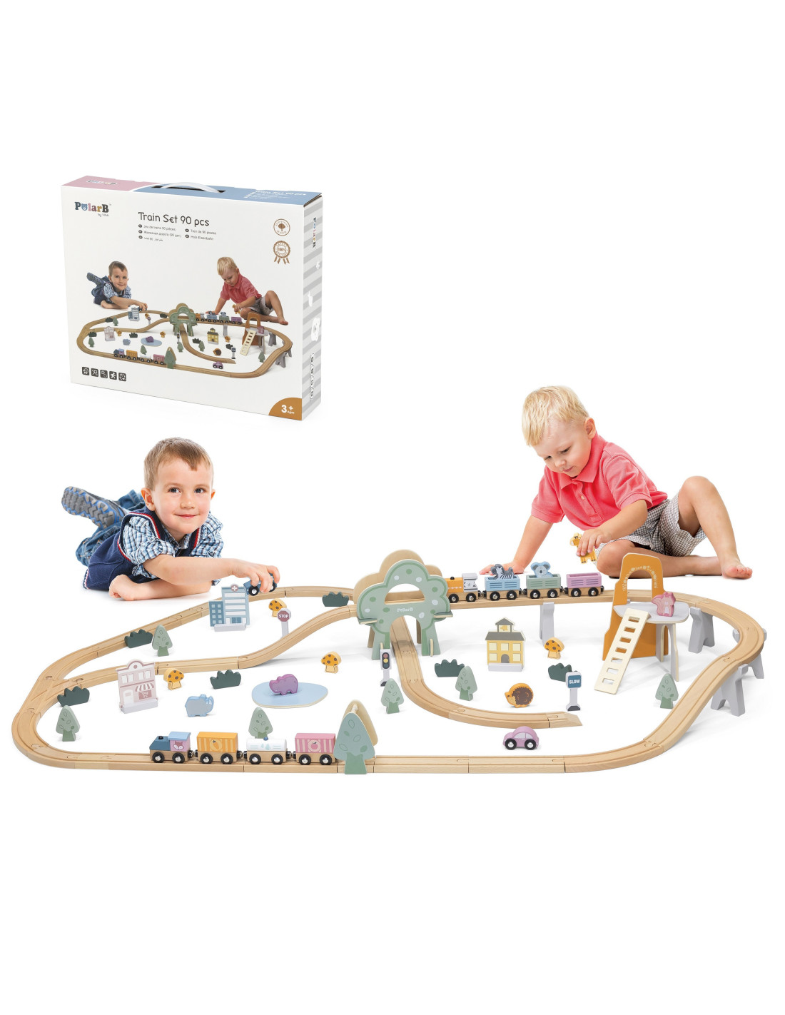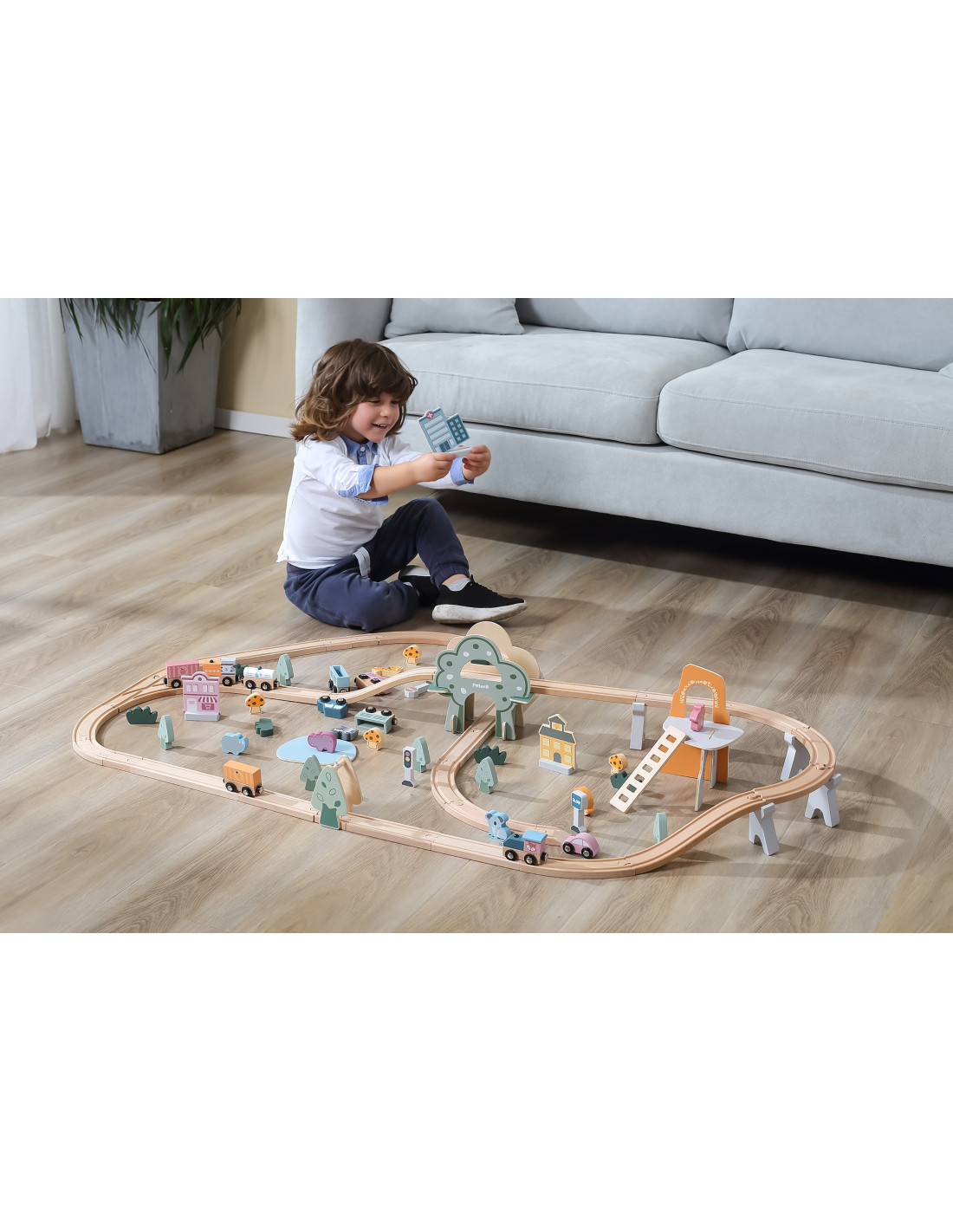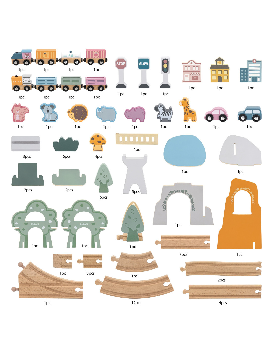 - - zestaw składa się z 90 elementów, m.in. tory, wzniesienia do torów, pociąg i różne wagoniki, znaki kolejowe, budynki, zwierzątka, pojazdy oraz różnego rodzaju drzewa, skały,