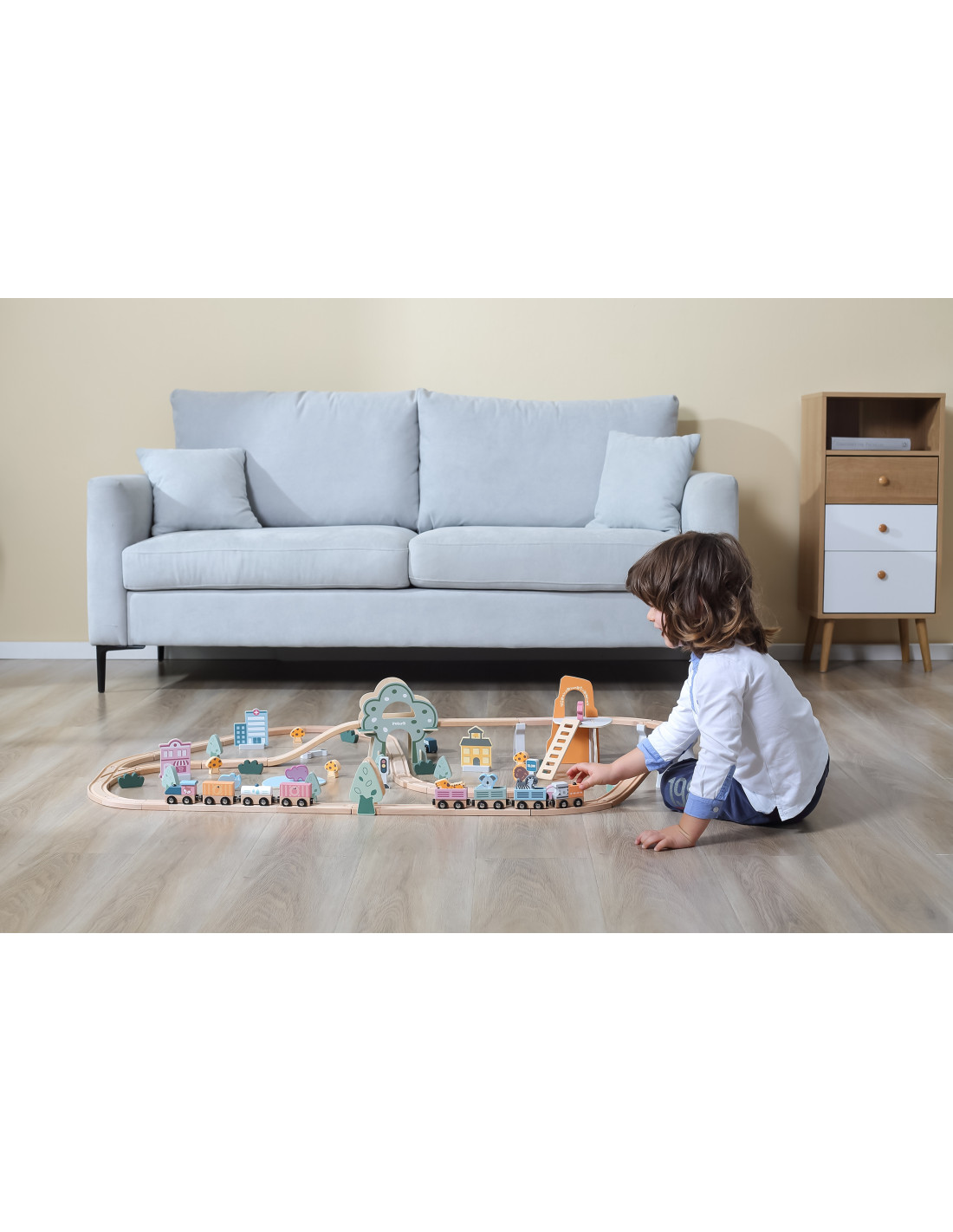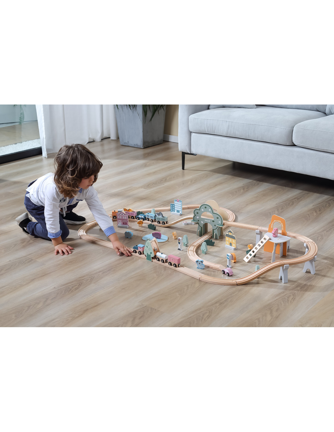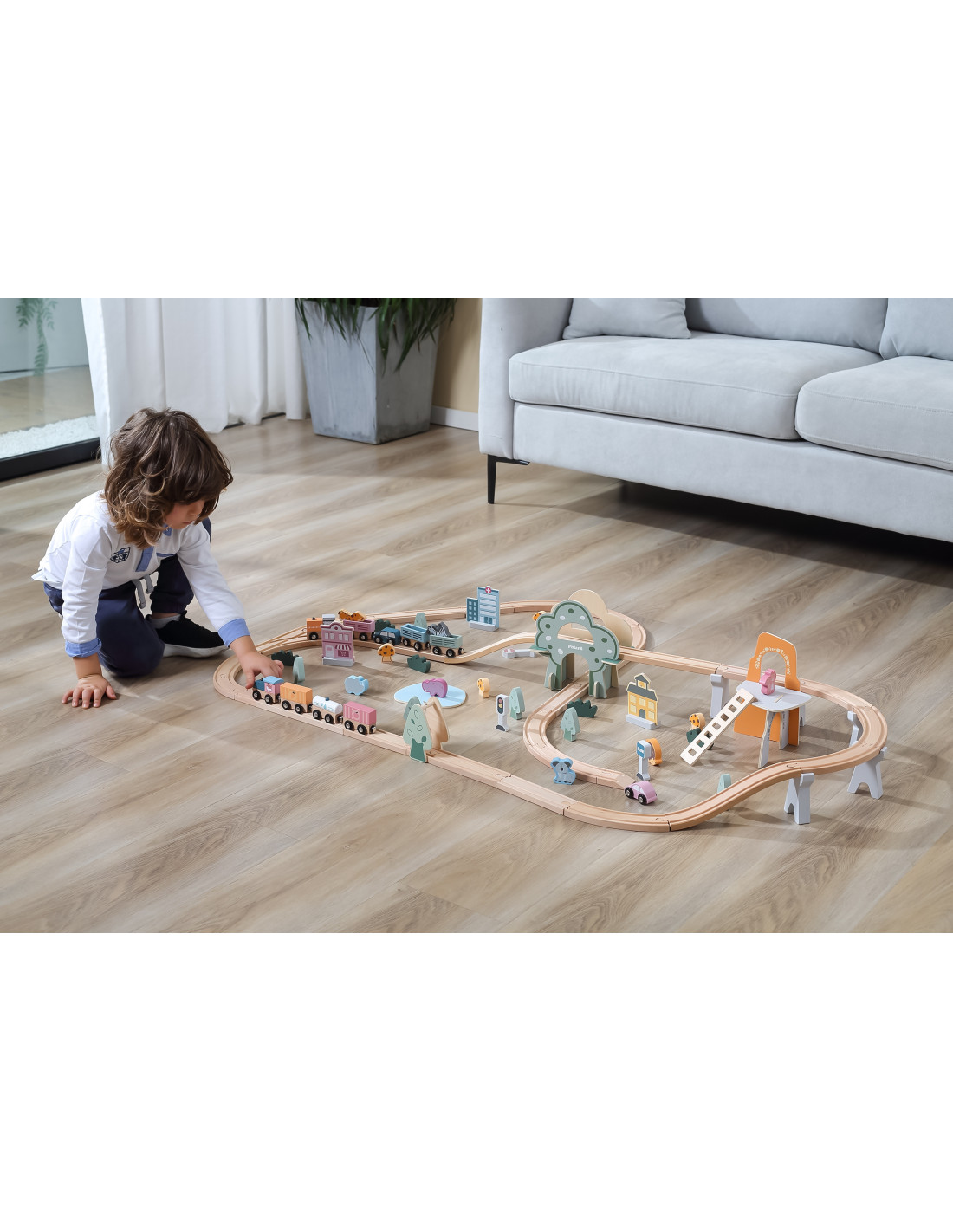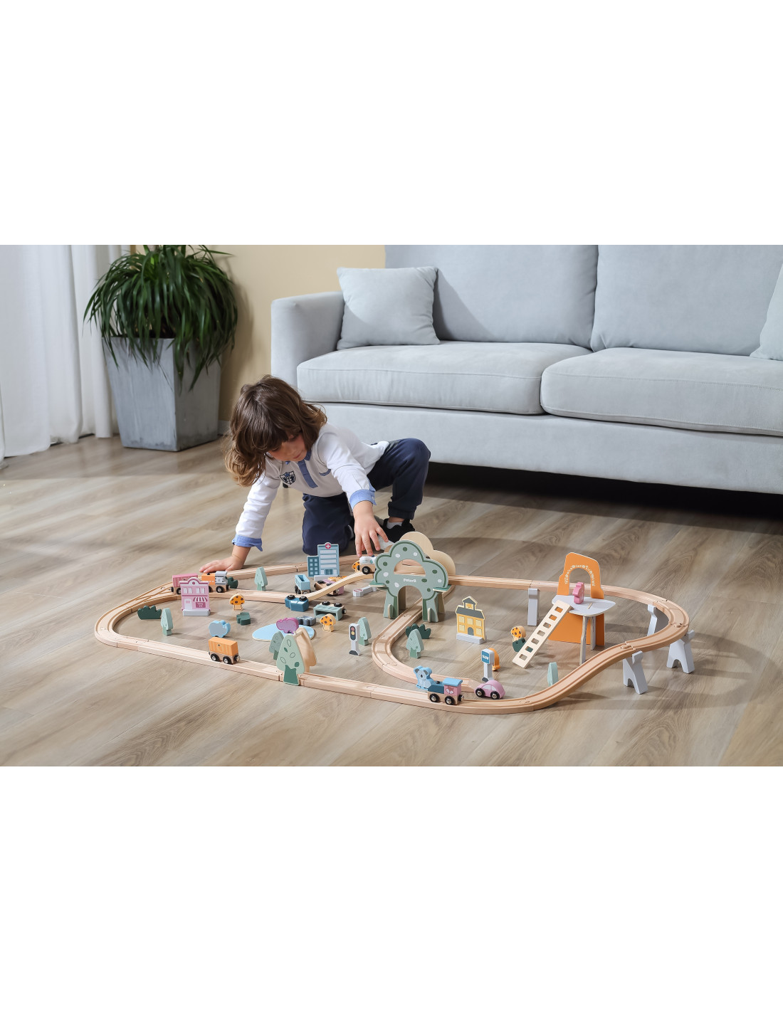 - - zestaw składa się z 90 elementów, m.in. tory, wzniesienia do torów, pociąg i różne wagoniki, znaki kolejowe, budynki, zwierzątka, pojazdy oraz różnego rodzaju drzewa, skały,