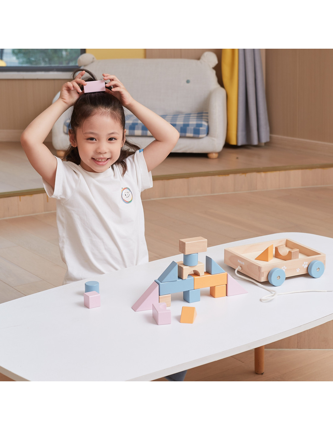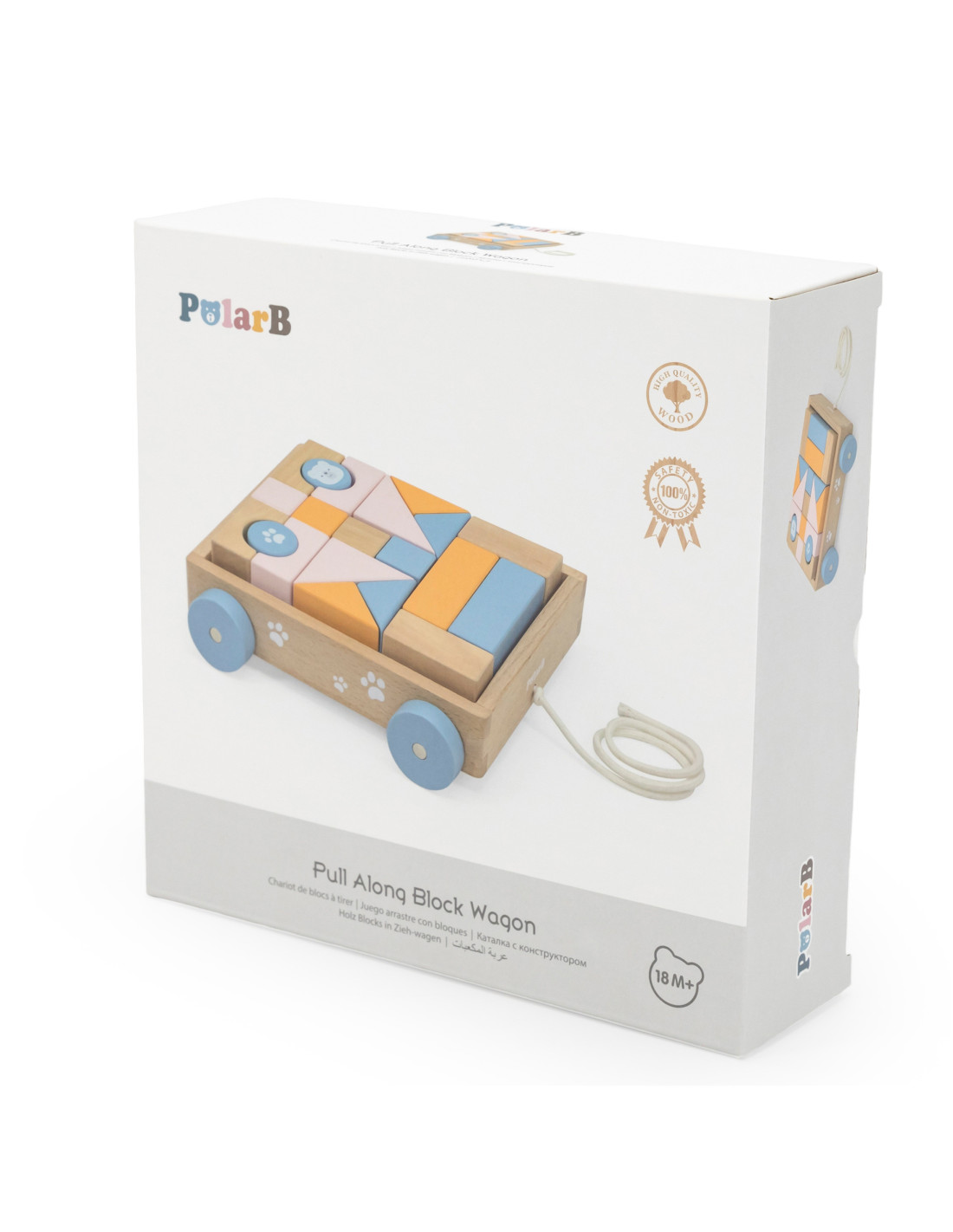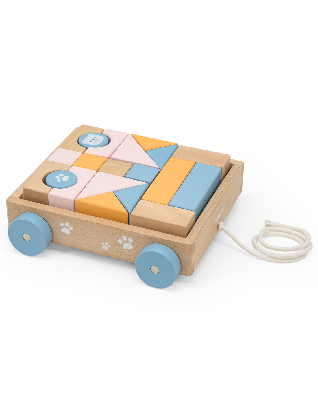 Drewniany Wózek do Ciągnięcia od marki VIGA PolarB to klocki w pastelowych kolorach, umieszczone na wygodnym wózeczku. Dzięki 20-częściowym drewnianym bryłom można tworzyć fantazyjne budynki dzięki różnym kształtom, kolorom i odciskom. Umiejętności motoryczne i kreatywność są wspierane przez zabawę drewnianymi elementami konstrukcyjnymi. Budynki są wykonane z drewna bukowego, lakierowane, w harmonijnych kolorach i zabezpieczone przed dziećmi. Po zakończeniu gry, klocki mogą być posortowane z powrotem do wózka i w mgnieniu oka wszystko jest znowu uporządkowane. Za pomocą sznureczka dziecko może ciągnąć wózeczek z posortowanymi klockami po podłodze.