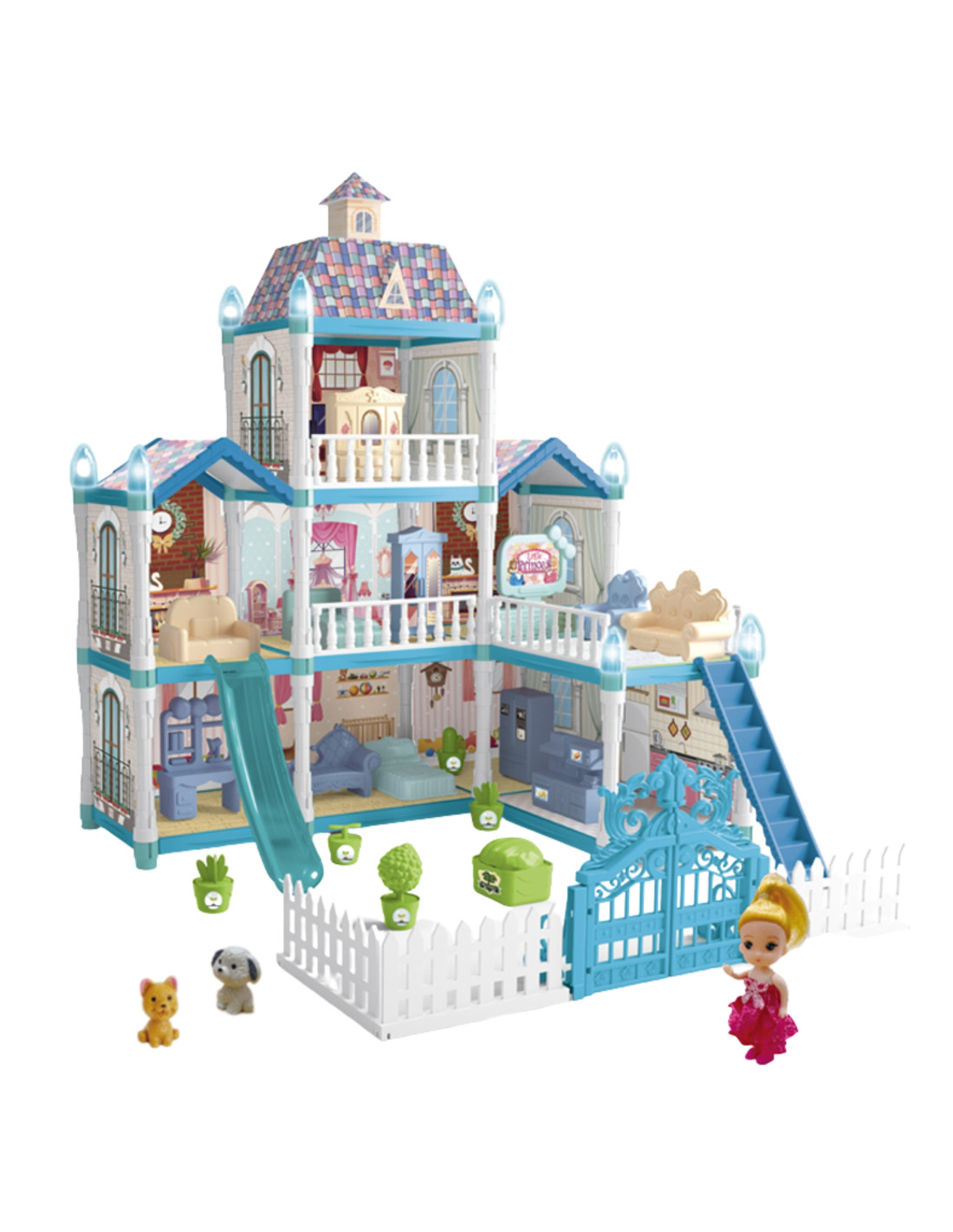 Odkryj magiczny świat zabawy z zestawem Domkiem dla Lalek od marki Woopie! Ten ogromny, trzypiętrowy pałac oferuje niezliczone możliwości kreatywnej zabawy. Zestaw zawiera aż 191 elementów, w tym uroczą lalkę, dwa zwierzątka , bogate wyposażenie wnętrz oraz piękne, świecące fotoluminescencyjne dekoracje , które sprawią, że zabawa nie skończy się po zmroku. Domek utrzymany jest w uroczej, niebiesko-różowej kolorystyce, inspirowanej zimowym ogrodem. Idealny na prezent, zachęca do odgrywania ról, rozwijając wyobraźnię i umiejętności społeczne.