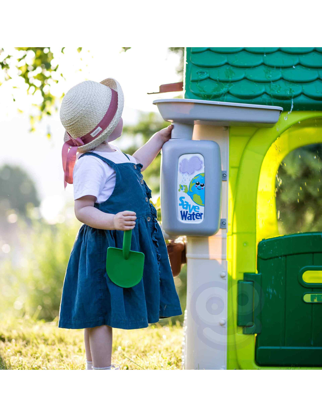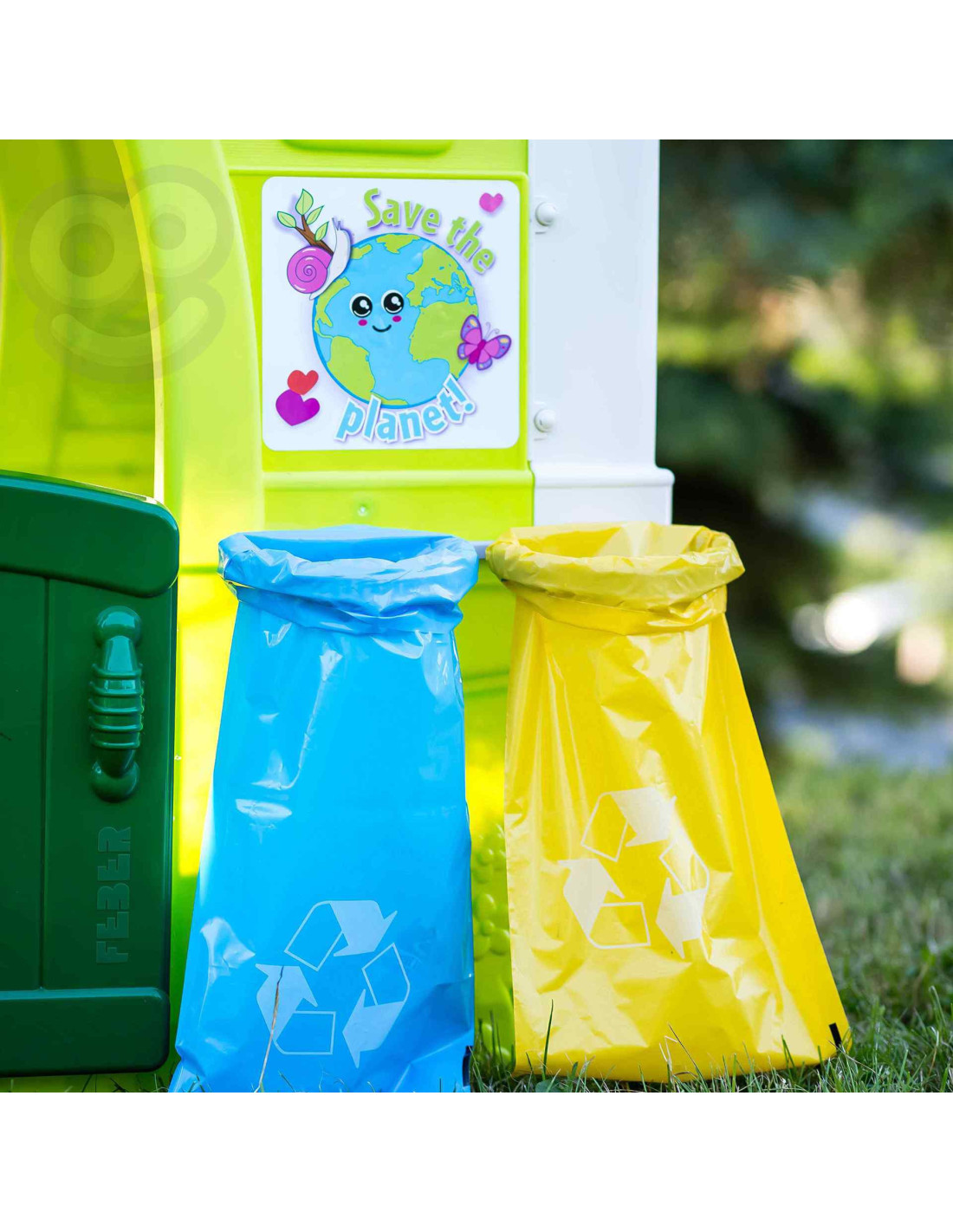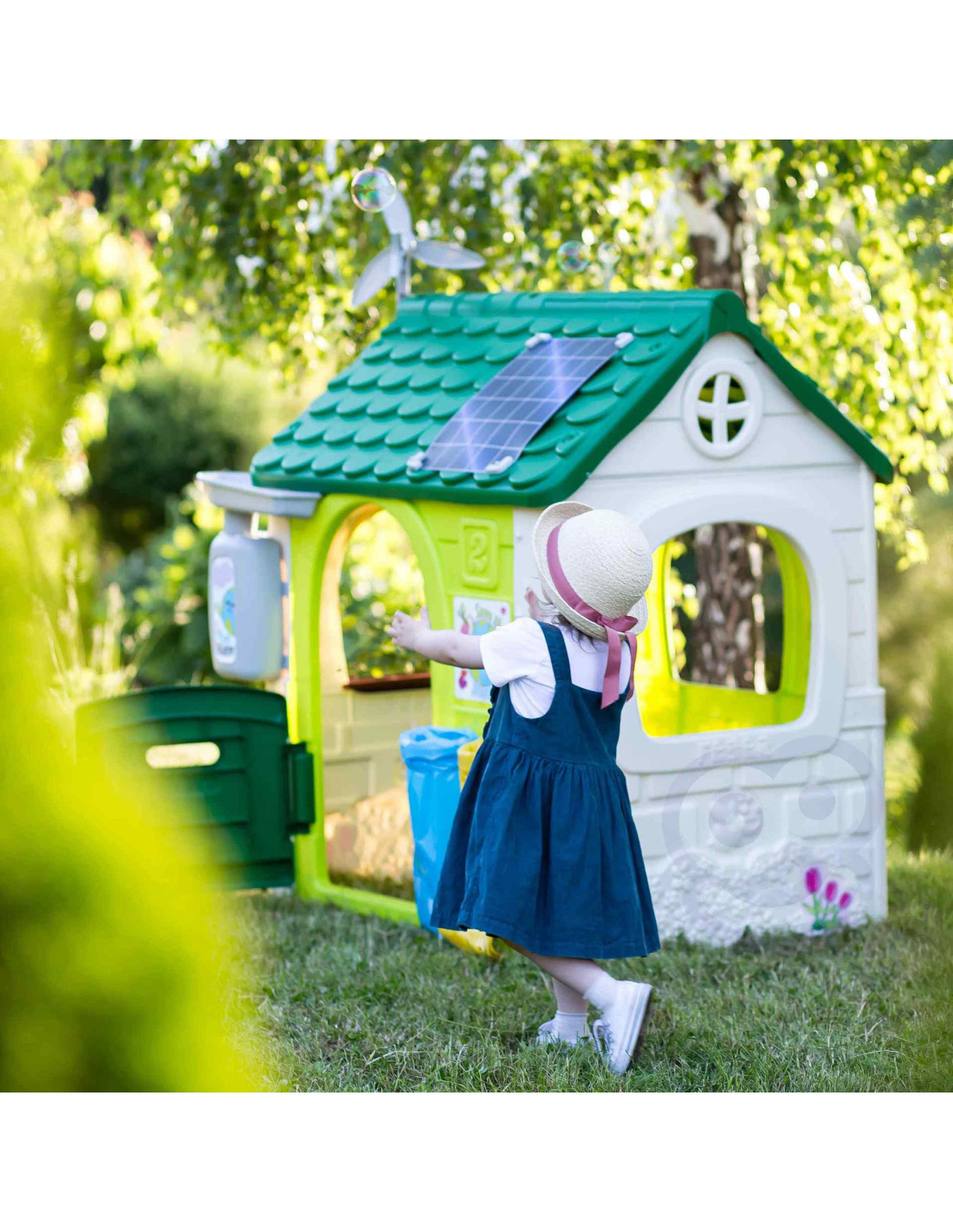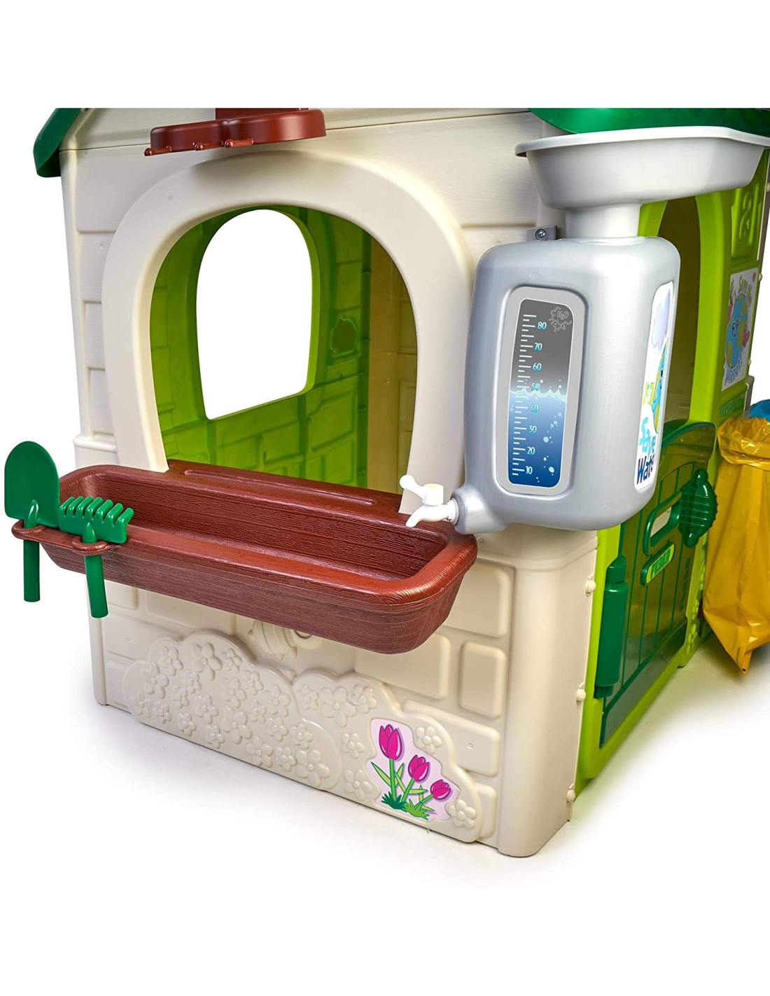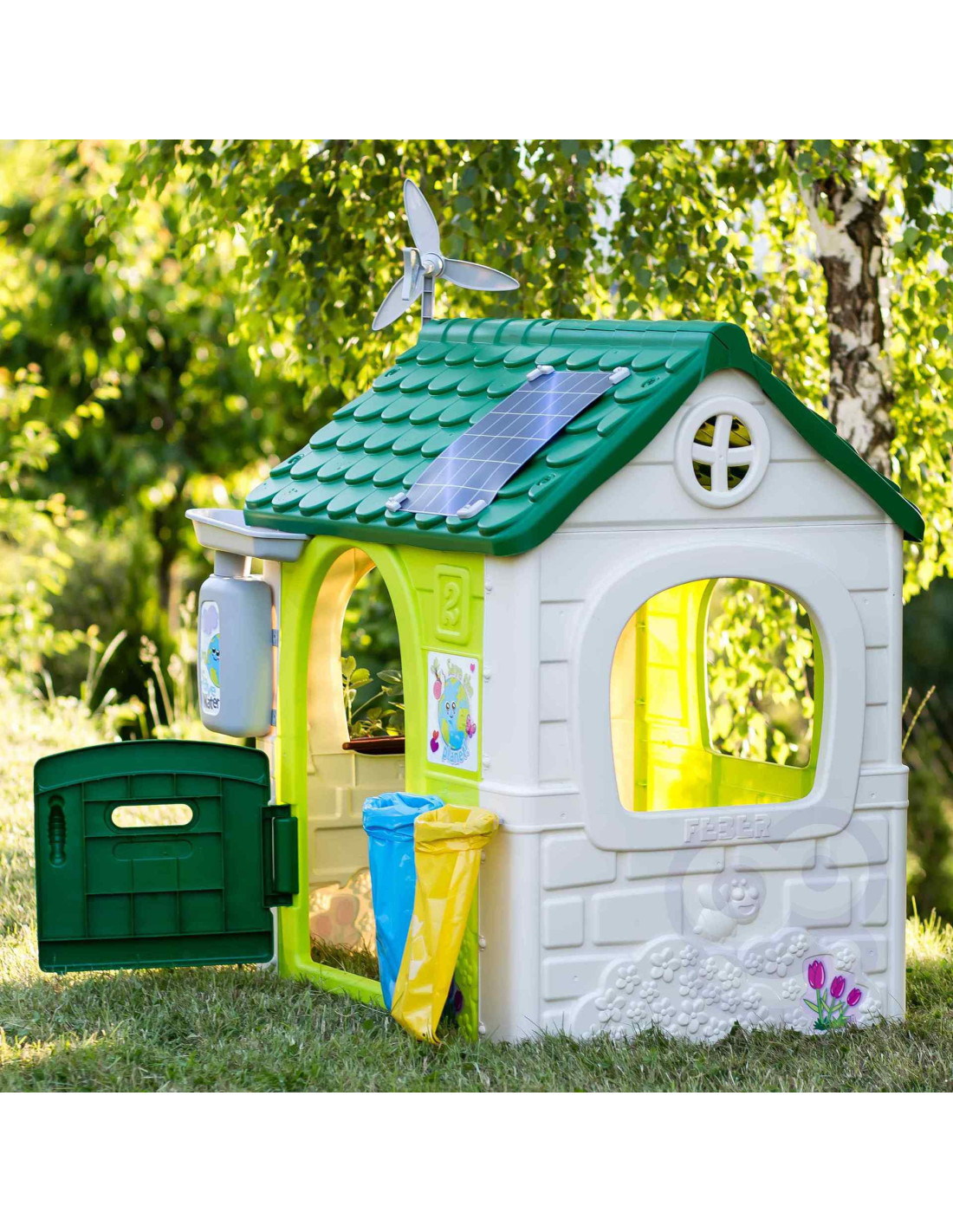 Domek FEBER ECO to domek zabaw, w którym znajdują się wszystkie aktywności potrzebne maluchom do wzbudzenia ciekawości w przyrodzie. Świetne miejsce i świetna nauka dla dzieci! W zestawie 2 kosze do recyklingu (żółty i niebieski), mały ogródek (w doniczkach) i narzędzia. To świetna aktywność na świeżym powietrzu dla dzieci. Można bawić się w sadzenie nasion i obserwowanie wzrostu roślin. Wyposażony jest również w gniazdo i karmnik dla ptaków. A woda deszczowa jest idealna do podlewania roślin lub kwiatów. Wiatrak i imitacja panelu słonecznego dają niesamowite funkcje do nauki o zrównoważonych energiach! Odporne, łatwe w montażu i wyposażone w system Anti UV zapobiegający utracie koloru i zwiększający odporność tworzywa.