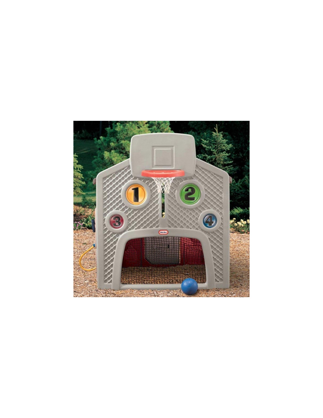 - Ściana z motywami sportowymi wyposażona jest w obręcz, piłkę oraz tarczę do rzucania piłek.