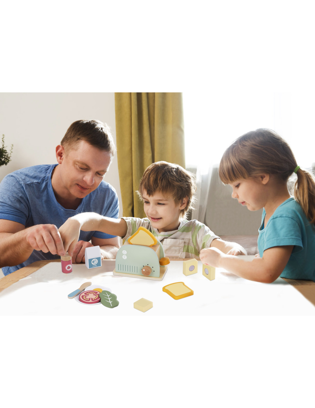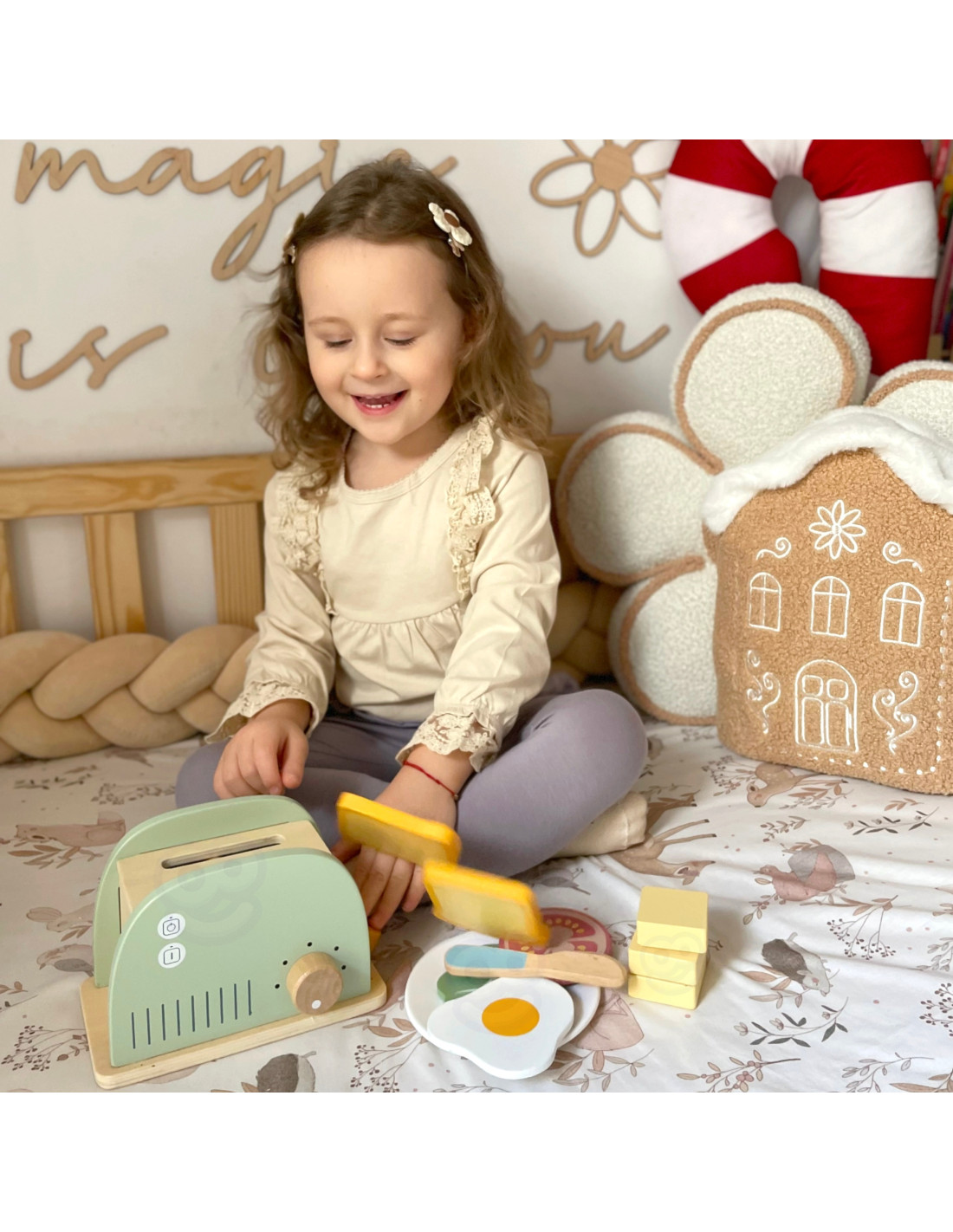 Toster Drewniany dla dzieci marki Tooky Toy w pastelowych kolorach to doskonała zabawka do roli kucharza zarówno dla najmłodszych, jak i profesjonalistów. Ten uroczy drewniany toster stanowi wyjątkowy dodatek do dziecięcej kuchni, inspirując do kreatywnej zabawy w przygotowywanie śniadań i posiłków. Zestaw zawiera nie tylko toster ale także inne drewniane akcesoria, takie jak tosty, sery, sałatki, dżemy i inne składniki, co sprawia, że dzieci mogą tworzyć różnorodne kombinacje podczas zabawy.