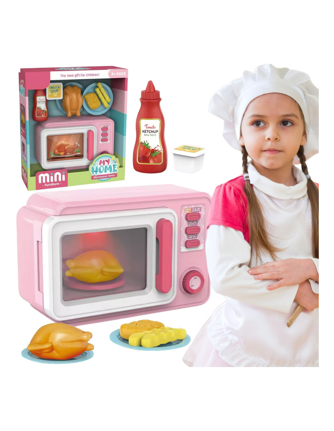 Zabawkowa Różowa Kuchenka Mikrofalówka to nowoczesna zabawka, która wnosi kuchenne rewolucje prosto do pokoju dziecięcego! Dzięki realistycznym funkcjom i efektom świetlno-dźwiękowym, ten interaktywny zestaw nie tylko przyciąga wzrok dzieci, ale także inspiruje do kreatywnego i edukacyjnego odgrywania ról. Mikrofalówka została zaprojektowana tak, aby jak najlepiej odwzorować prawdziwe urządzenie AGD — wyposażona jest w świecące wnętrze, obracający się talerz oraz efekty dźwiękowe towarzyszące pracy urządzenia. Dodajmy do tego komplet akcesoriów kulinarnych, a dziecko może bez końca bawić się w gotowanie! Dzieci wybierają czas odgrzewania, otwierają i zamykają drzwiczki, wkładają kurczaka, frytki lub nuggeta, a następnie obserwują, jak talerz się kręci, a dioda LED emituje światło, imitując pracę mikrofalówki. Zabawa tą kuchenką pozwala dzieciom uczyć się poprzez odgrywanie ról – To idealna zabawka edukacyjna, która pobudza wyobraźnię i wprowadza dzieci w świat codziennych obowiązków w zabawny sposób.