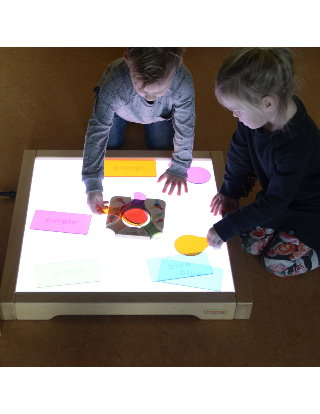 Solidny drewniany panel LED z możliwością zmiany koloru renomowanej firmy Masterkidz. Umożliwia różne rodzaje działań wspierających rozwój kreatywności, np. mieszanie kolorów oraz inne metody nauki systemem STEM. Piękne efekty można uzyskać, gdy światło przebija różne materiały, takie jak liście, papier, taca z piaskiem itp.