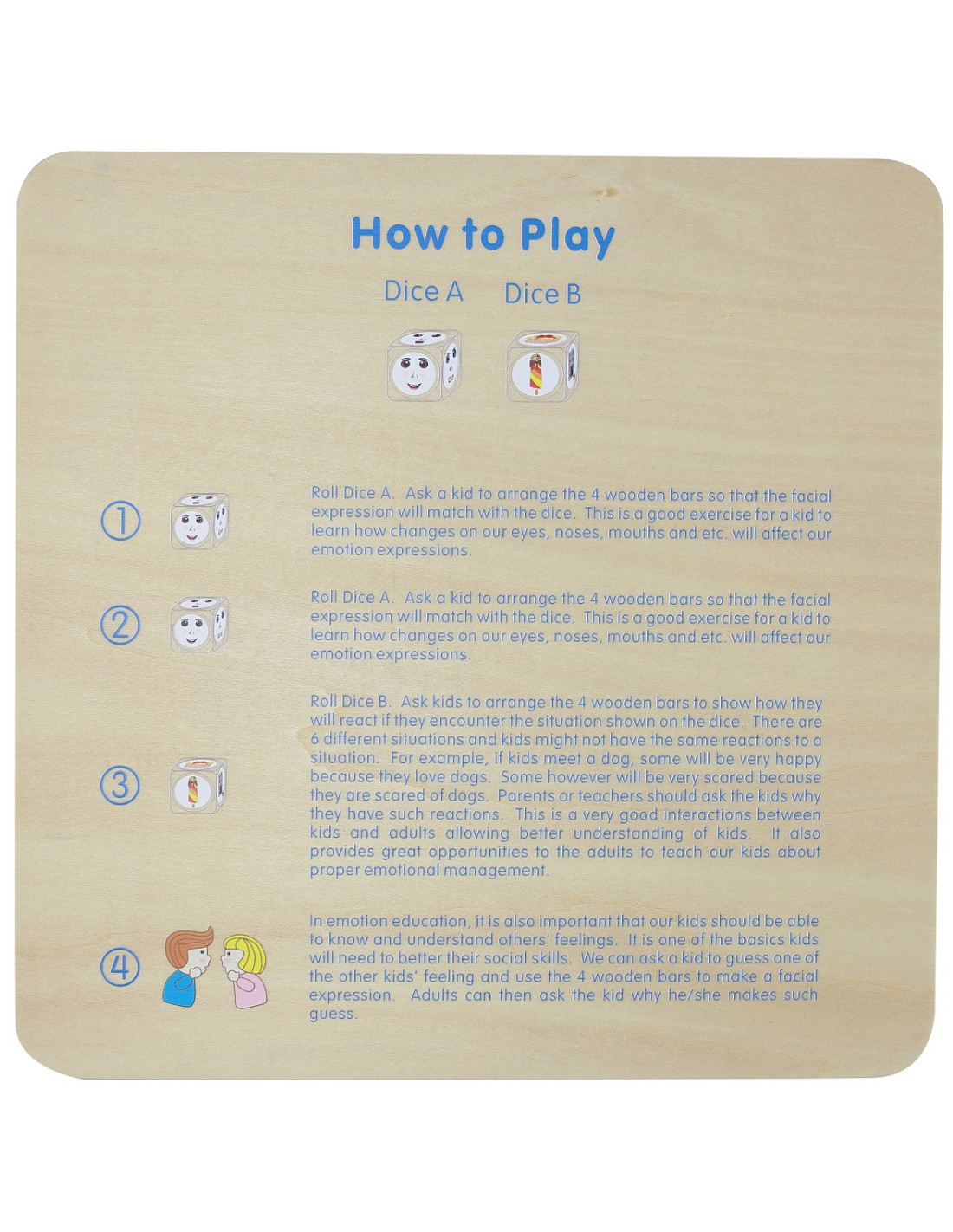 Rzuć drugą kostką. Poproś dzieci, aby ułożyły 4 drewniane klocki,w taki sposób aby pokazać, jakie emocje odczuwają, jeśli napotkają sytuację pokazaną na kostce. Istnieje 6 różnych sytuacji, a dzieci mogą w różny sposób zareagować na tą samą sytuację. Na przykład, jeśli dzieci widzą psa, niektóre będą bardzo szczęśliwe, ponieważ kochają zwierzęta. Niektóre jednak będą przestraszone, ponieważ boją się psów. Rodzice lub nauczyciele powinni zapytać dzieci, dlaczego mają takie reakcje w tej sytuacji. To bardzo dobre ćwieczenie pomiędzy dziećmi i dorosłymi, umożliwiające lepsze zrozumienie dzieci. Daje to również dorosłym ogromne możliwości nauczenia naszych dzieci prawidłowego zarządzania emocjami.
