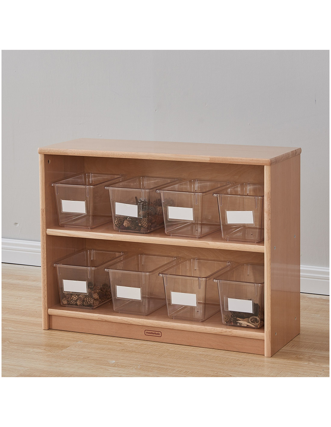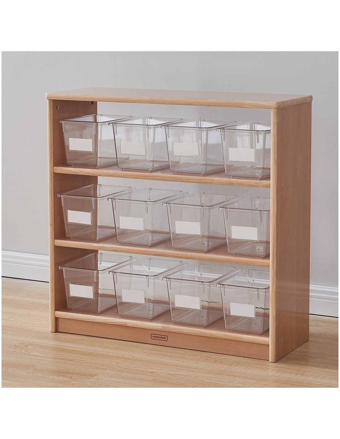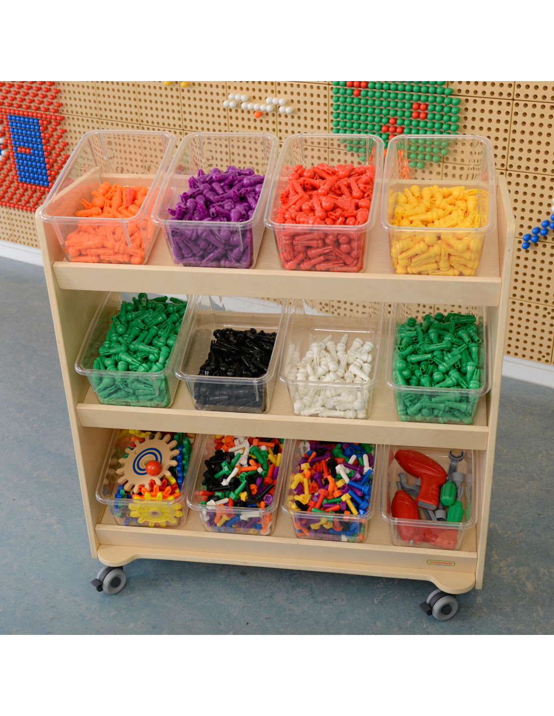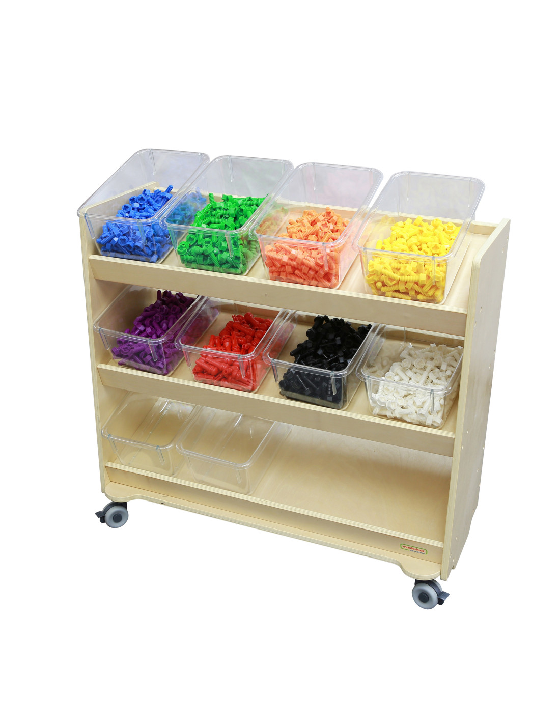 Pojemniki przystosowane są do użytkowanie w połączeniu ze specjalnym regałem (ME13095) Masterkidz, która pozwala na umieszczenie wszystkich 12 pojemników na przeznaczonych do tego półkach. Tym sposobem dziecko ma wszystkie akcesoria w zasięgu ręki, a przenoszenie zabawy w inne miejsca jest lekkie i łatwe.