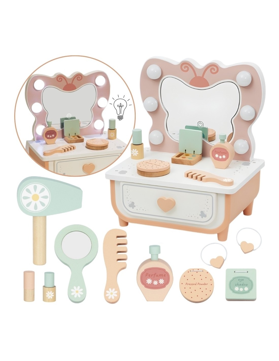 Zaproś swoją córeczkę do świata pielęgnacji i piękna z drewnianą toaletką marki Tooky Toy, która łączy styl, bezpieczeństwo i niekończące się możliwości zabawy. Zestaw z oświetlonym lustrem, drewnianymi kosmetykami i dodatkami przenosi dzieci do świata makijażu i pielęgnacji w najsłodszy możliwy sposób. Elegancka kolorystyka w pastelowych odcieniach tworzy otoczenie zarówno inspirujące do zabawy, jak i komponujące się z każdym pokojem.
