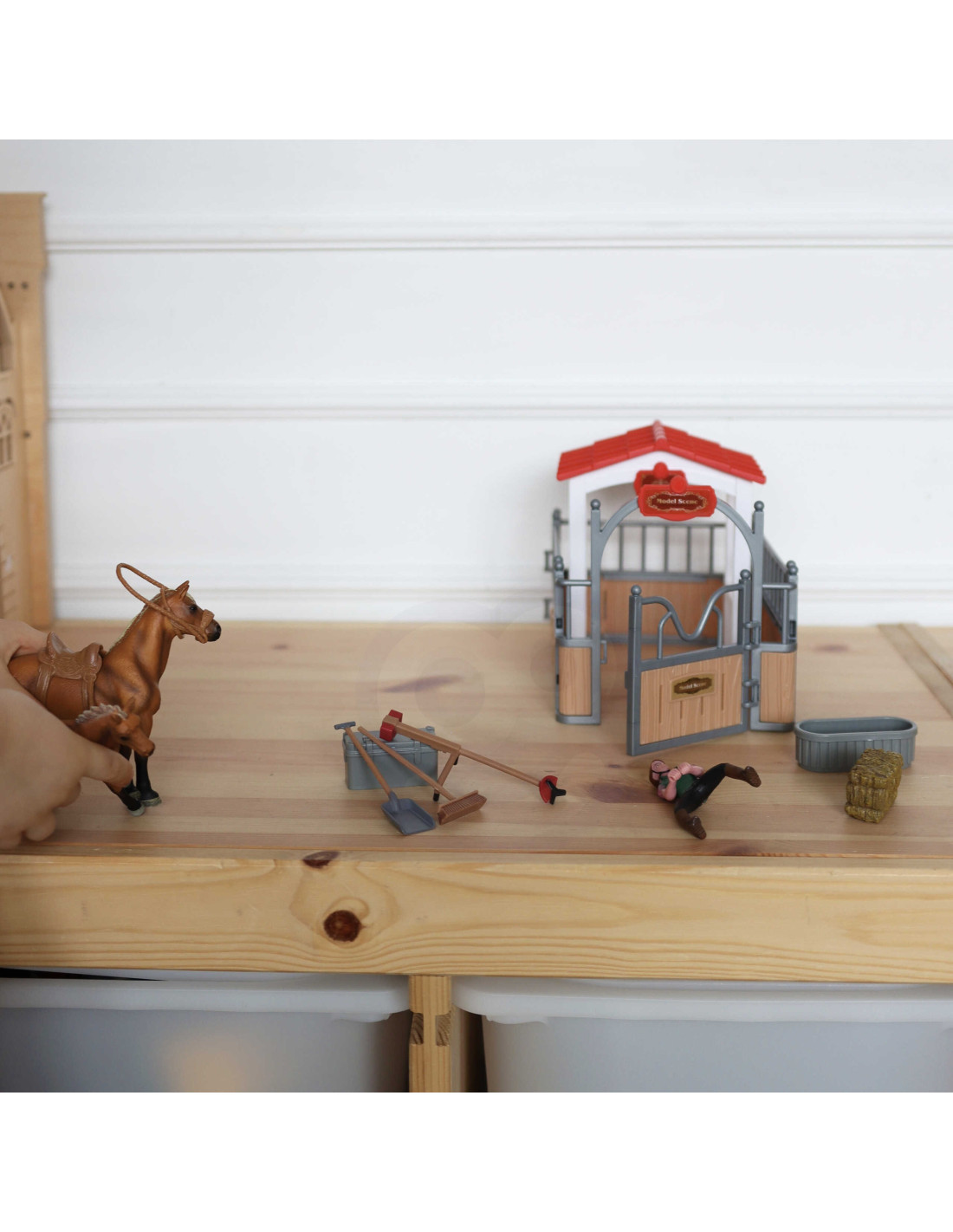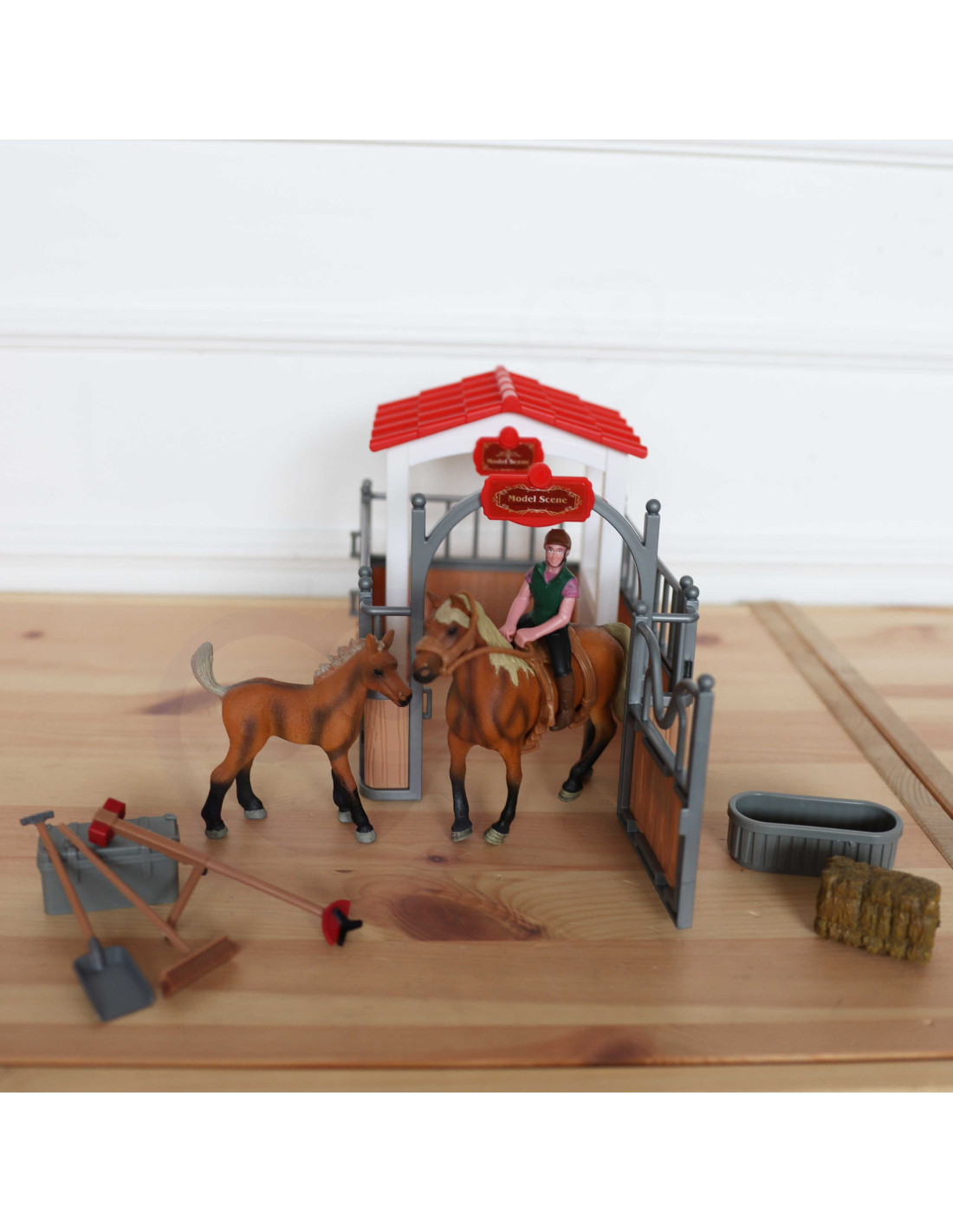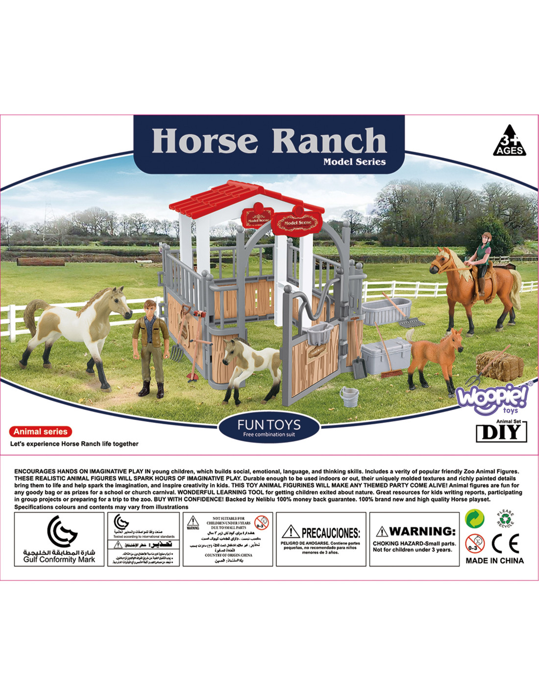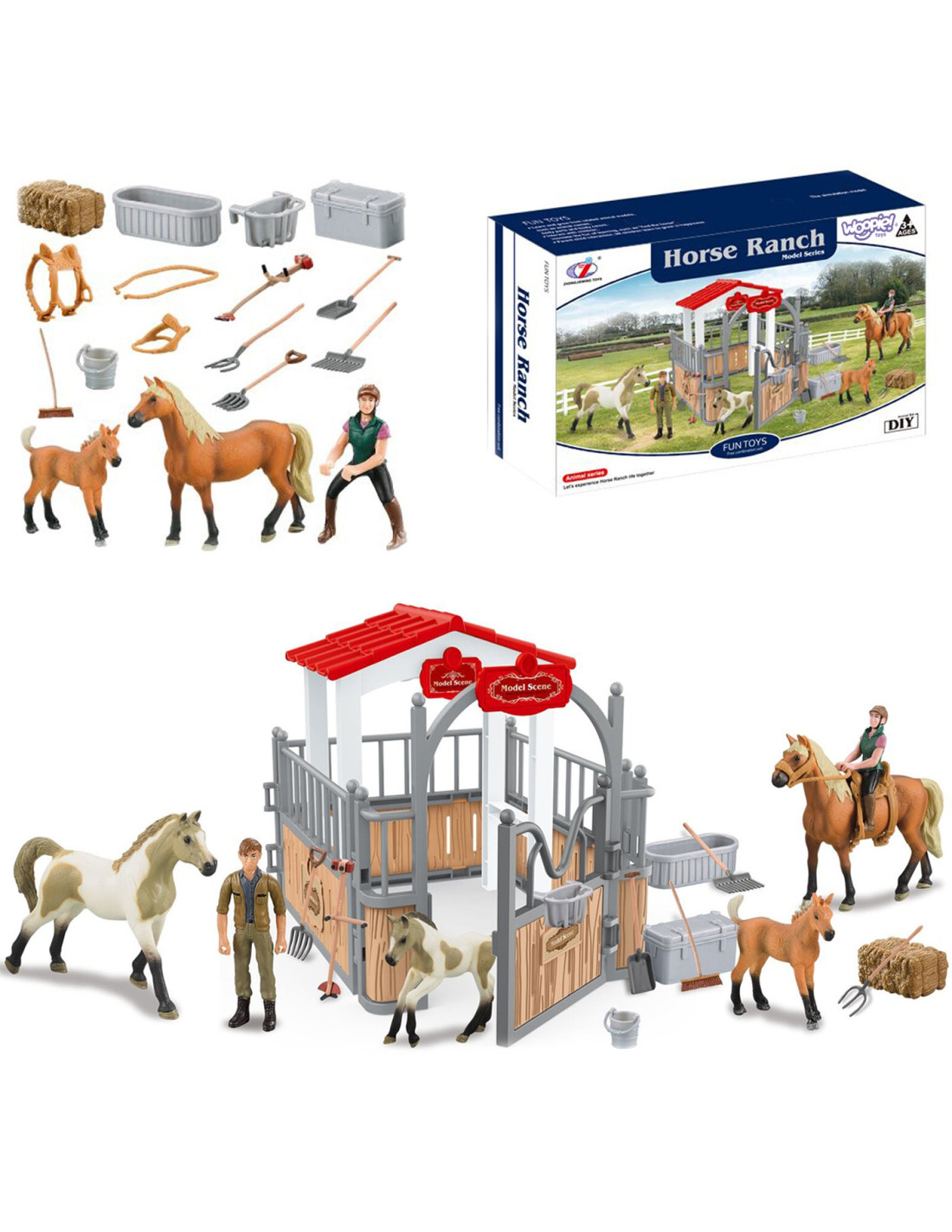 Zestaw Stajnia od marki WOOPIE to idealna zabawka dla miłośnika wiejskiego życia. W zestawie oprócz super stajni znajdują się 2 figurki koni, dżokejka, sianko i różnego rodzaju akcesoria. Stajnia ma klasyczny wygląd i jest doskonale odwzorowane, a same elementy są bardzo trwale wykonane. Dzięki zabawie w stajnie koni maluch poszerzy zakres swojej wyobraźni i kreatywności.