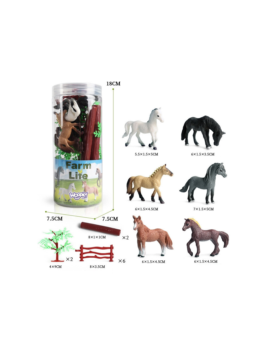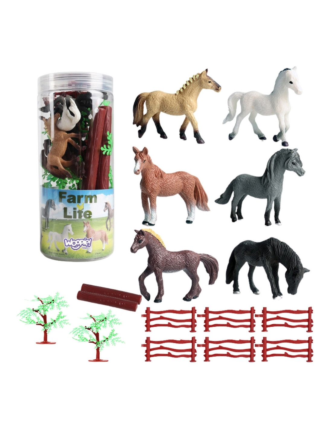 Zestaw Figurek od marki WOOPIE to idealny zestaw dla każdego fana zwierząt. W zestawie znajduje się 6 koni oraz 2 szt. drzew, 6 szt. zagrody i 2 szt. drewnianej belki. Realistycznie wyglądające figurki powiększą zbiory małego kolekcjonera, spełnią funkcję edukacyjną oraz zapewnią dobrą zabawę dzięki której maluch poszerzy zakres swojej wyobraźni i kreatywności.