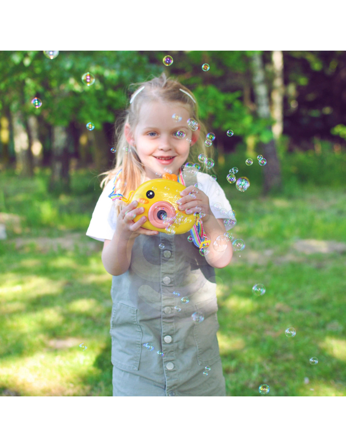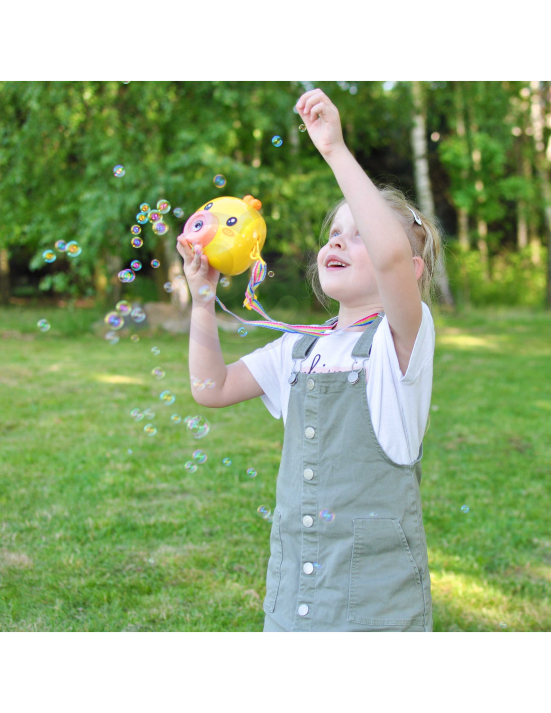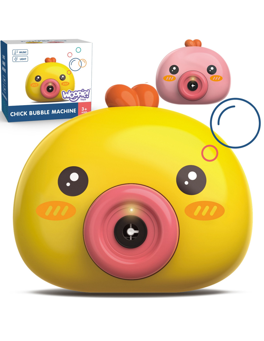 Maszyna do robienia baniek w kształcie kurczaczka marki Woopie to świetna zabawka dla dzieci. Kurczaczek podczas puszczania baniek gra przyjemną dla ucha melodyjkę, która dodatkowo umila zabawę. Wypuszczone bąbelki wystrzeliwane są nie tylko z dużą częstotliwością, ale dodatkowo zainstalowany wiatraczek wydmuchuje je jeszcze dalej. Znajdziemy również pojemniczek na płyn na bańki oraz smycz, aby zawiesić zabawkę na szyi.