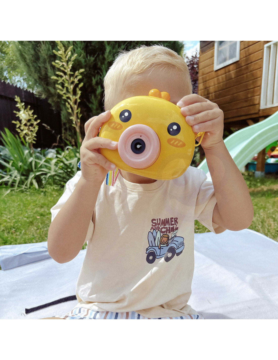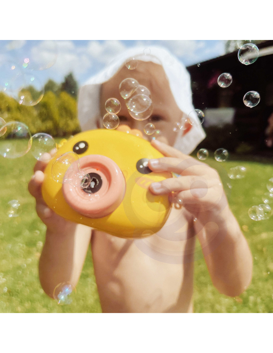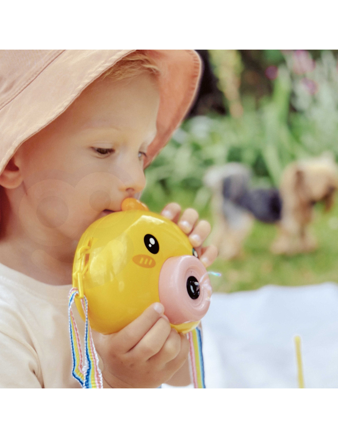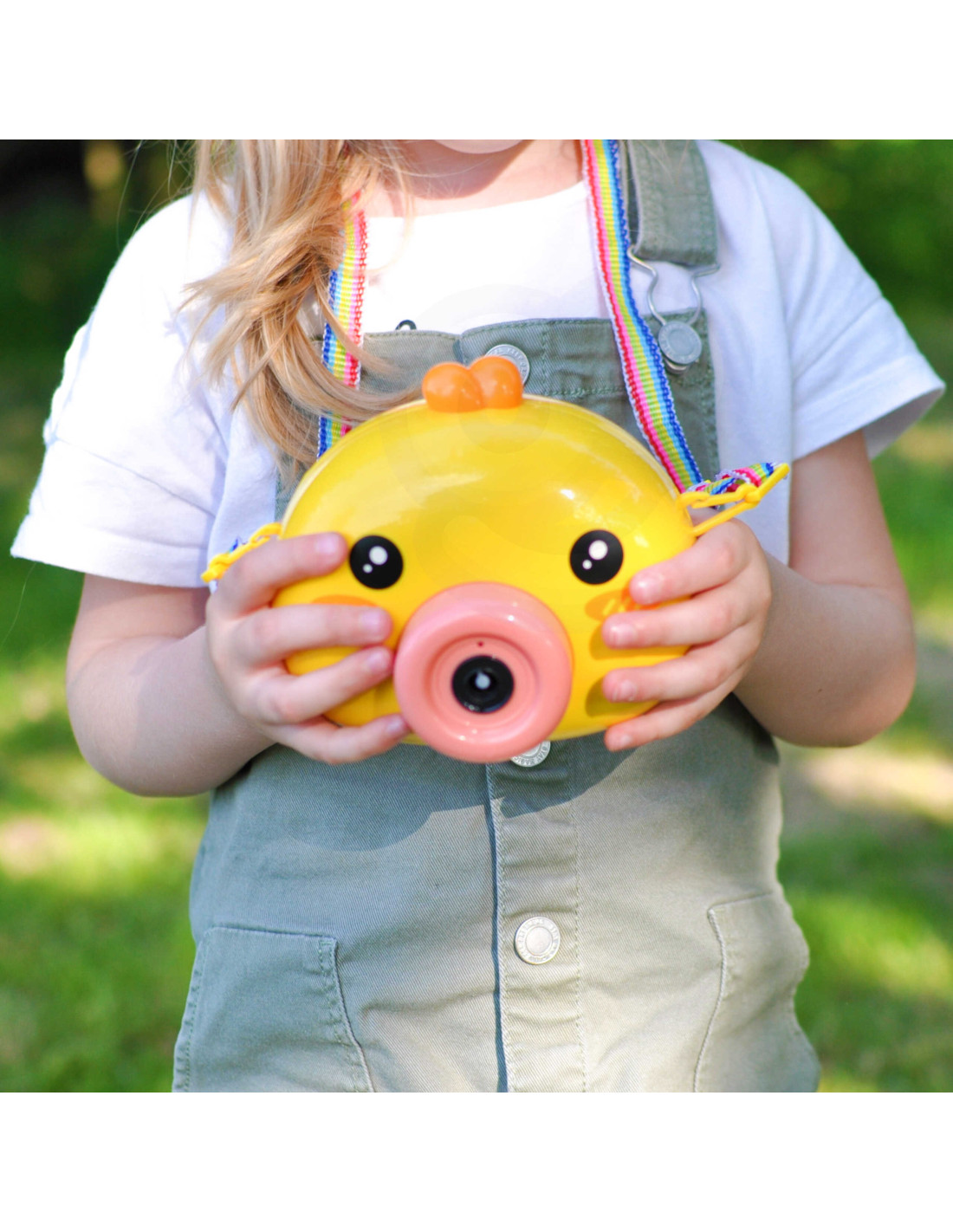 Maszyna do robienia baniek w kształcie kurczaczka marki Woopie to świetna zabawka dla dzieci. Kurczaczek podczas puszczania baniek gra przyjemną dla ucha melodyjkę, która dodatkowo umila zabawę. Wypuszczone bąbelki wystrzeliwane są nie tylko z dużą częstotliwością, ale dodatkowo zainstalowany wiatraczek wydmuchuje je jeszcze dalej. Znajdziemy również pojemniczek na płyn na bańki oraz smycz, aby zawiesić zabawkę na szyi.