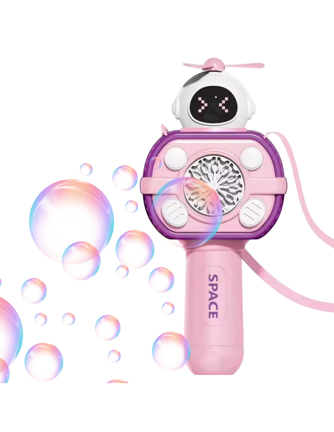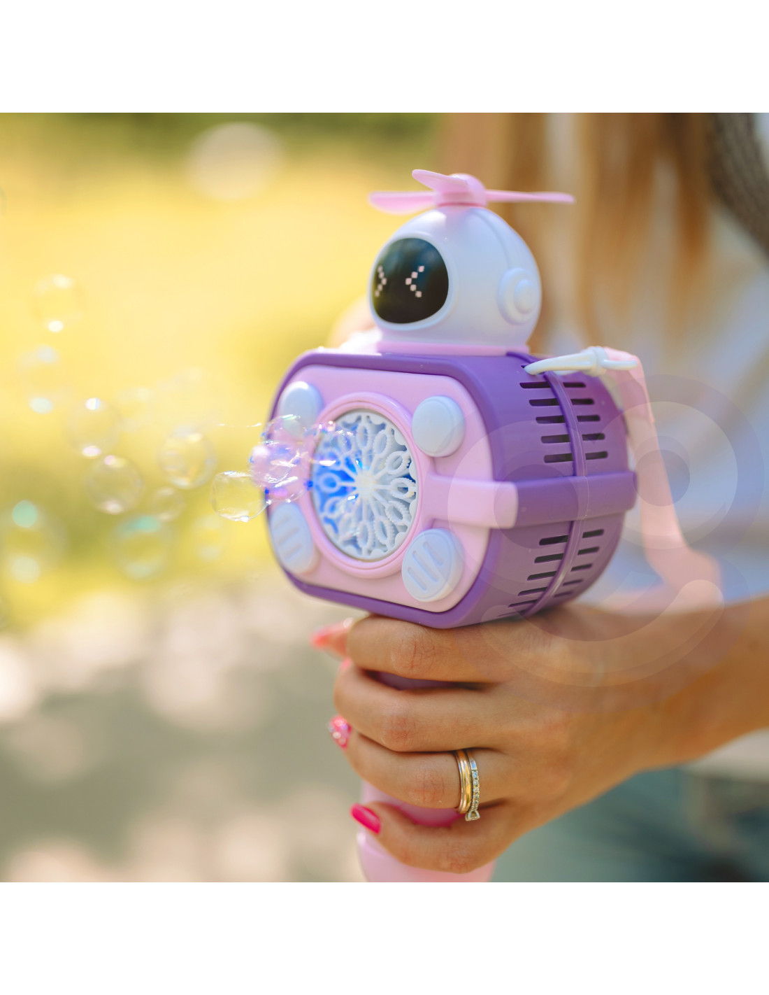 Maszyna do robienia baniek w kształcie astronauty marki WOOPIE to świetna zabawka dla dzieci. Wypuszczone bąbelki wystrzeliwane są nie tylko z dużą częstotliwością, ale dodatkowo zainstalowany wiatraczek wydmuchuje je jeszcze dalej. Zabawkę możemy włączyć wciskając przycisk i automatycznie maszyna będzie wypuszczać bańki. Zabawka posiada smycz którą dziecko może sobie zawiesić na szyje, spacerować i wypuszczać bańki bez wymogu wciskania jakiegokolwiek przycisku. Astronauta posiada efekty świetlne a dodatkowo w zestawie znajdziemy pojemniczek na płyn na bańki który przykręcamy w miejsce uchwytu a później zakładamy na to uchwyt. Zabawka idealnie sprawdzi się podczas zabawy na dworze oraz w domu.