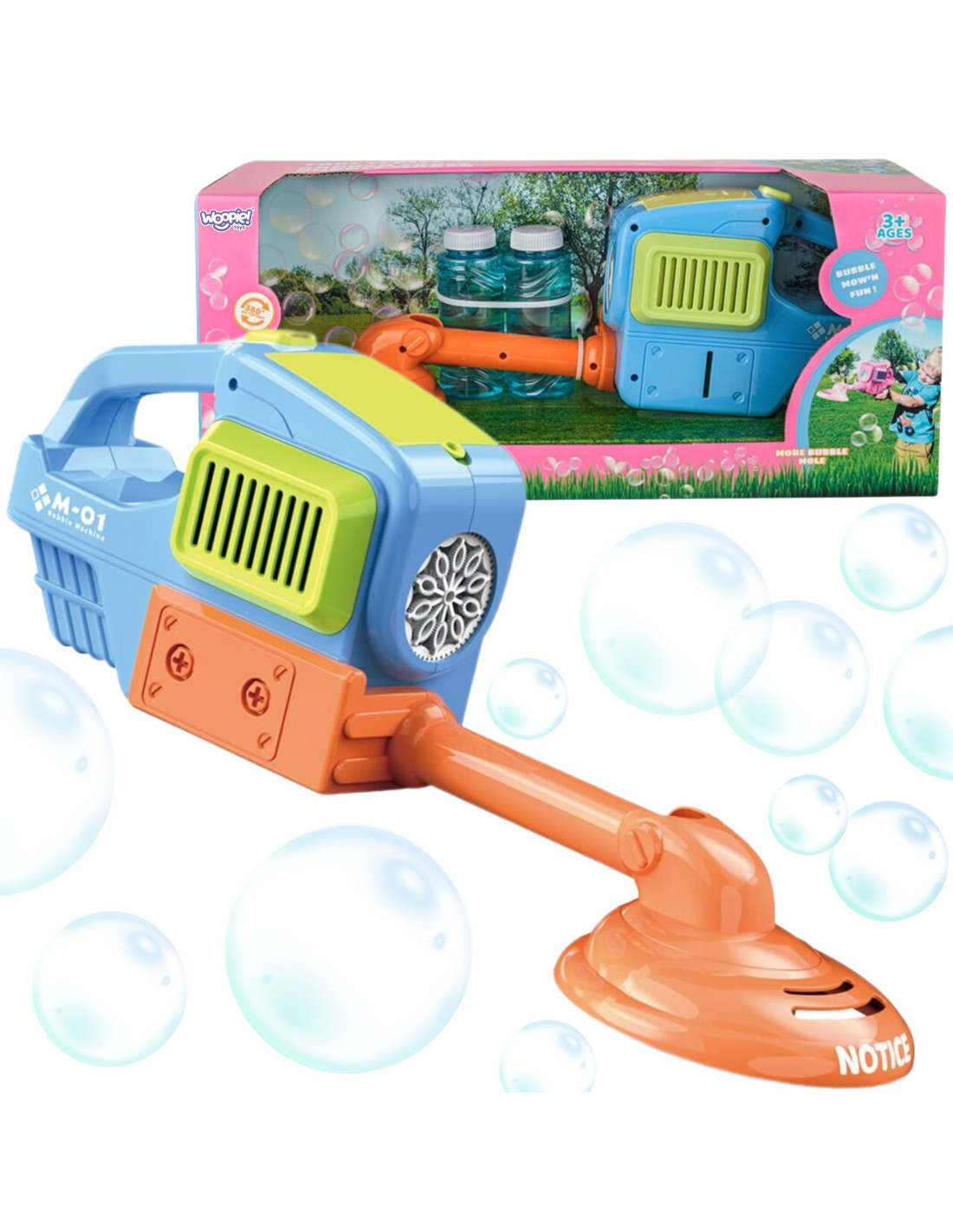 Pistolet do Robienia Baniek Mydlanych - Kosiarka od marki WOOPIE to niezwykły gadżet, który przeniesie zabawę na zupełnie nowy poziom. To nie tylko zabawka, ale prawdziwa atrakcja, która sprawdzi się na każdej imprezie, w ogrodzie czy podczas zwykłego popołudnia spędzonego na świeżym powietrzu. Dzięki swojej innowacyjnej konstrukcji i wyjątkowym efektom wizualnym, z pewnością stanie się ulubionym gadżetem zarówno dzieci, jak i dorosłych, dostarczając mnóstwo radości i niezapomnianych chwil. Nakładka kosiarki jest zdejmowana, co oznacza, że w mgnieniu oka można przekształcić ją w stylową maszynę do baniek. Prawdziwa magia zaczyna się, gdy włączamy pistolet. Otwór, z którego wylatują bańki także obraca się o 360 stopni. Ten ruch tworzy niesamowity efekt, potęgując wizualne doznania i sprawiając, że bańki unoszą się w powietrzu w najbardziej nieoczekiwane strony.