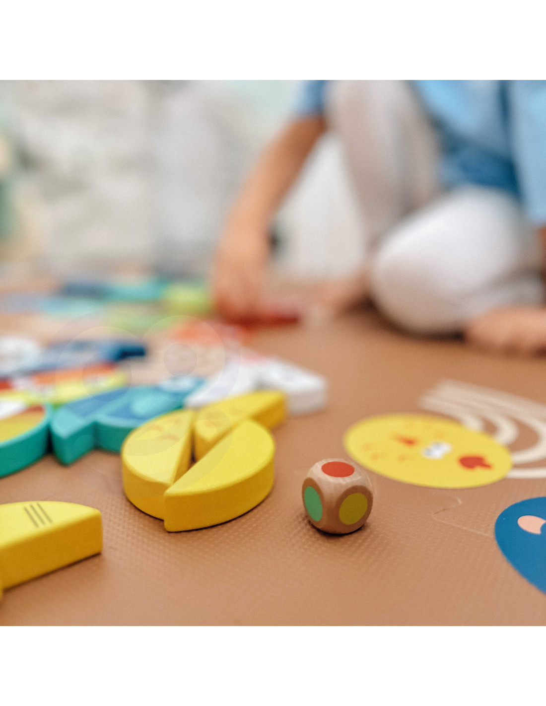 - - w zestawie: 45 klocków, 15 kart oraz kostka do gry,