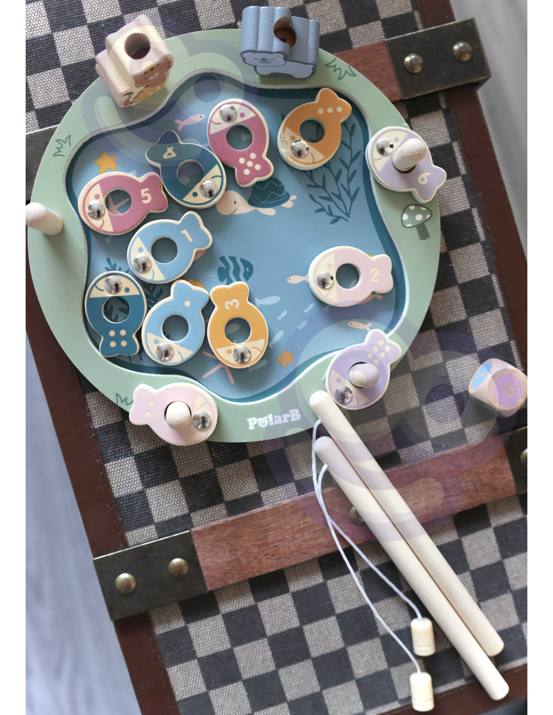 - - zabawka zawiera: drewnianą podstawkę do gry, 2 wędki, kostkę oraz 12 rybek,