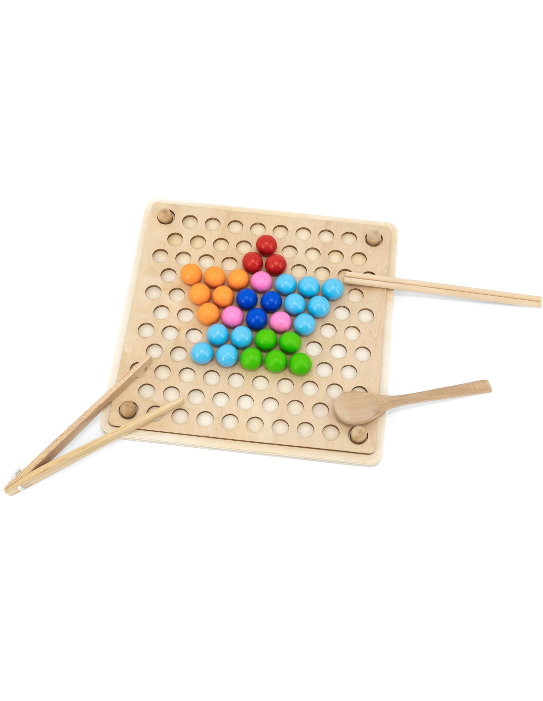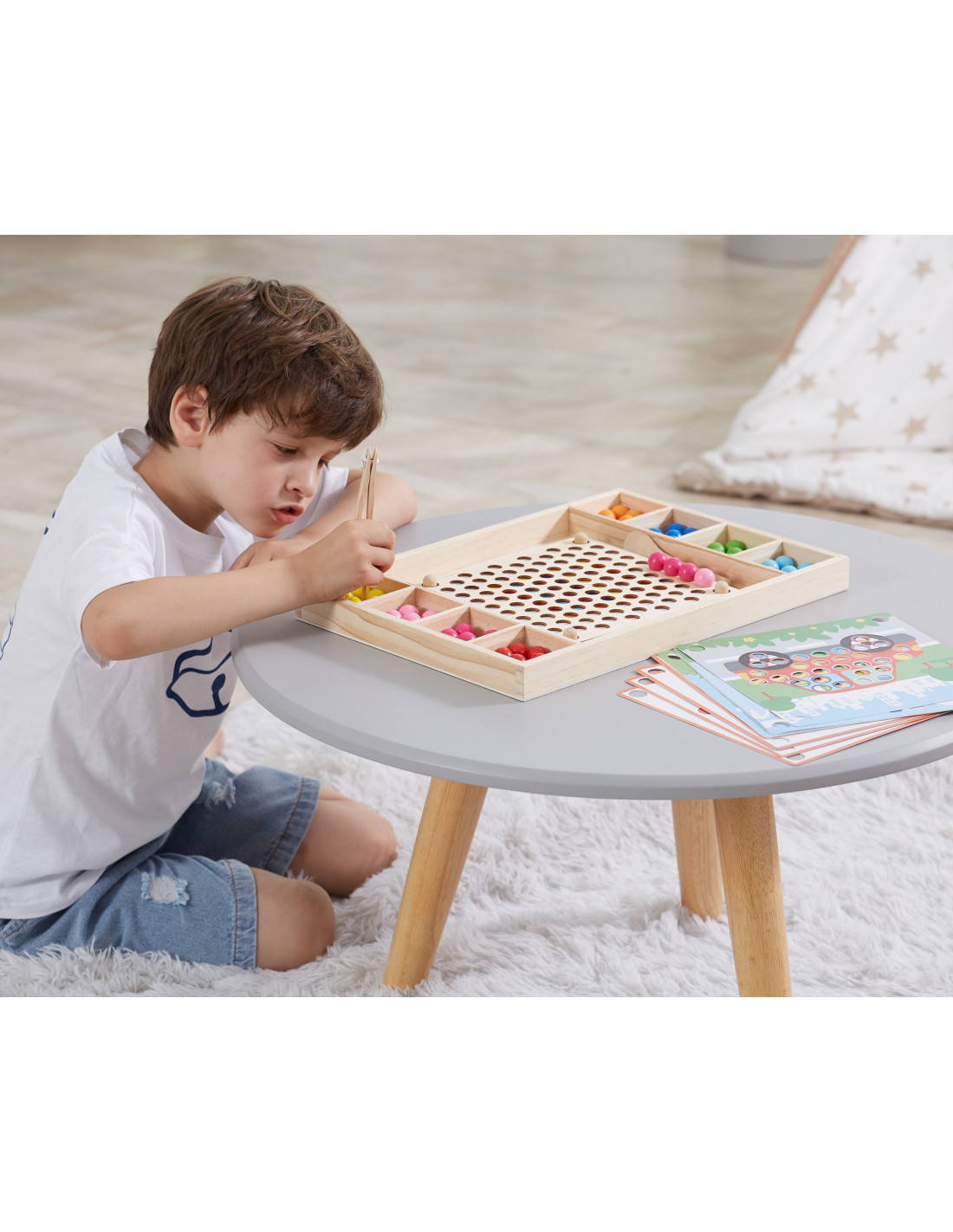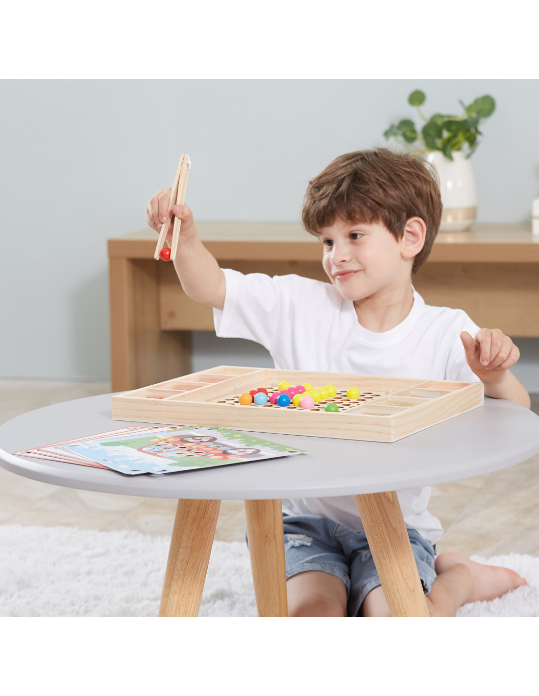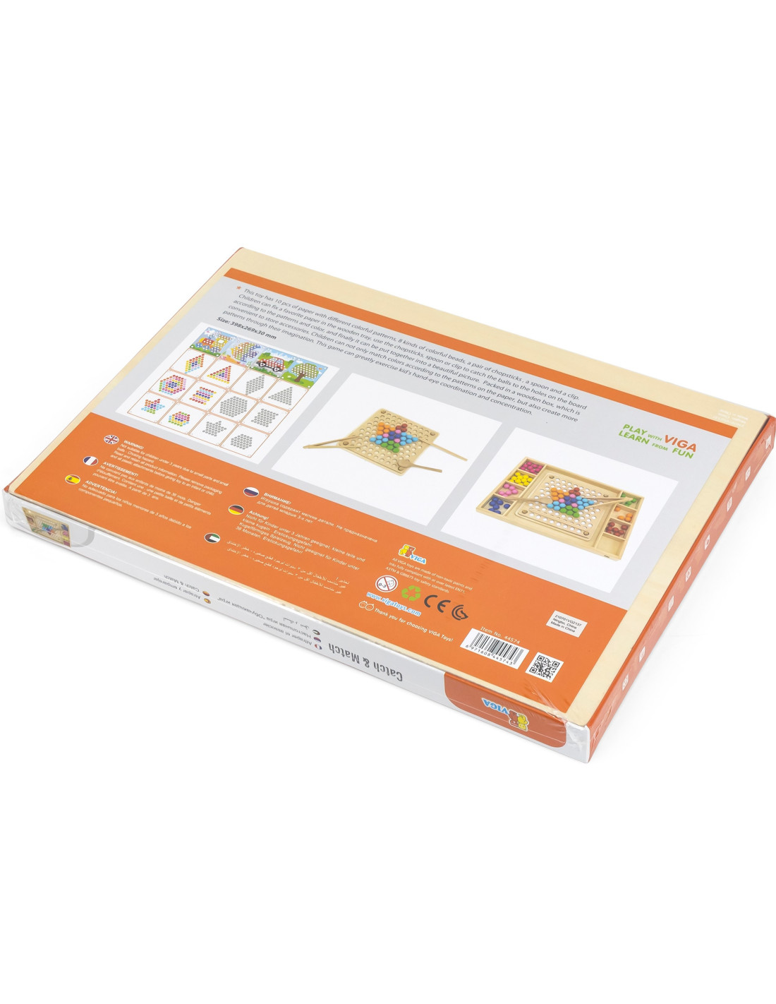 Drewniana gra "Złap i dopasuj" marki Viga. Zadanie dzieci jest nie tylko dopasowywać kolory według wzoru na papierze, ale także tworzyć więcej wzorów dzięki swojej wyobraźni. Ta gra może ćwiczyć koordynację ręka-oko i koncentrację dziecka. Dzieci mogą przymocować ulubiony papier do drewnianej tacy. Za pomocą pałeczek, łyżki lub spinacza przyczepić kulki do otworów na desce według wzorów i kolorów, a na koniec ułożyć je w piękny obrazek.