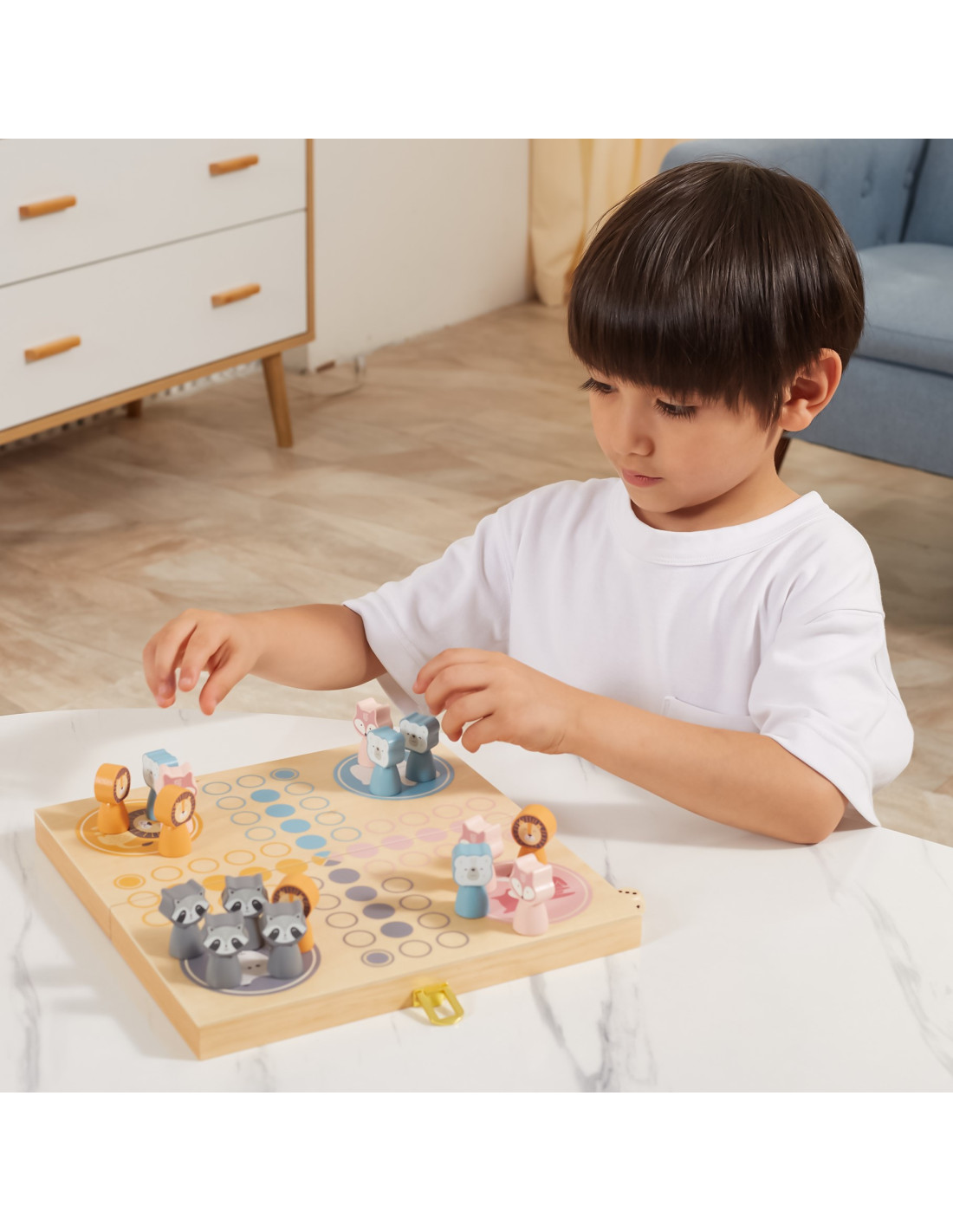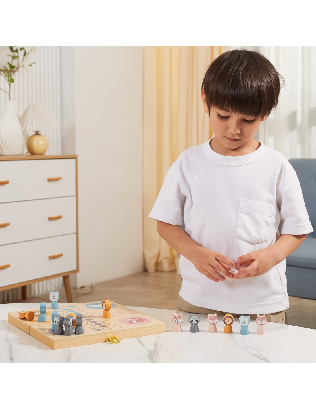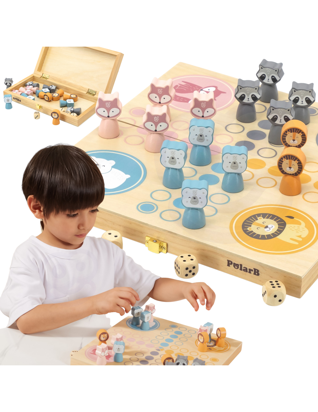 Gra planszowa Chińczyk jest dobrze znana dzieciom i dorosłym na całym świecie. Firma Viga PolarB przygotowała jej zupełnie nową odsłonę, która oczaruje malców. Zestaw zawiera cztery kostki, planszę-pudełko oraz szesnaście pięknie wykonanych, pastelowych figurek.