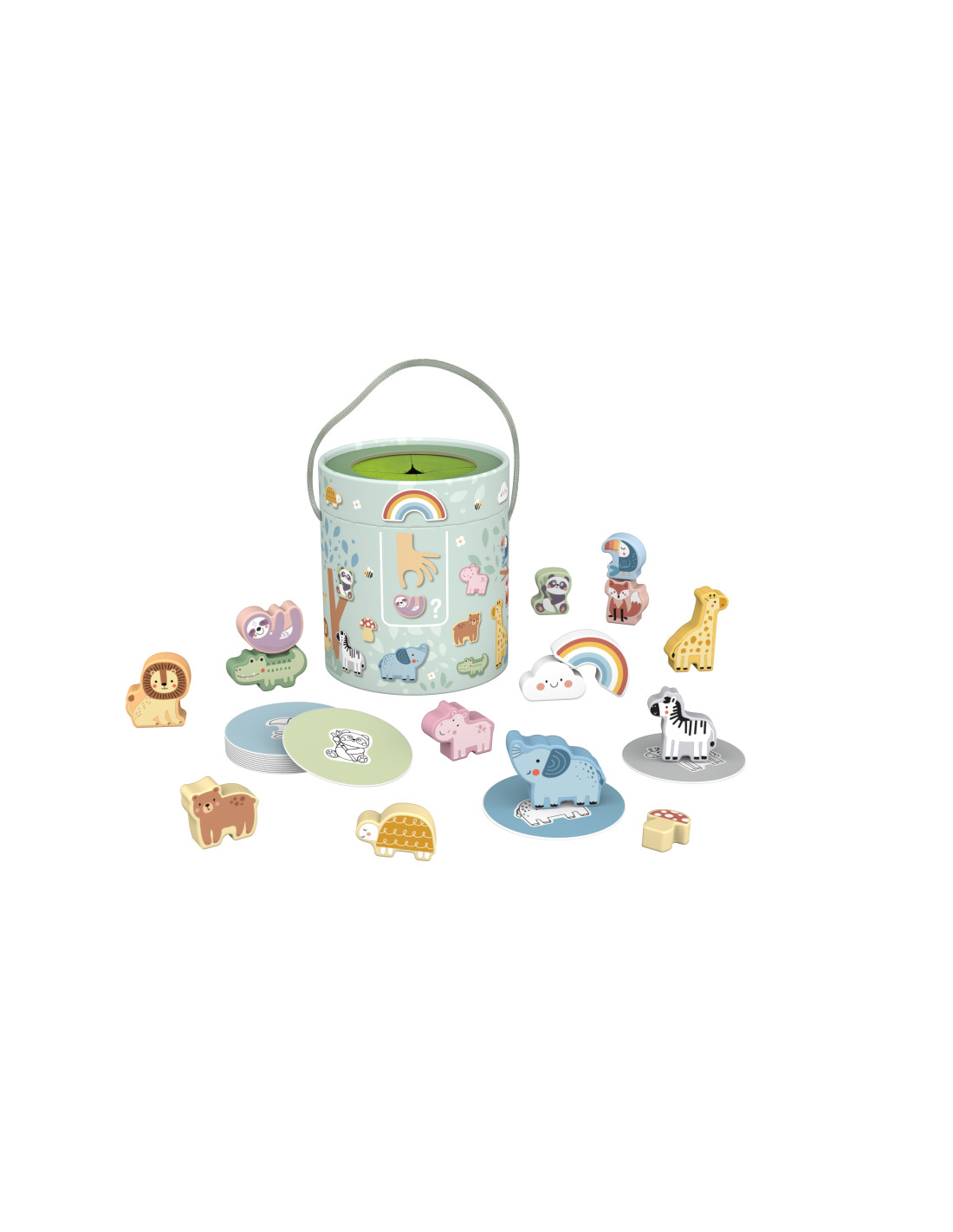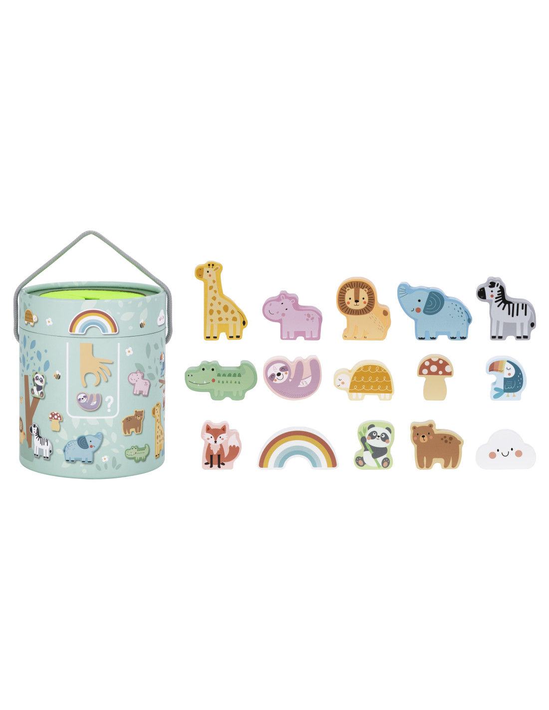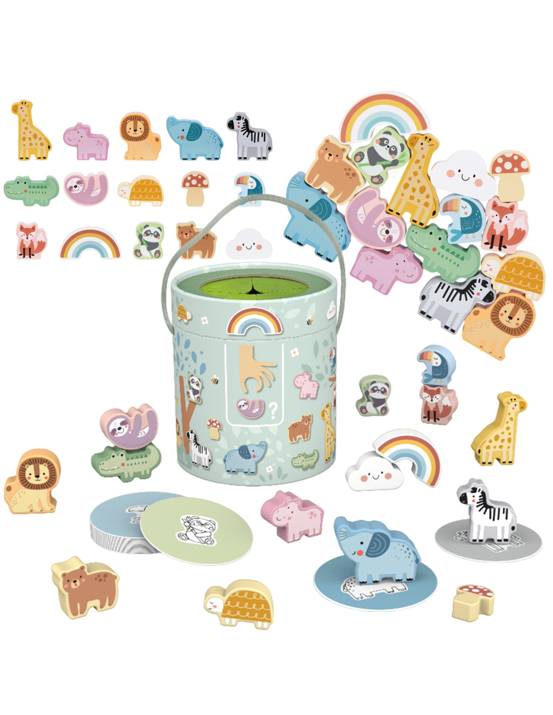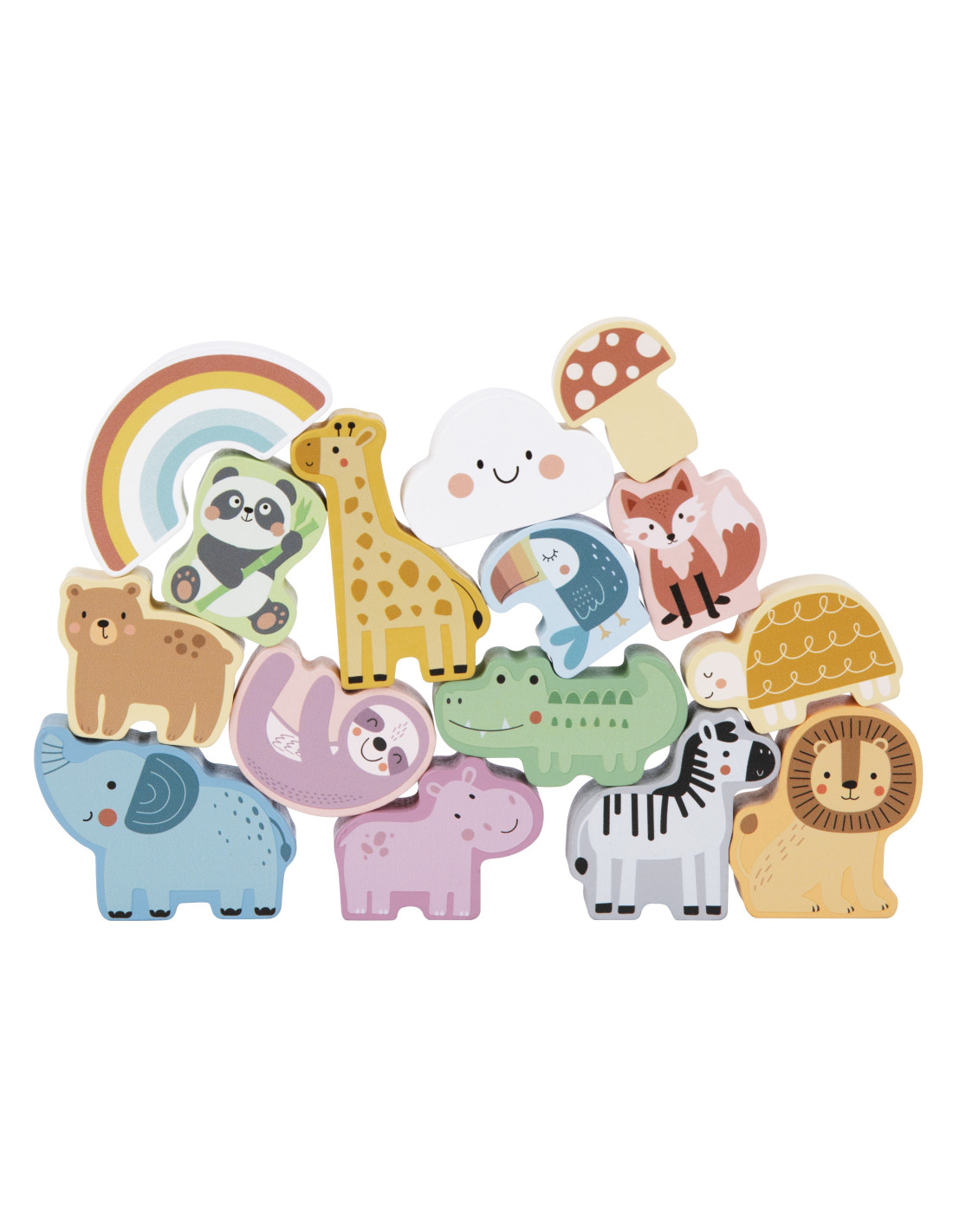 - - 15 drewnianych figurek (zwierzątka, grzybek, tęcza, chmurka)