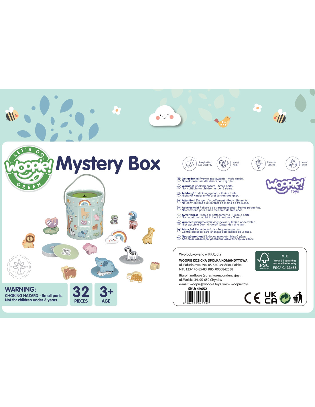 Tajemnicze Pudełko od Woopie to wyjątkowa gra rozwijająca zmysł dotyku, motorykę małą i kreatywność. Gra zawiera 15 drewnianych figurek, takich jak zwierzątka, grzybek, tęcza oraz chmurka, które są ukryte w tajemniczym pudełku. Dzieci, wybierając jedną z kart, sięgają do pudełka i za pomocą dotyku muszą odnaleźć odpowiednią figurę. Ta gra zapewnia mnóstwo frajdy i jest doskonała zarówno do zabawy samodzielnej, jak i w gronie przyjaciół!