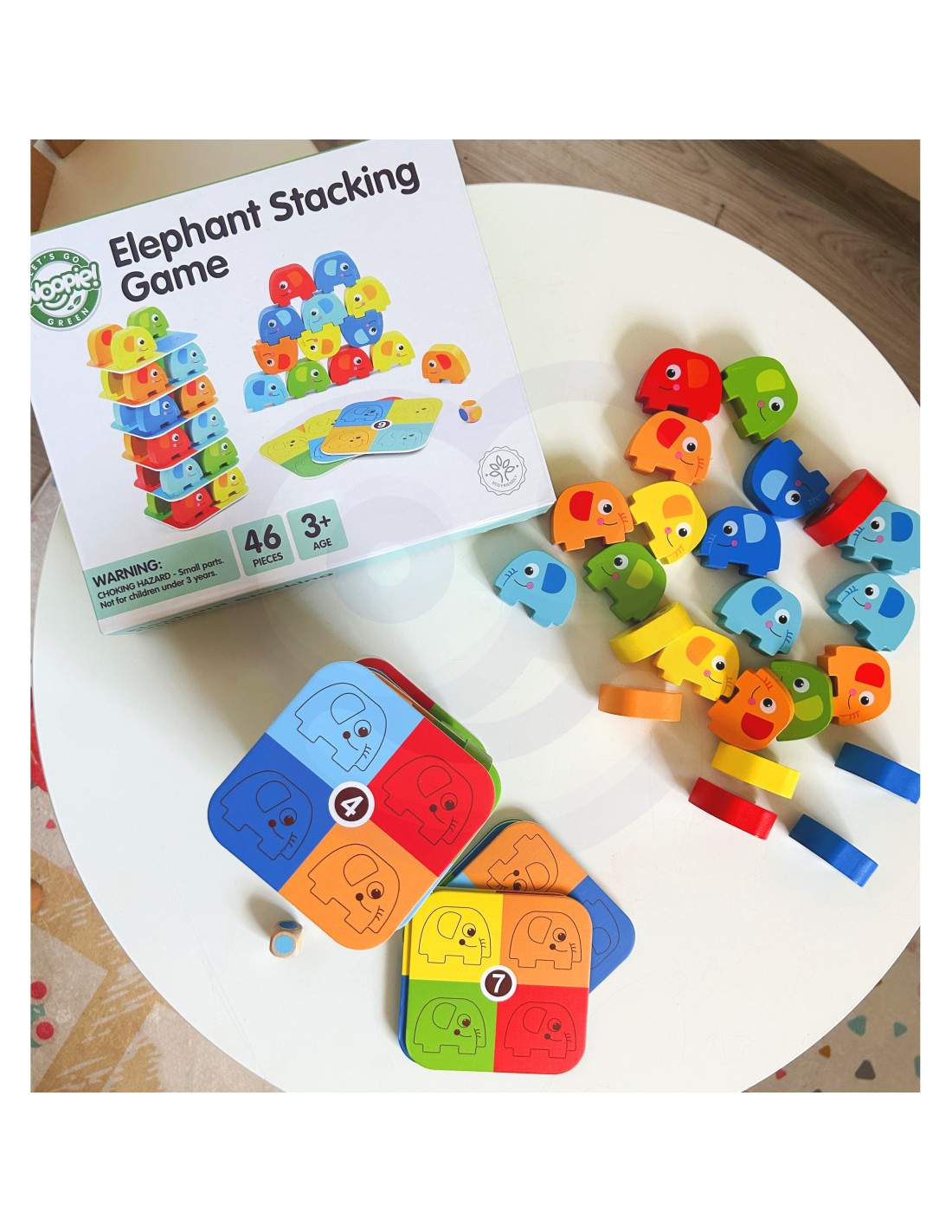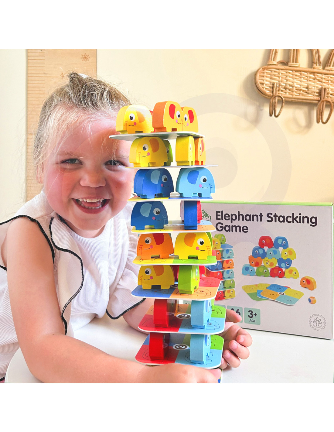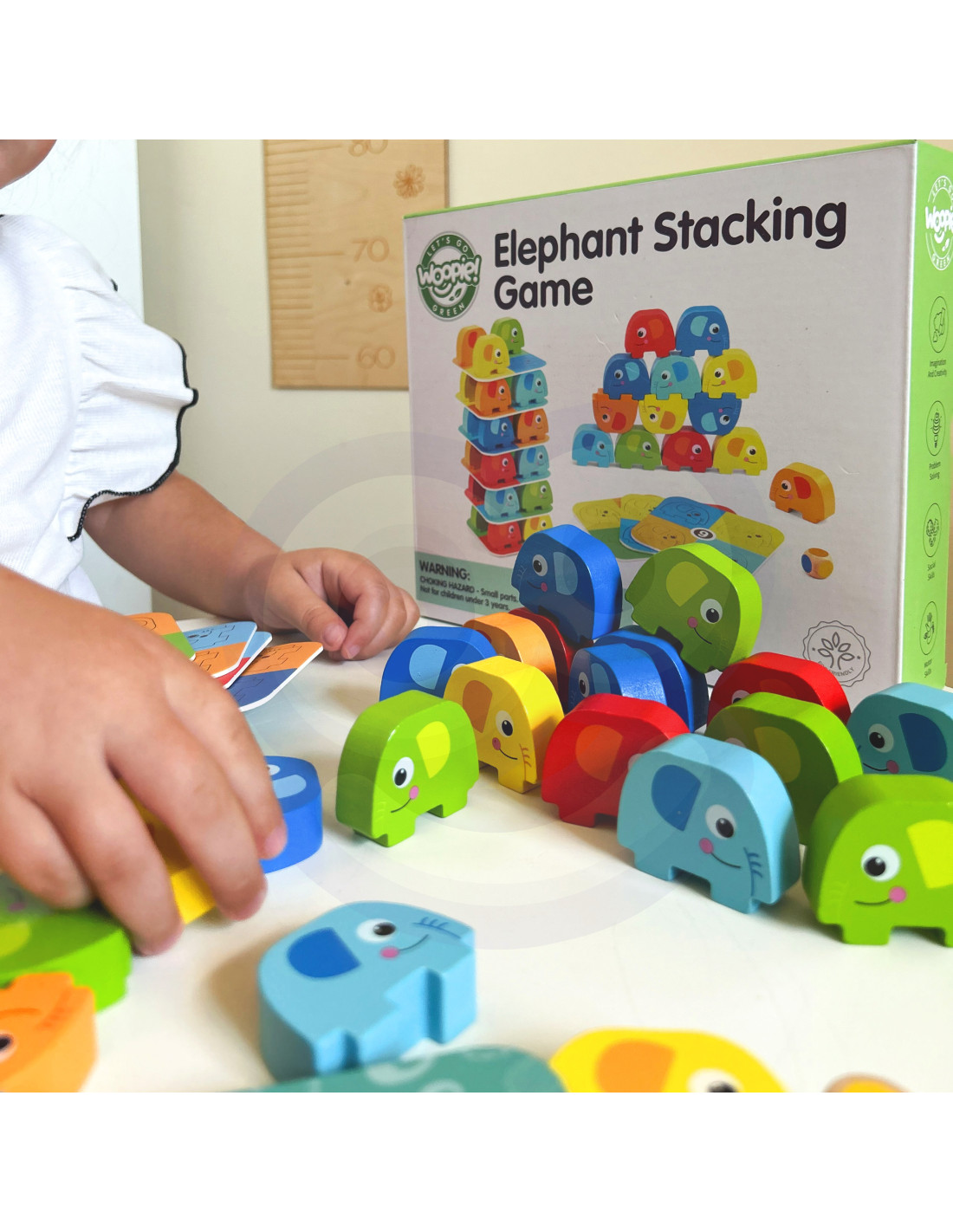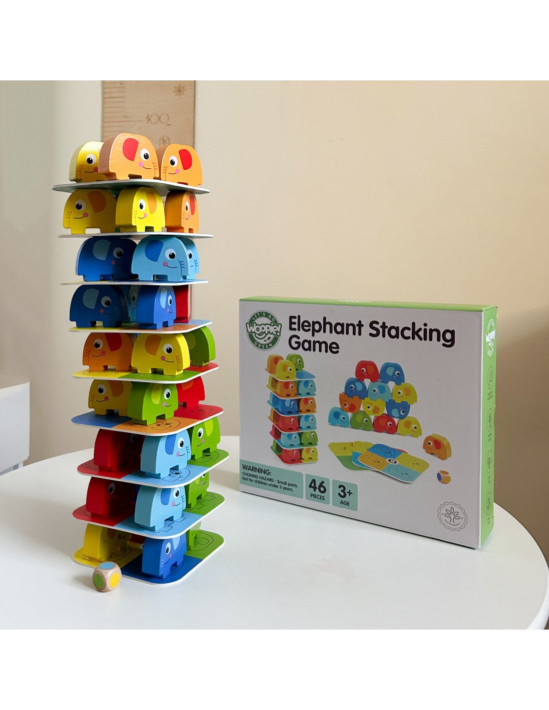 Słonik na Słoniku od marki WOOPIE GREEN to wyjątkowa gra zręcznościowa, która zapewni mnóstwo śmiechu i emocji! Zestaw składa się z 46 kolorowych, drewnianych elementów – w tym kostki i kart – dzięki czemu można bawić się na różne sposoby: układać słonie w wieżę lub rozegrać emocjonującą rundę w stylu Jenga. Wyraziste kolory i uroczy design przyciągają uwagę dzieci, a zaokrąglone kształty sprawiają, że zabawa jest w 100% bezpieczna już od 3 roku życia.