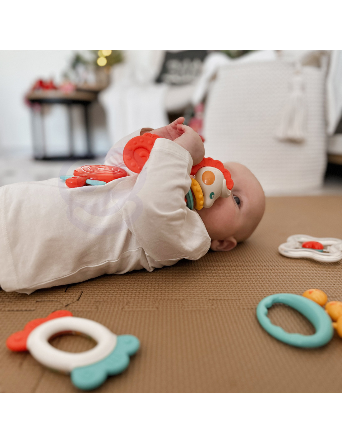 Zestaw Gryzaków-Grzechotek dla dzieci od marki WOOPIE zawiera 5 różnokolorowych elementów, zaprojektowanych tak, aby pomagać dziecku podczas ząbkowania. Gryzaki nie tylko przynoszą ulgę obolałym dziąsłom, ale także stymulują rozwój wzroku i słuchu. Dodatkowo klęsły i wypukły kształt oraz różne tekstury stymulują rozwój zmysłu dotyku.