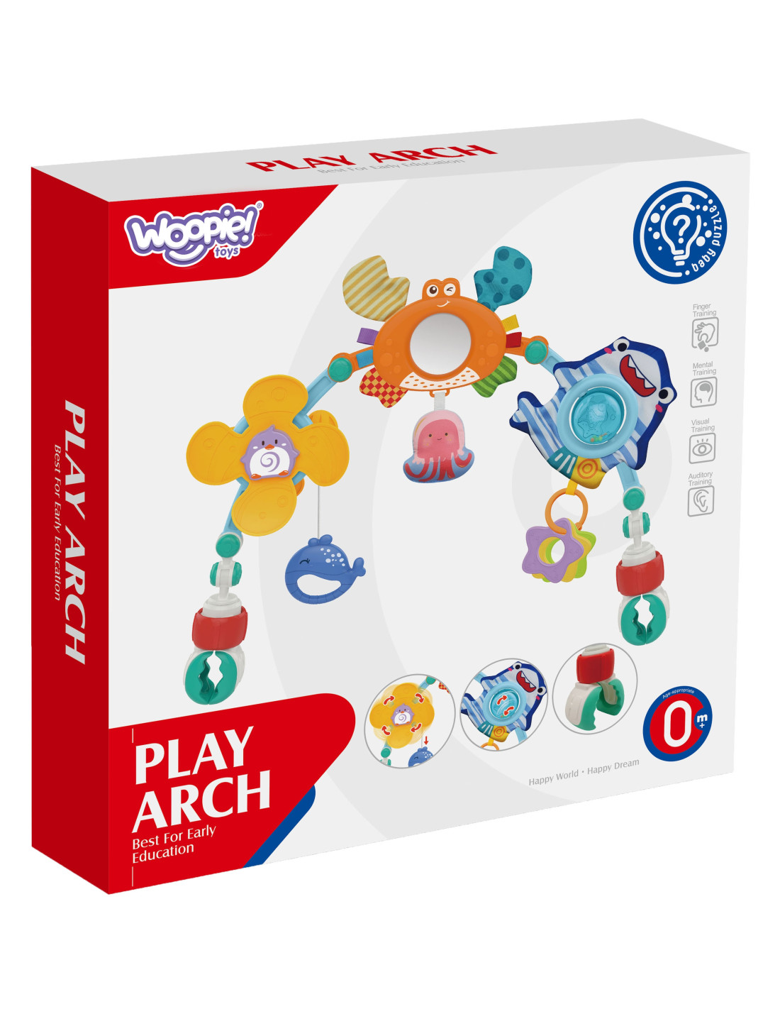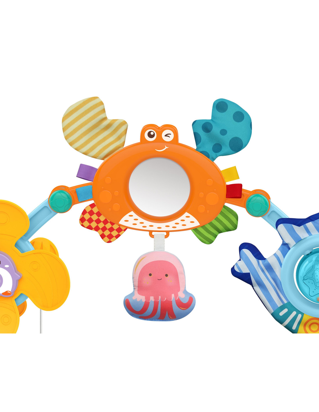 Pałąk Łuk z Zabawkami od marki WOOPIE to uniwersalna zabawka, która doda uroku i rozrywki każdemu wózkowi, fotelikowi czy łóżeczku. Jest niezwykle elastyczny, dzięki czemu bez problemu można go zamocować praktycznie wszędzie. Na pałąku znajdują się różne zabawki morskie: wiatraczek z pingwinkiem, krab-lusterko, ośmiorniczka, rekin-grzechotka i delfinek-zawieszka, które reagują na interakcję dziecka, a także zawieszki-gryzaczki w kształcie gwiazdek. Każda z tych zabawek ma inną teksturę i sposób działania, co pobudza zmysł dotyku dziecka i pomaga rozwijać jego zdolności motoryczne.