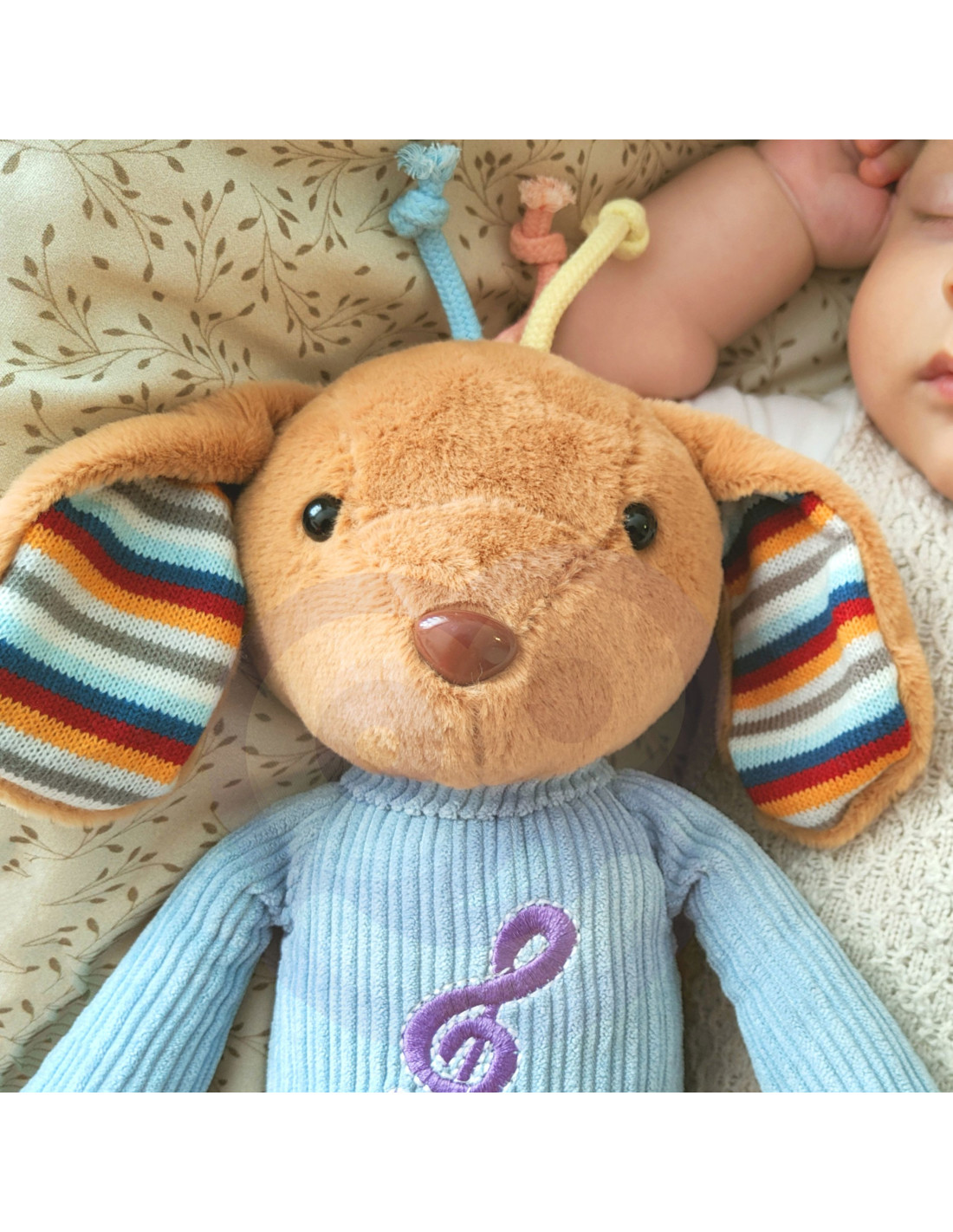 Przytulanka jest wyposażone w trzy strefy sensoryczne - na łapkach i brzuszku, których dotyk zamienia się w muzykę. A jego różowe policzki są oświetlone, tworząc prawdziwą bajeczną atmosferę wokół zabawki. Przytulanka ubrana jest w sweterek pod którym schowane jest miejsce na 3 baterie.Ten miękki w dotyku piesek stanie się przyjacielem dziecka na wiele lat.