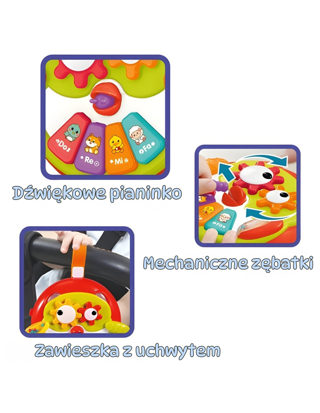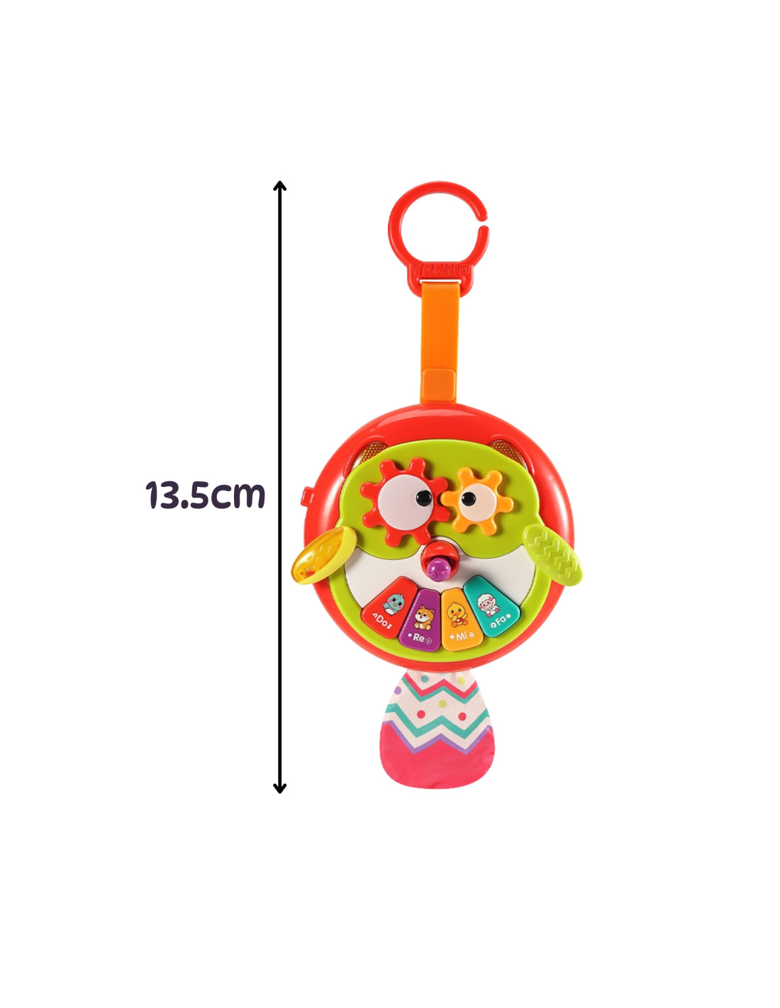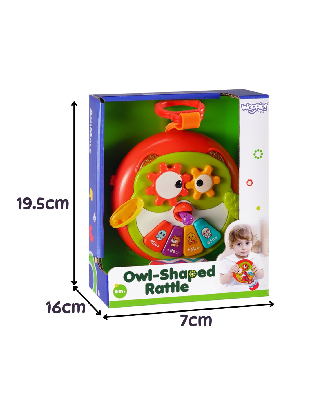 Interaktywna zawieszka w kształcie sowy od marki WOOPIE to urocza i funkcjonalna zabawka dla najmłodszych, która łączy w sobie edukację i zabawę. Kolorowa sówka została zaprojektowana tak, aby przyciągać uwagę dziecka różnorodnymi bodźcami – wzrokowymi, dotykowymi i dźwiękowymi. Skrzydełka sowy są ruchome, dzięki czemu maluch może je poruszać podczas zabawy. Z dzioba wystaje robaczek, który po pociągnięciu aktywuje ruch zębatek w oczach sowy. Na brzuszku sowy znajduje się kolorowe pianinko z oznaczeniami dźwięków (do, re, mi, fa). Po naciśnięciu klawiszy dziecko usłyszy delikatne, przyjazne melodie, które wspomagają rozwój słuchu i uczą rozróżniania tonów. Ogonek sówki wykonano z szeleszczącego materiału, a zawieszka jest wyposażona w uchwyt, który umożliwia jej przypięcie do wózka, łóżeczka czy fotelika.