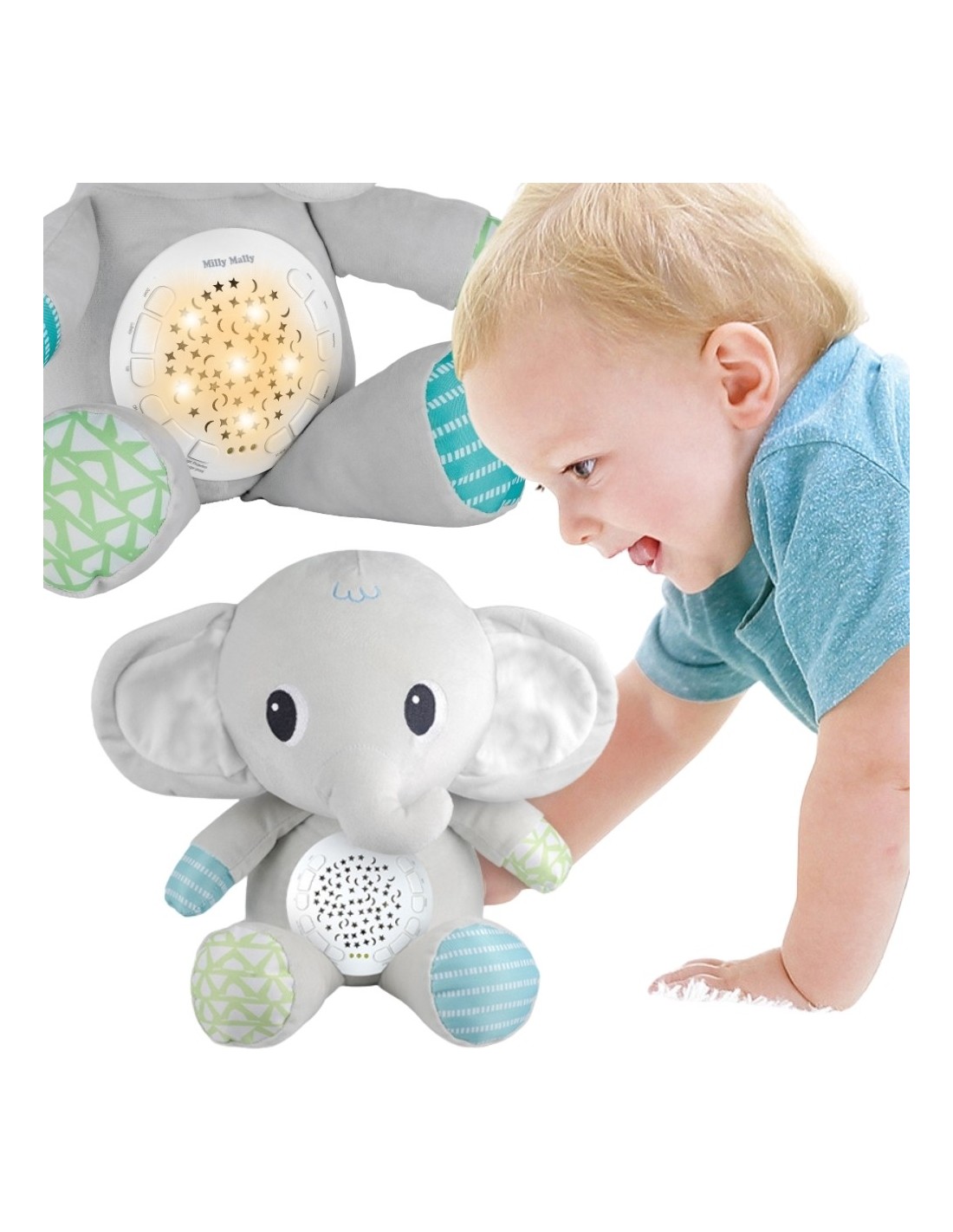 Mięciutki Słonik z Projektorem od FUNMUCH to idealny przyjaciel dla każdego noworodka i niemowlęcia. Ta urocza przytulanka łączy w sobie funkcje projektora gwiazd i księżyców oraz pozytywki z uspokajającymi melodiami. Słonik pomoże ukoić maluszka do snu i stworzyć w pokoju magiczny, relaksujący nastrój. Moduł dźwiękowo-świetlny wbudowany w brzuch słonika oferuje aż 12 melodii, w tym delikatne kołysanki i uspokajający biały szum. Posiada także funkcję timera, umożliwiającą automatyczne wyłączenie po 30, 60 lub 90 minutach. Przytulanka wykonana jest z miękkiego, bezpiecznego pluszu, idealnego do tulenia i bezpiecznego od urodzenia.