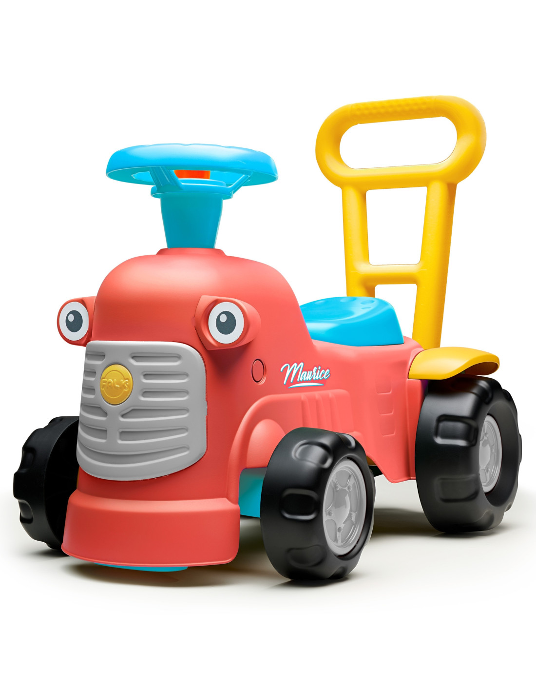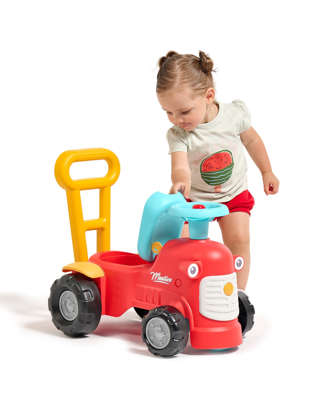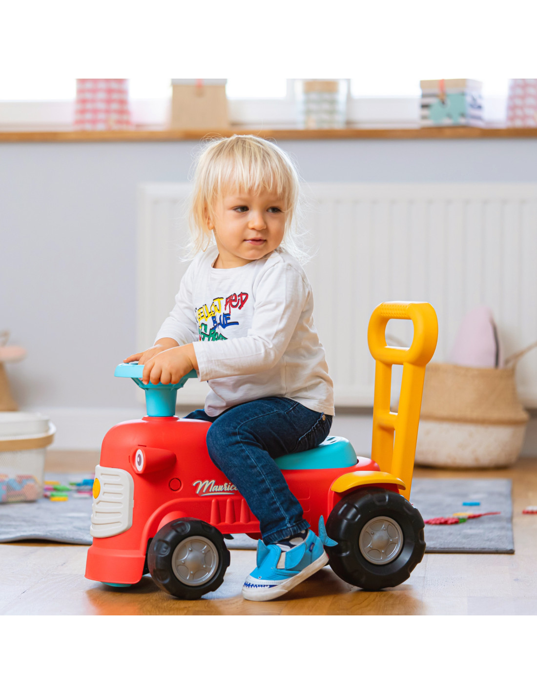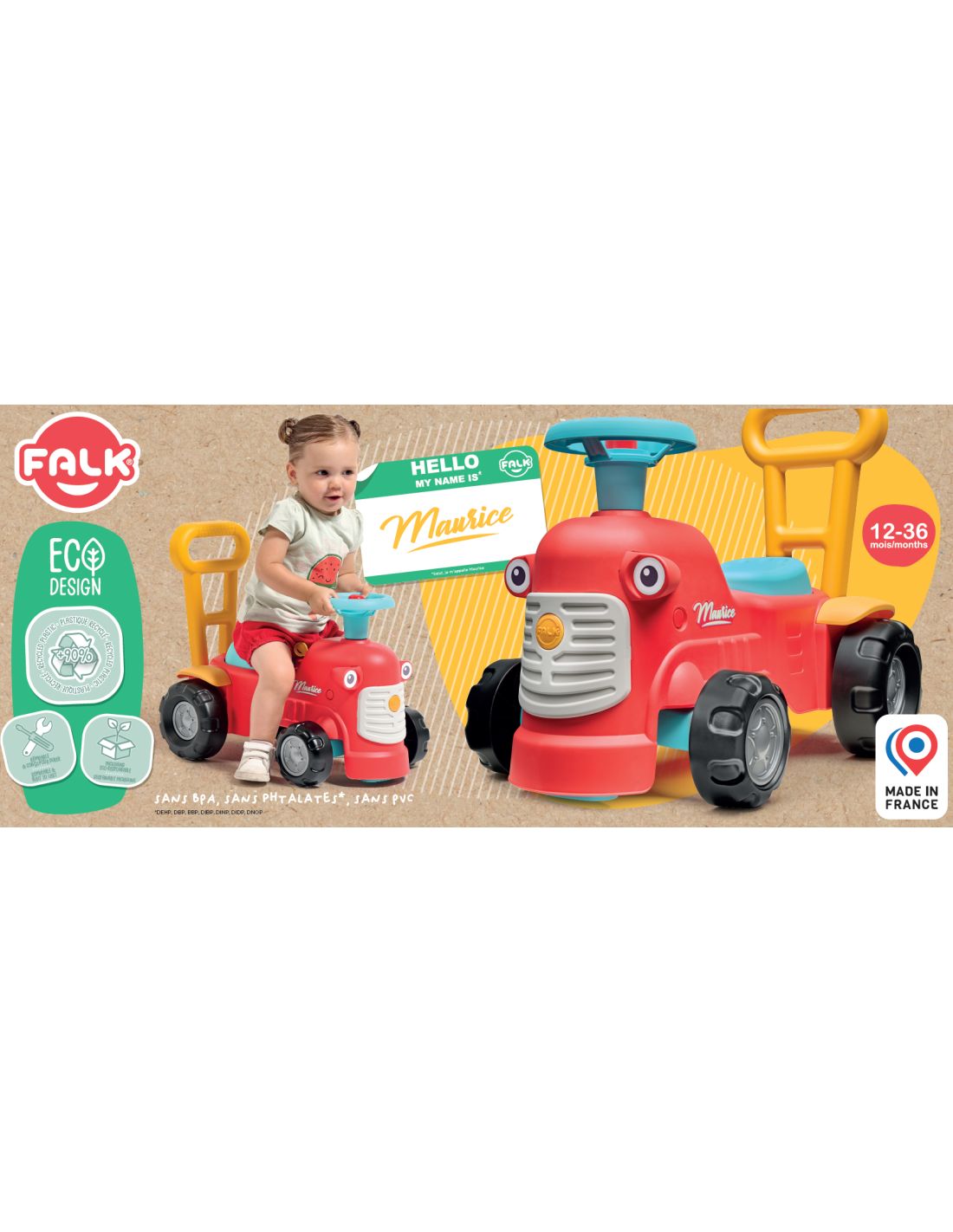 Maurice to uroczy traktorek francuskiej marki Falk, który będzie towarzyszem pierwszych kroków Twojego dziecka. Jasne kolory i zaokrąglone kształty zachwycą każdego malucha. Uruchamianie traktora za pomocą małego pokrętła dźwiękowego oraz dźwięk z klaksonu umieszczonego na kierownicy to wspaniała pierwsza nauka, która pobudzi umiejętności motoryczne i słuch Twojego dziecka. Jeżdżąc na jeździku, bawiąc się kierownicą z klaksonem i skrętnymi kołami dziecko będzie ćwiczyło koordynację i równowagę. Stojąc z tyłu, może korzystać z ergonomicznego oparcia, aby uczyć się chodzić przez zabawę, bez strachu i całkowicie bezpiecznie. Pod siedzeniem znajduje się niewielki schowek do przechowywania skarbów.