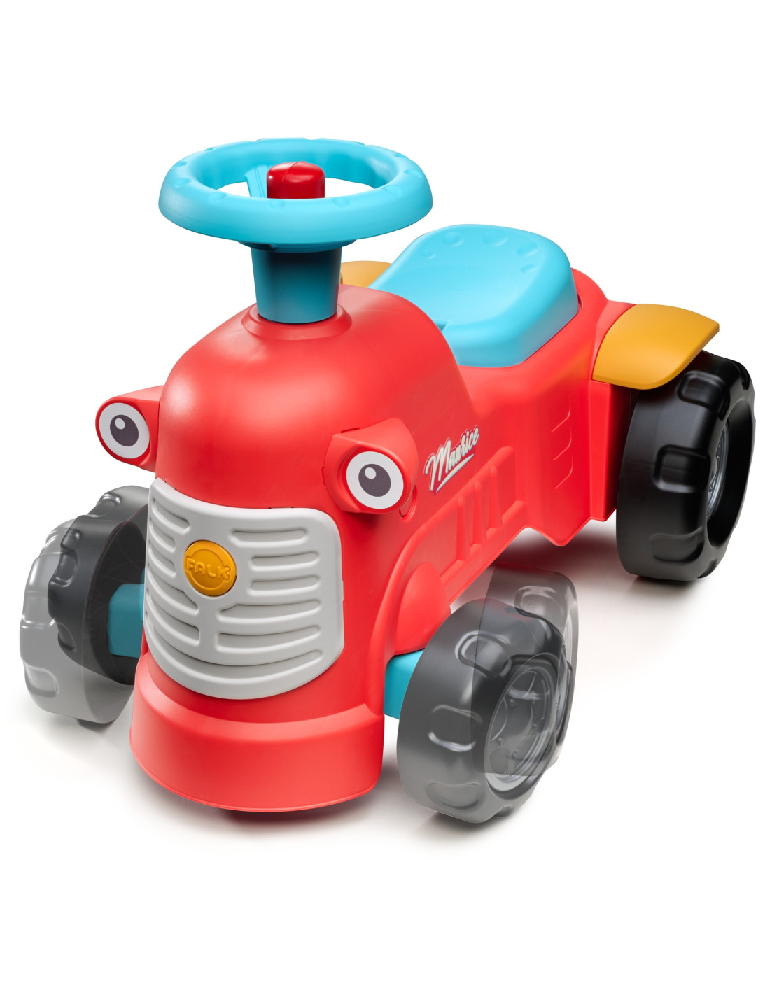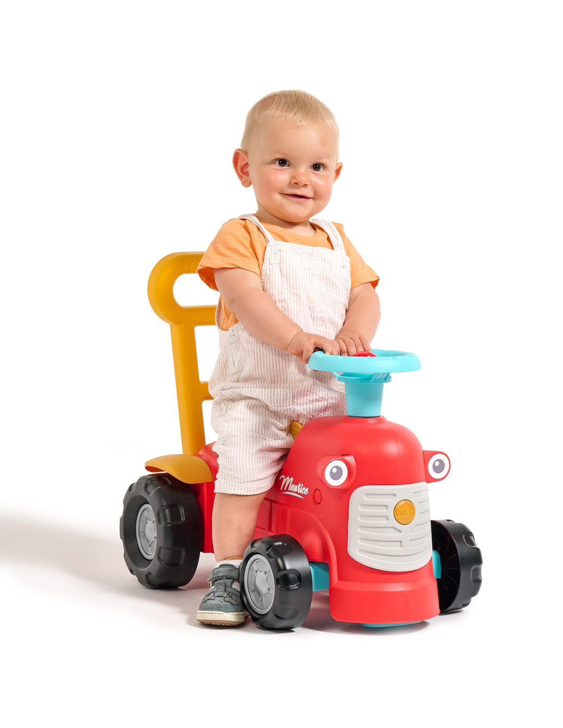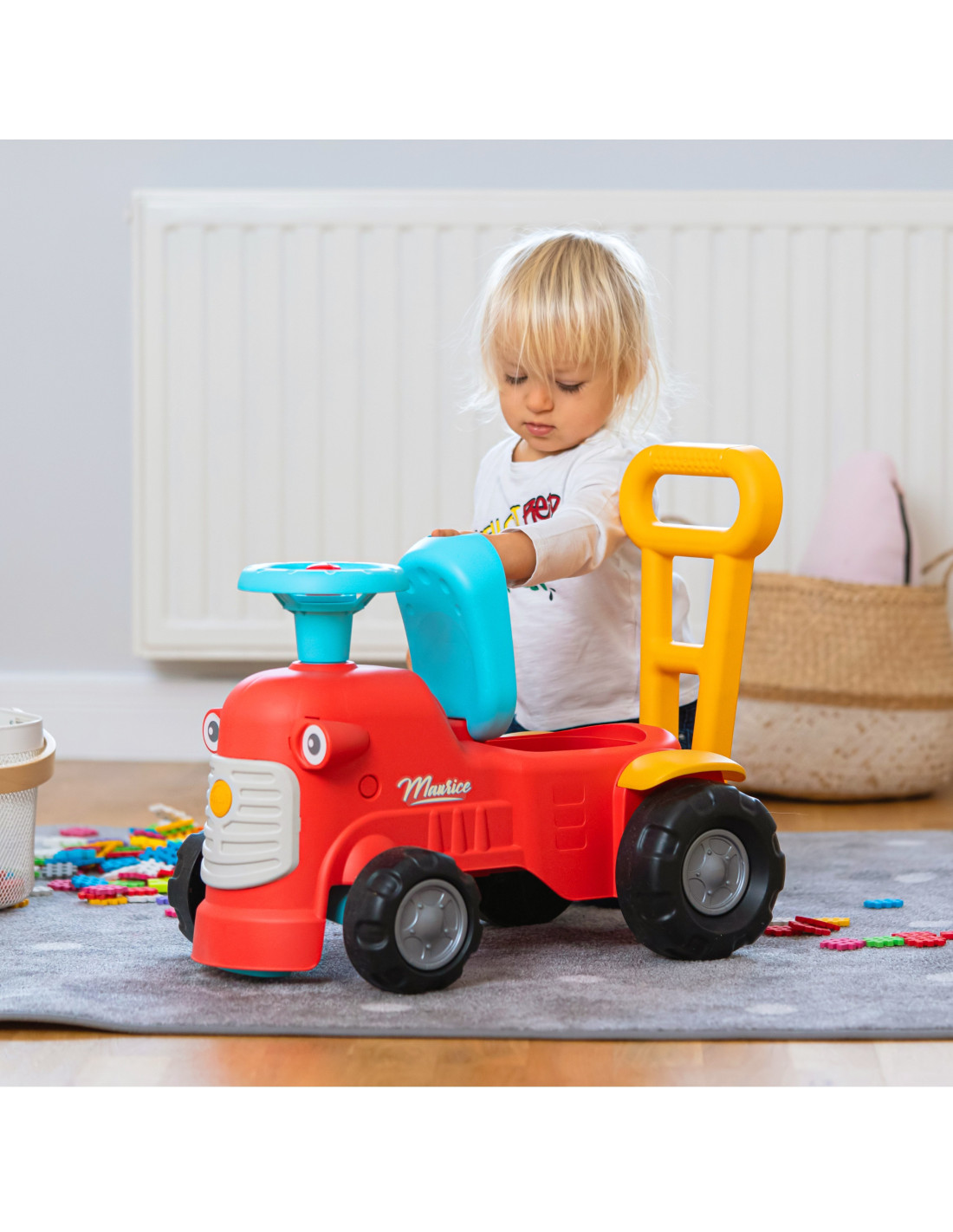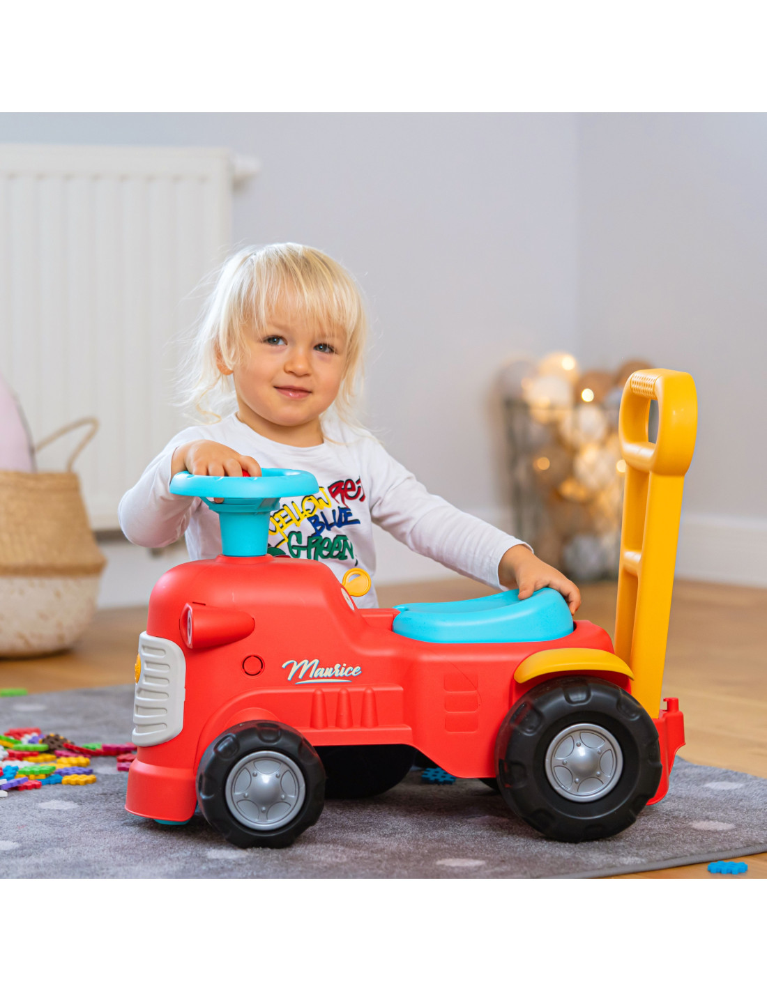 Maurice to uroczy traktorek francuskiej marki Falk, który będzie towarzyszem pierwszych kroków Twojego dziecka. Jasne kolory i zaokrąglone kształty zachwycą każdego malucha. Uruchamianie traktora za pomocą małego pokrętła dźwiękowego oraz dźwięk z klaksonu umieszczonego na kierownicy to wspaniała pierwsza nauka, która pobudzi umiejętności motoryczne i słuch Twojego dziecka. Jeżdżąc na jeździku, bawiąc się kierownicą z klaksonem i skrętnymi kołami dziecko będzie ćwiczyło koordynację i równowagę. Stojąc z tyłu, może korzystać z ergonomicznego oparcia, aby uczyć się chodzić przez zabawę, bez strachu i całkowicie bezpiecznie. Pod siedzeniem znajduje się niewielki schowek do przechowywania skarbów.
