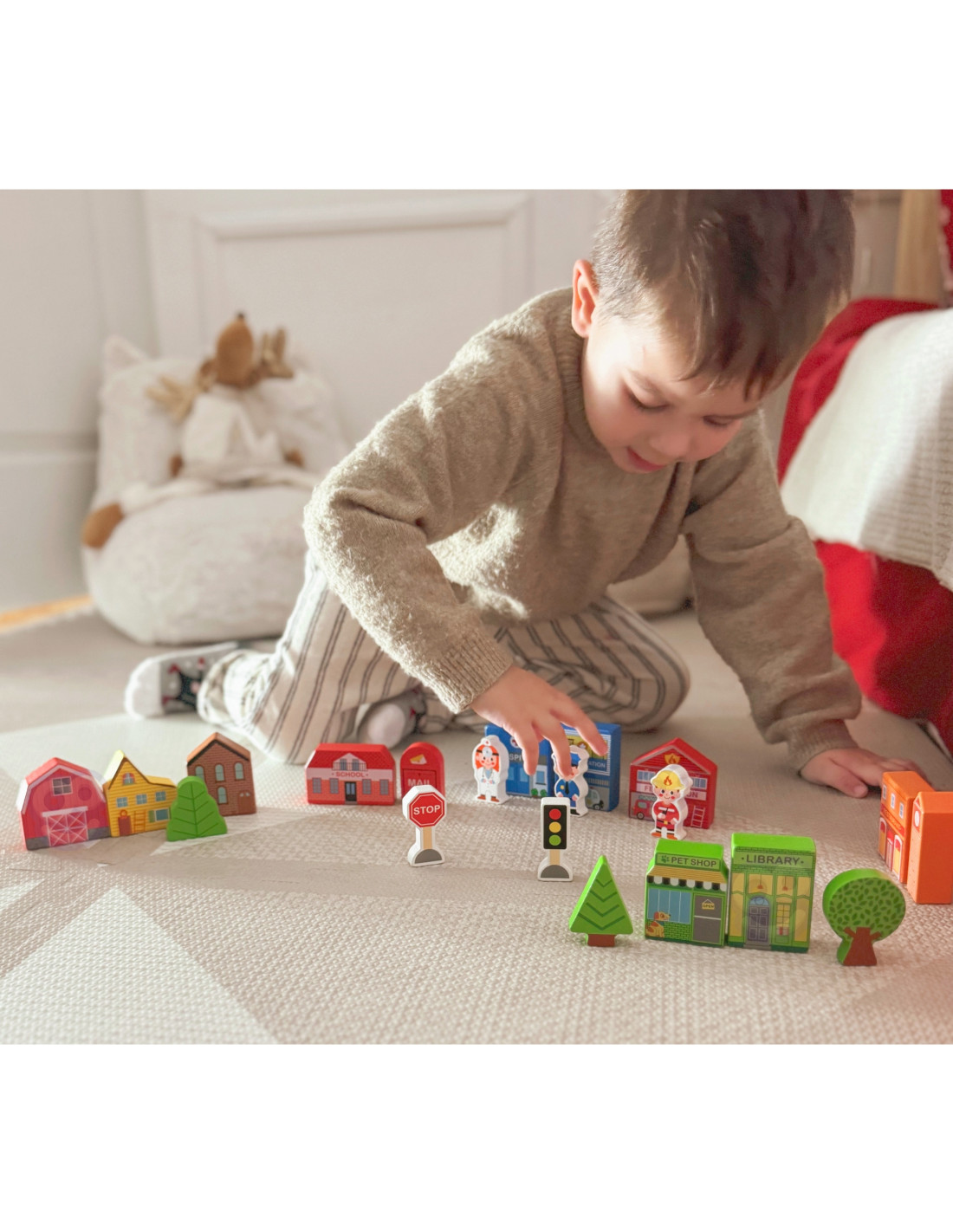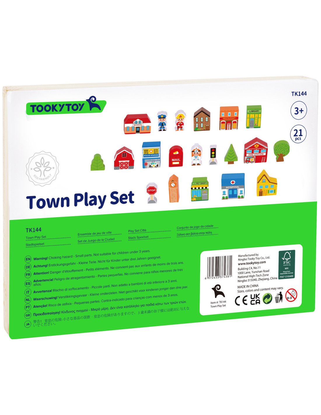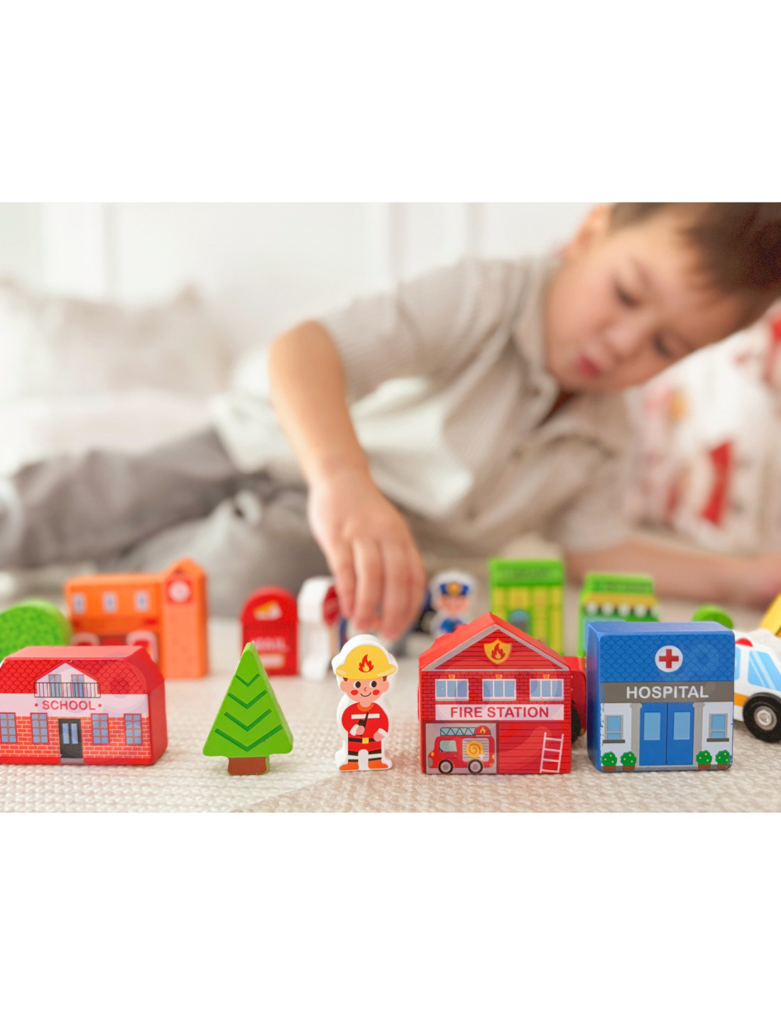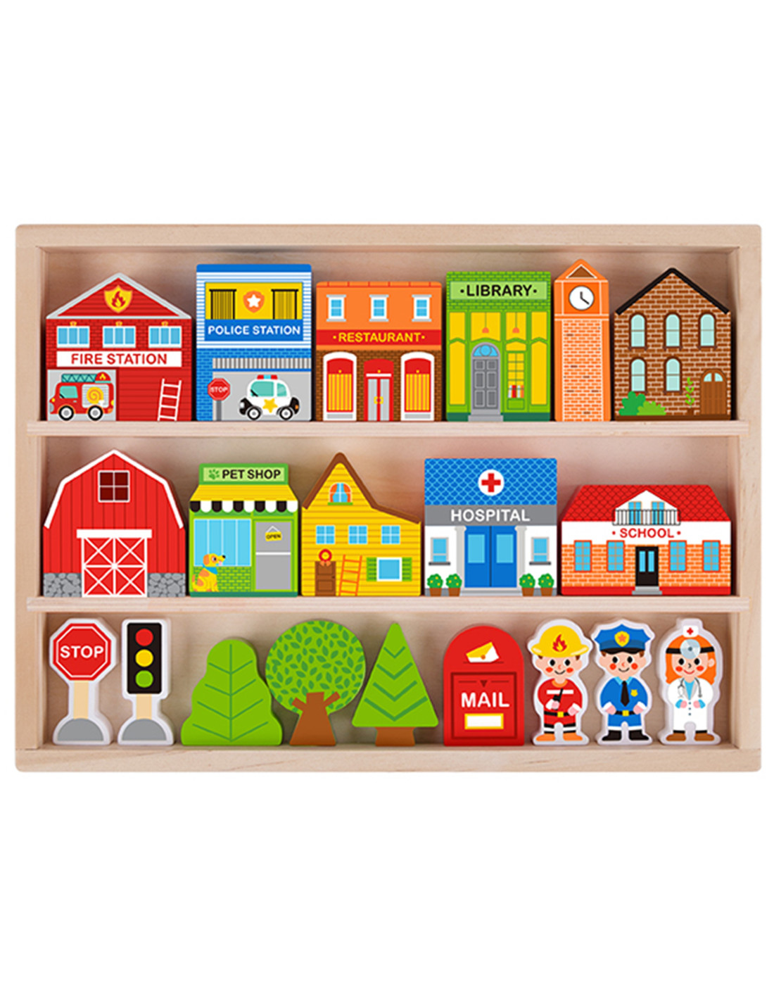 Zestaw Budynków i Figurek od marki TOOKY TOY pozwoli zbudować swoje małe miasteczko i zacząć odrywać figurkami różne scenki, które mogłyby się w nim wydarzyć. Komplet pozwala na samodzielną zabawę, ale jest również doskonałym uzupełnieniem innych zestawów. Zestaw zawiera drewniane pudełko z przegródkami, 11 figurek budynków, 3 figurki postaci, w tym: strażaka, policjanta i lekarza oraz 6 figurek innych obiektów: znak stopu, światła drogowe, dwa drzewka, krzew i skrzynkę na listy. Poprzez odgrywanie ról dziecko rozwija swoją kreatywność, wyobraźnię oraz umiejętności społeczne. Całość wykonana z najwyższej jakości materiałów i pomalowana nietoksycznymi farbami bezpiecznymi dla dzieci i środowiska.
