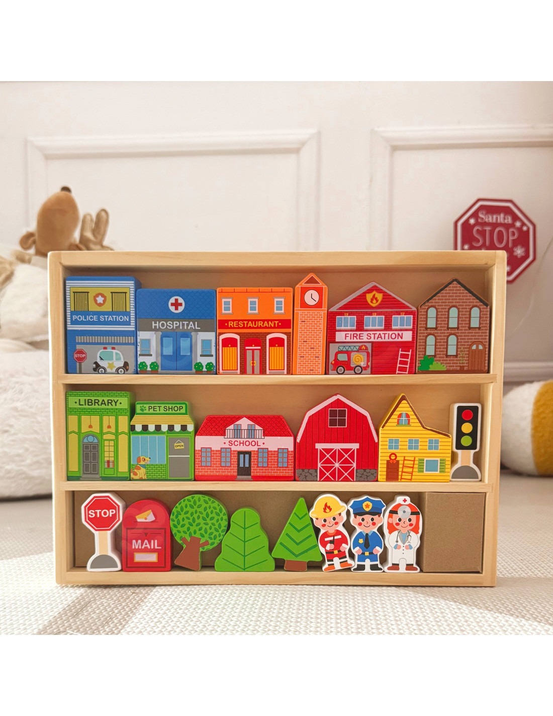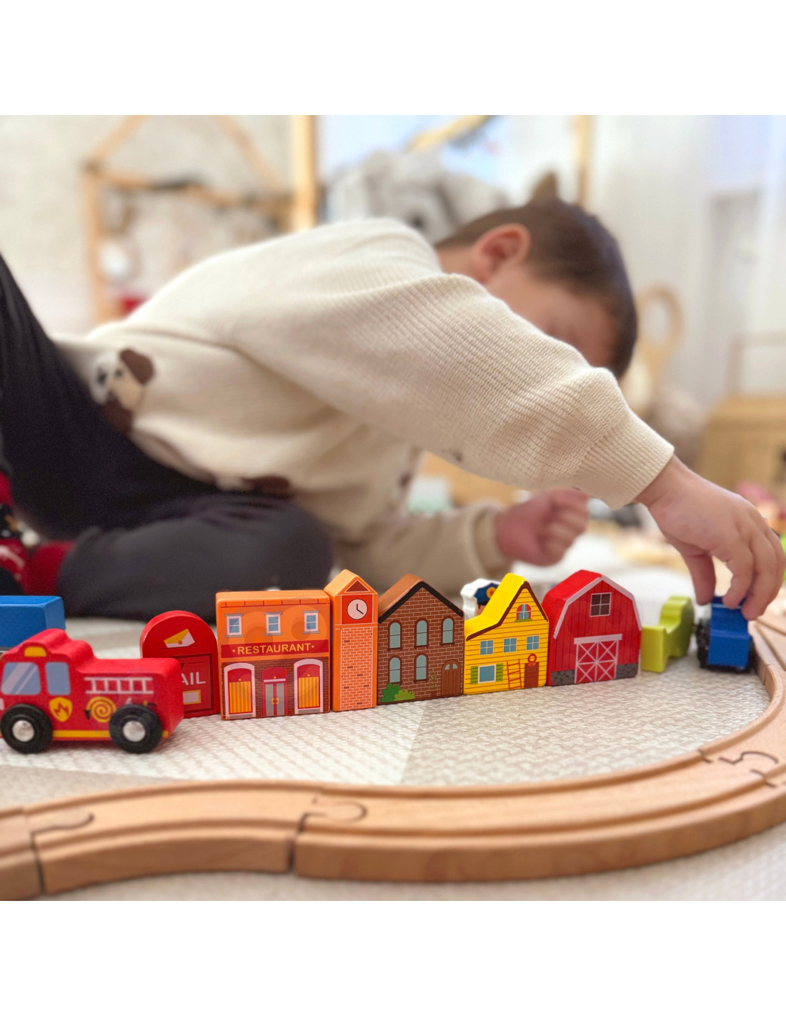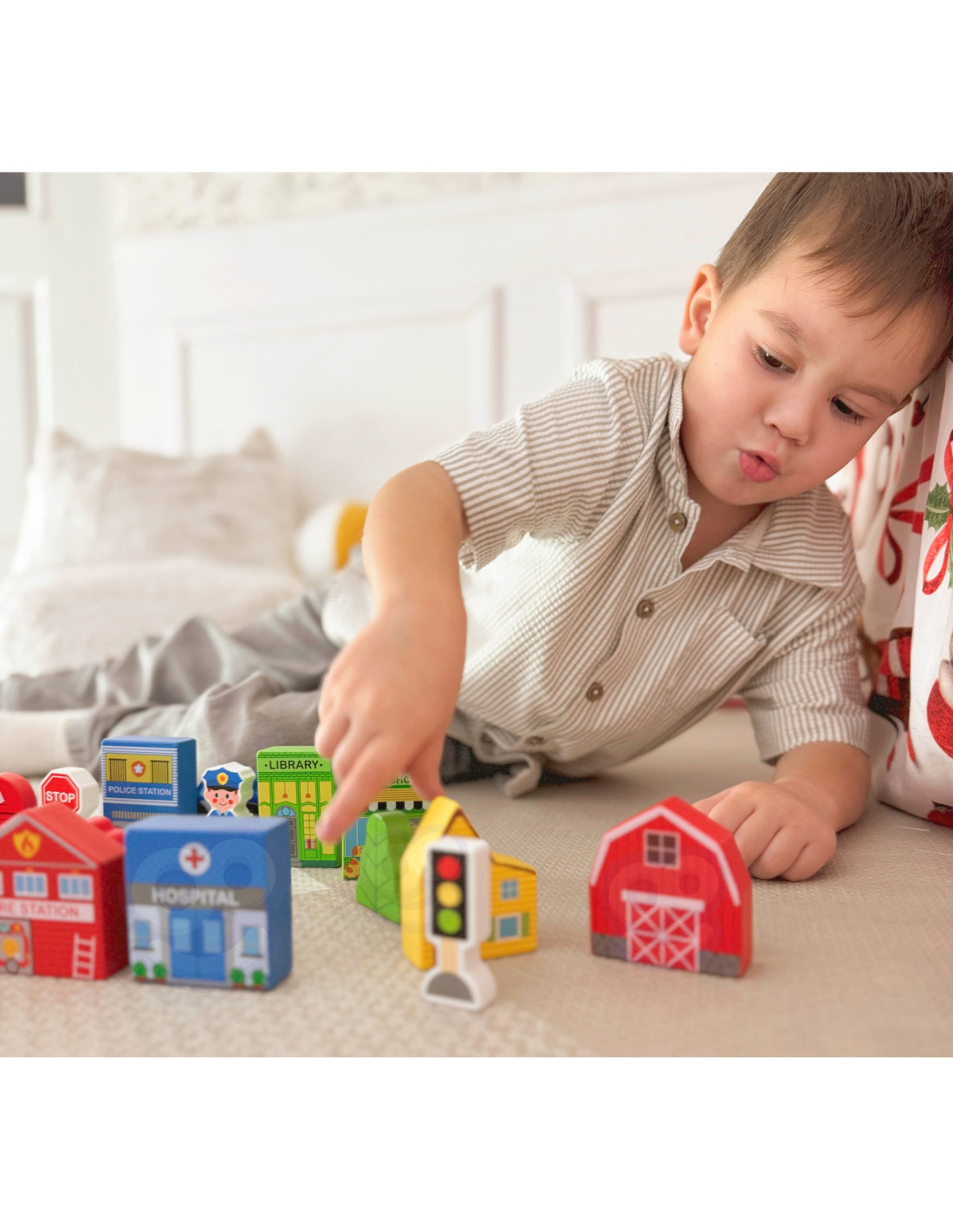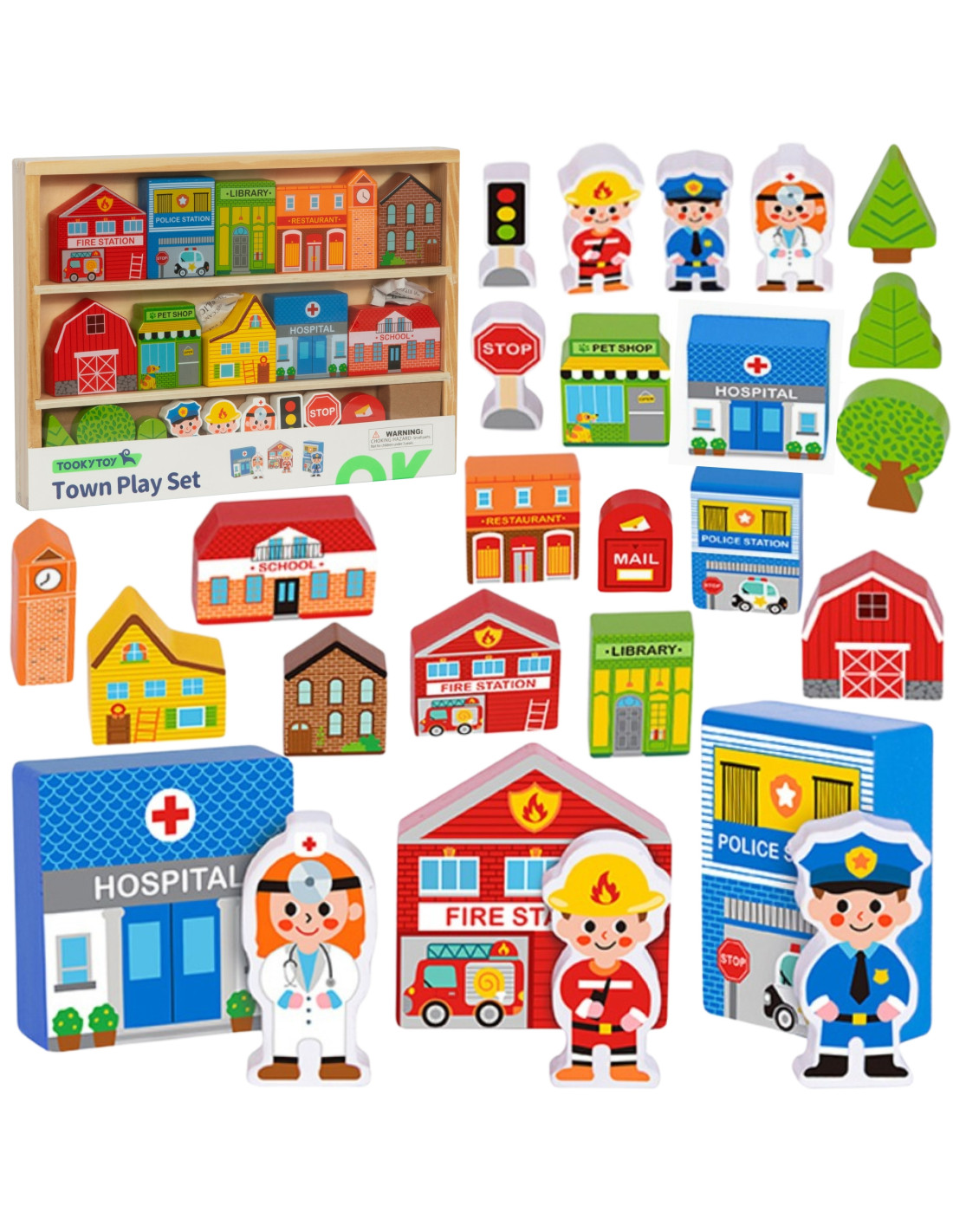 Zestaw Budynków i Figurek od marki TOOKY TOY pozwoli zbudować swoje małe miasteczko i zacząć odrywać figurkami różne scenki, które mogłyby się w nim wydarzyć. Komplet pozwala na samodzielną zabawę, ale jest również doskonałym uzupełnieniem innych zestawów. Zestaw zawiera drewniane pudełko z przegródkami, 11 figurek budynków, 3 figurki postaci, w tym: strażaka, policjanta i lekarza oraz 6 figurek innych obiektów: znak stopu, światła drogowe, dwa drzewka, krzew i skrzynkę na listy. Poprzez odgrywanie ról dziecko rozwija swoją kreatywność, wyobraźnię oraz umiejętności społeczne. Całość wykonana z najwyższej jakości materiałów i pomalowana nietoksycznymi farbami bezpiecznymi dla dzieci i środowiska.