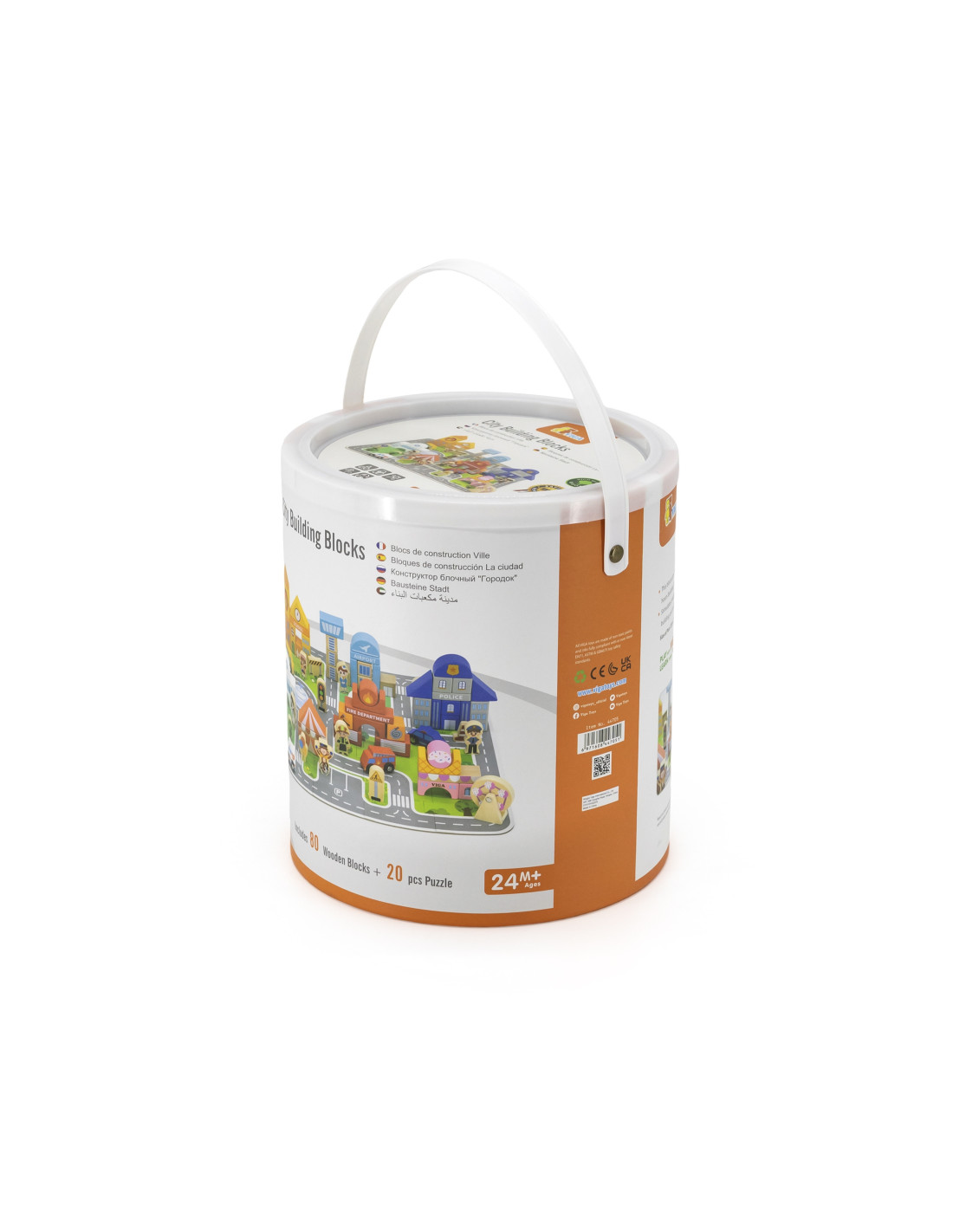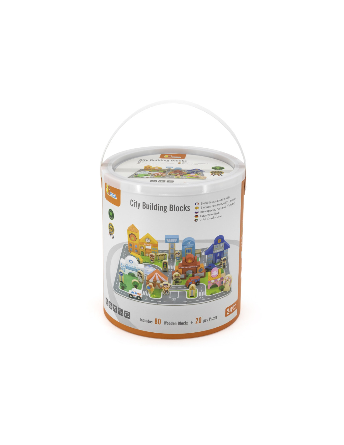 Drewniana Zestaw Klocków Miasto od marki Viga to idealna zabawka dla przyszłych architektów, którzy chcą stworzyć plan własnego miasta. Rozłóż makietę i za pomocą klocków o różnych kształtach i w pięknych kolorach zbuduj miasto! W zestawie znajdziemy 60 klocków, z których może być zbudowana szkoła, szpital, komisariat, straż pożarna, lotnisko, cukiernia oraz cyrk, a później możemy rozłożyć je w dowolnym miejscu na planszy miasta. Oprócz samych budynków w zestawie znajduje się 5 pojazdów, 6 figurek postaci z różnych zawodów odpowiadającym budynkom miasta oraz dodatkowe akcesoria: w tym znaki drogowe, drzewka. Całość wygodnie zapakowana w wiaderku dla łatwiejszego przechowywania.