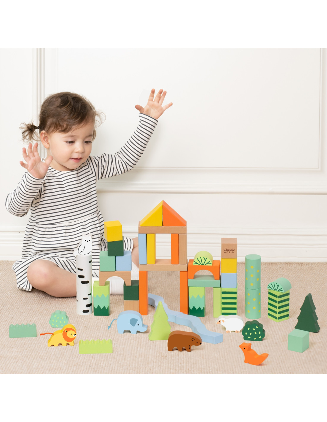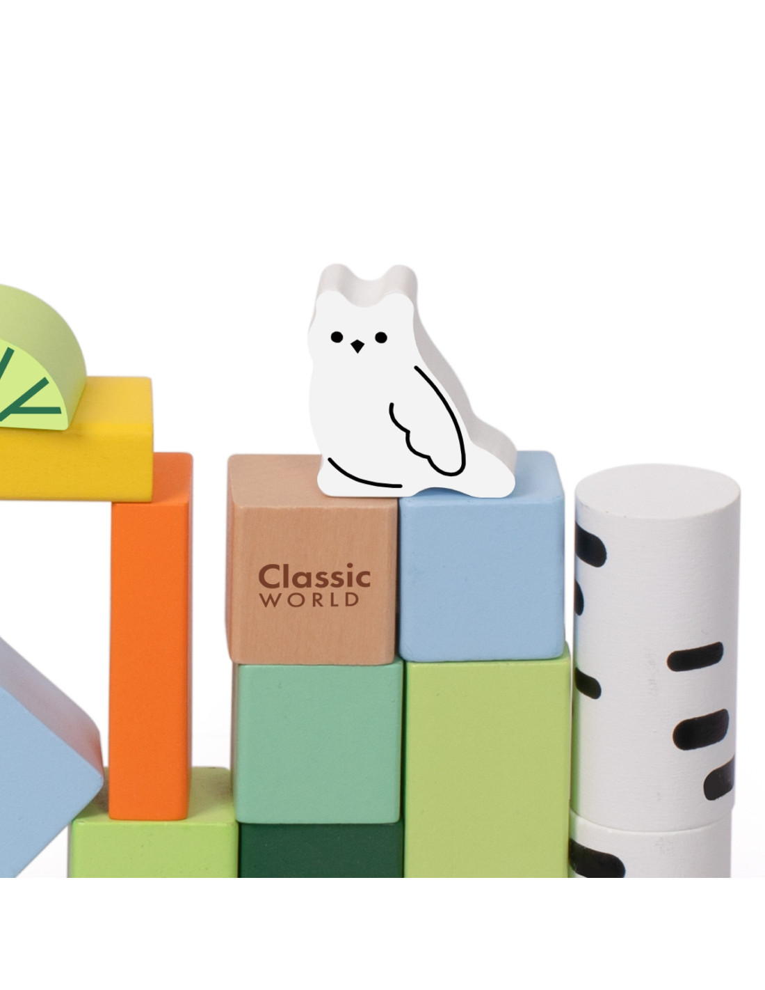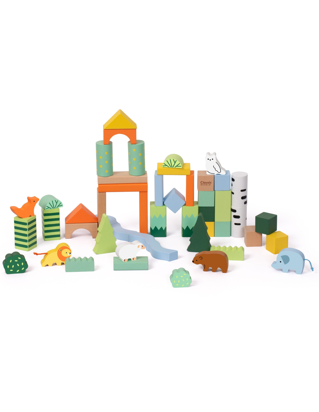 - - Zestaw zawiera 50 kolorowych, drewnianych klocków o różnych kształtach
