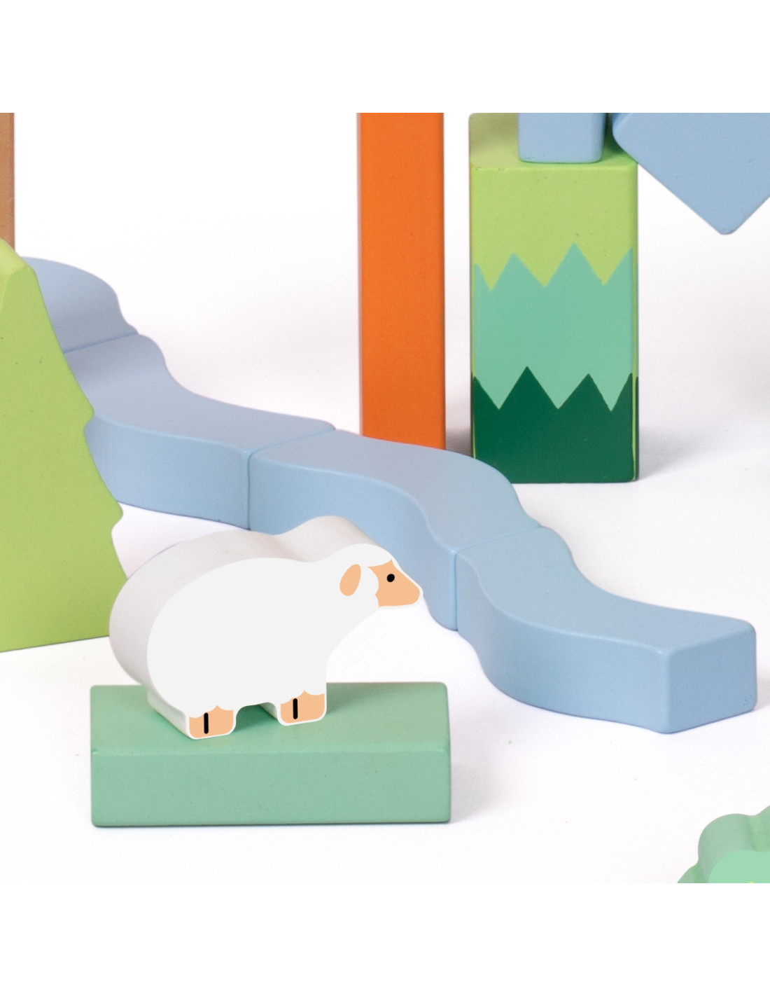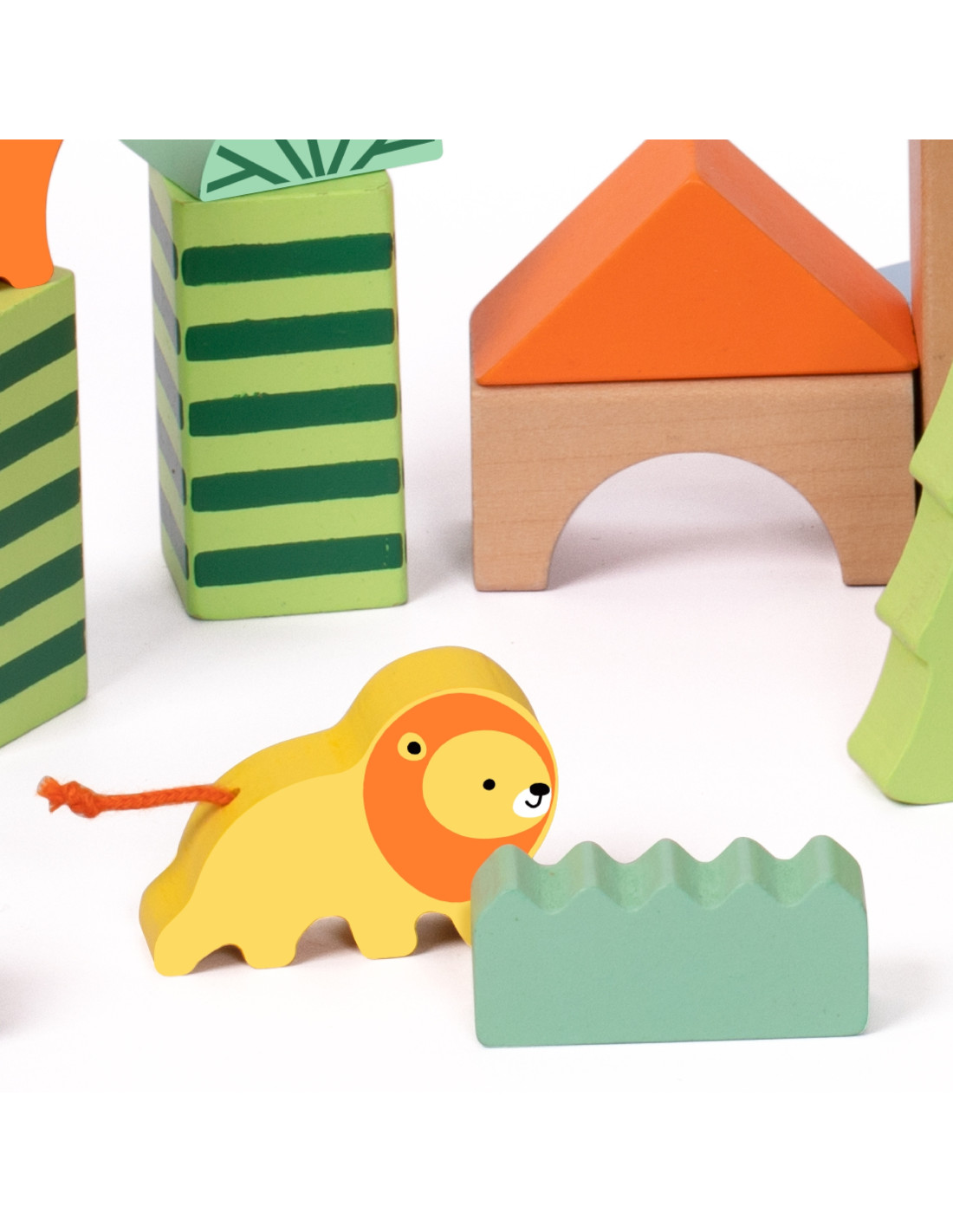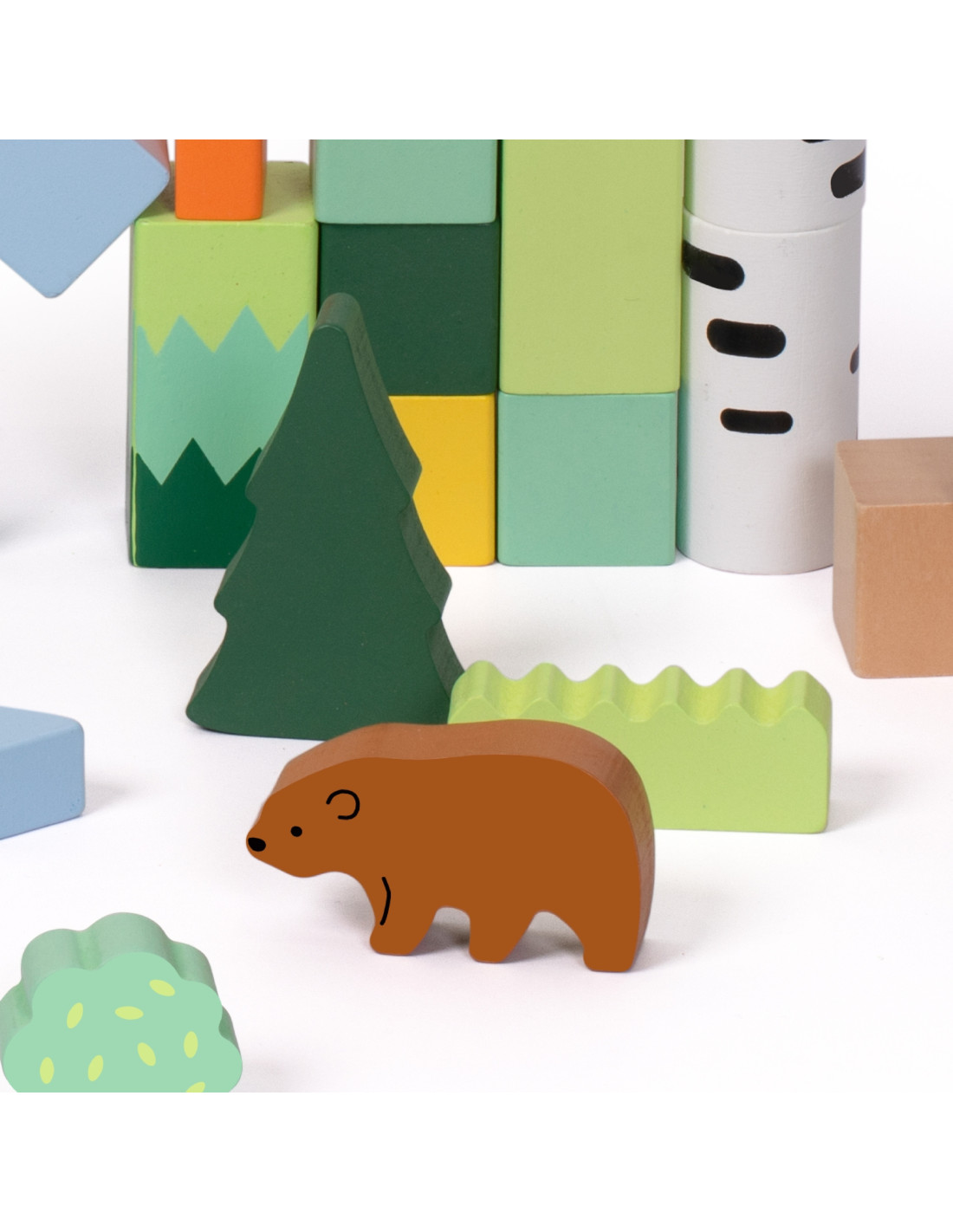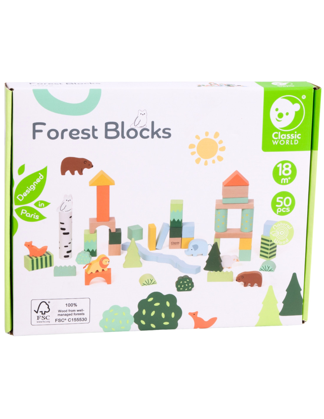 - - Zestaw zawiera 50 kolorowych, drewnianych klocków o różnych kształtach