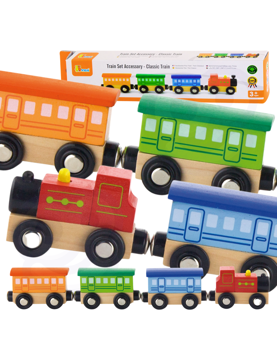 Zestaw od firmy Viga składający się z 4 elementów połączonych magnesami tworzących pociąg. Komplet może być wykorzystywany jako samodzielna zabawka, może też służyć jako uzupełnienie kolejki, innych zestawów, czy klocków.