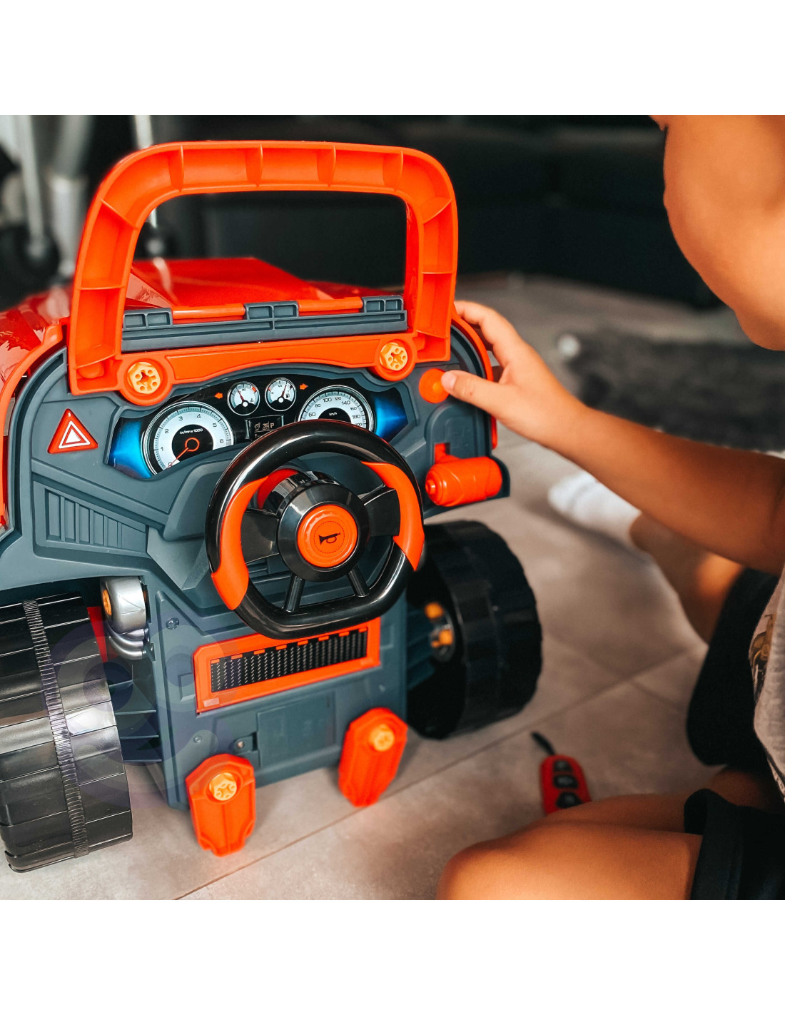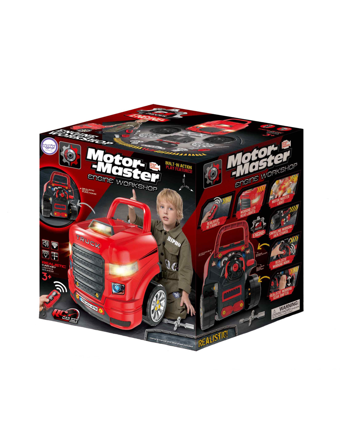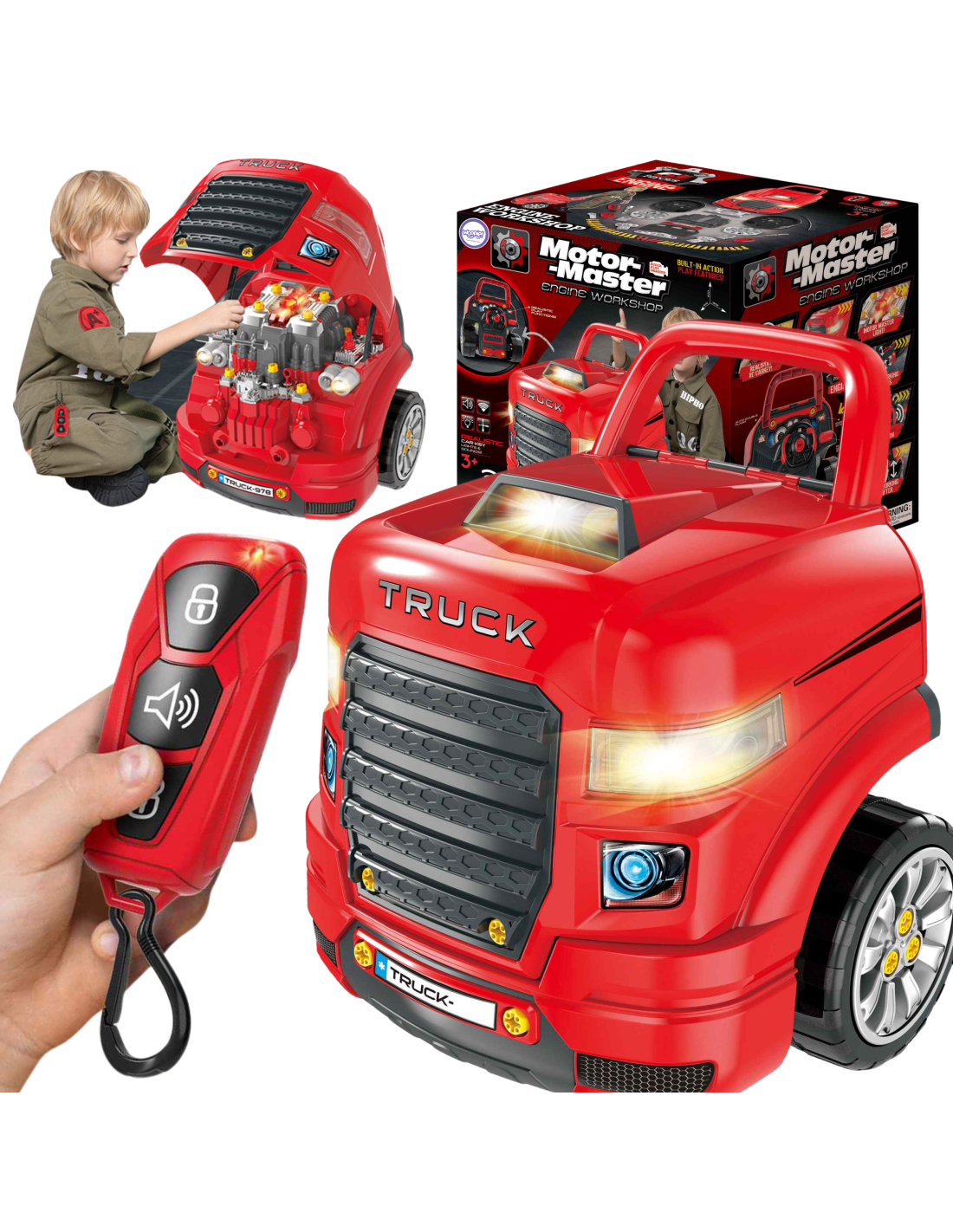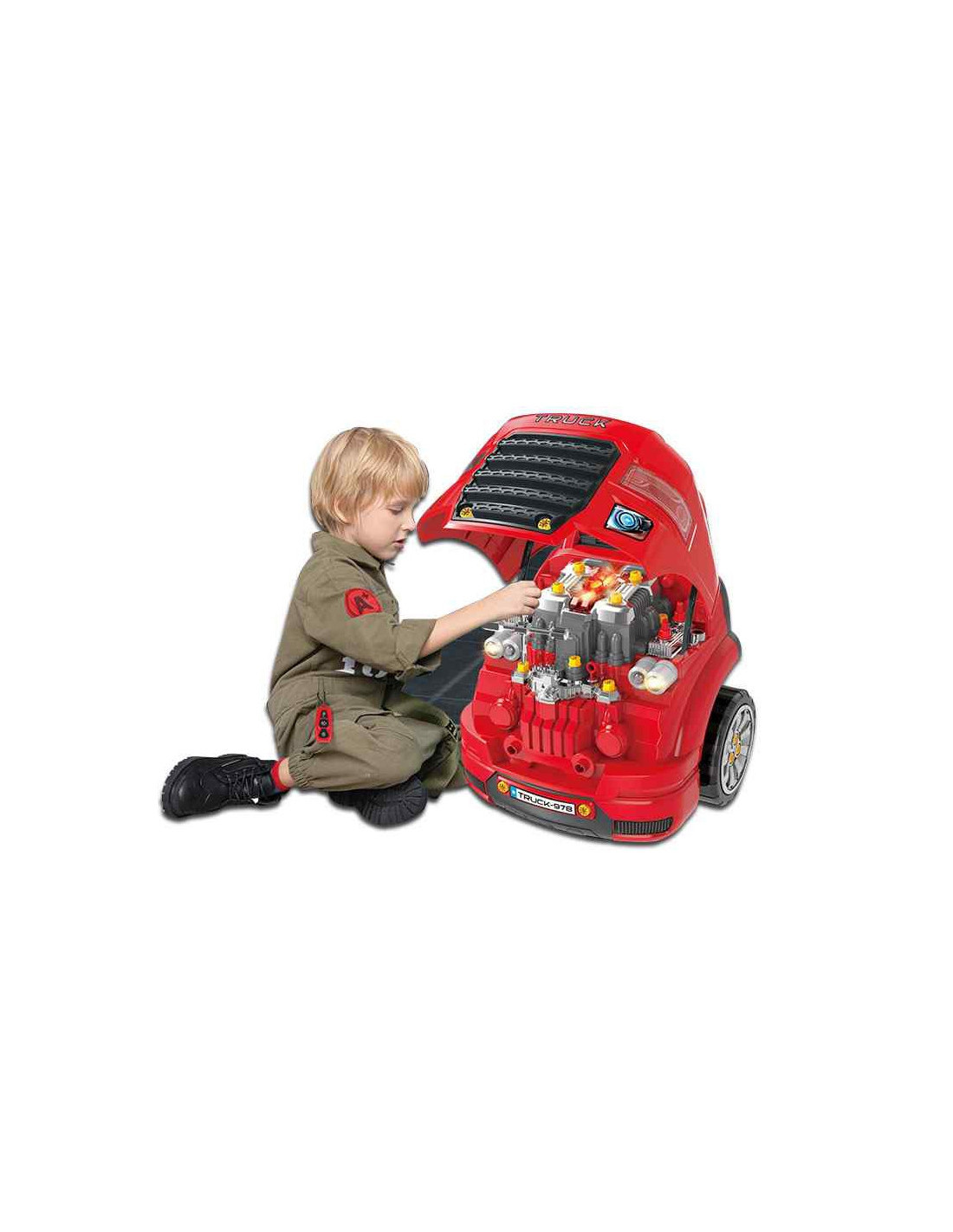 Zabawka imitująca przód ciężarówki marki WOOPIE z podnoszoną maską, kierownicą oraz deską rozdzielczą. Po otworzeniu schowku pod kierownicą dziecko znajdzie w środku mnóstwo atrakcji w postaci narzędzi, pokręteł i śrub. Młody mechanik może dokonywać wielu napraw i przeglądów swojego pojazdu (np. kół, błotników, silnika, świec zapłonowych, grilla chłodnicy). Zabawka wyposażona jest w moduł dźwiękowy (odgłosy silnika i klakson) i świetlny (świecą reflektory). Dodatkowo w zestawie jest pilot umożliwiający sterowanie modułami. W celu zdjęcia kół można zastosować umieszczony w zabawce podnośnik. Z całą pewnością jest to zestaw jedyny w swoim rodzaju, oferujący niezliczoną ilość możliwości zabawy.
