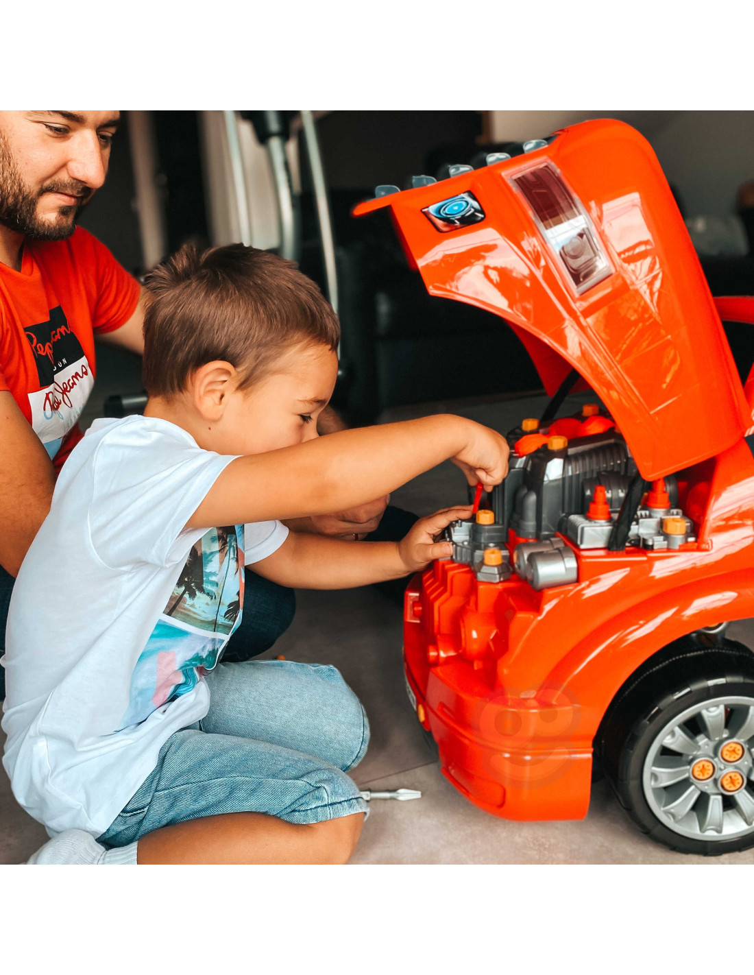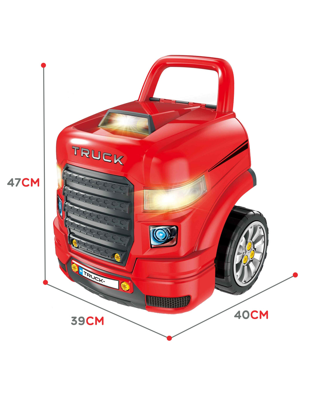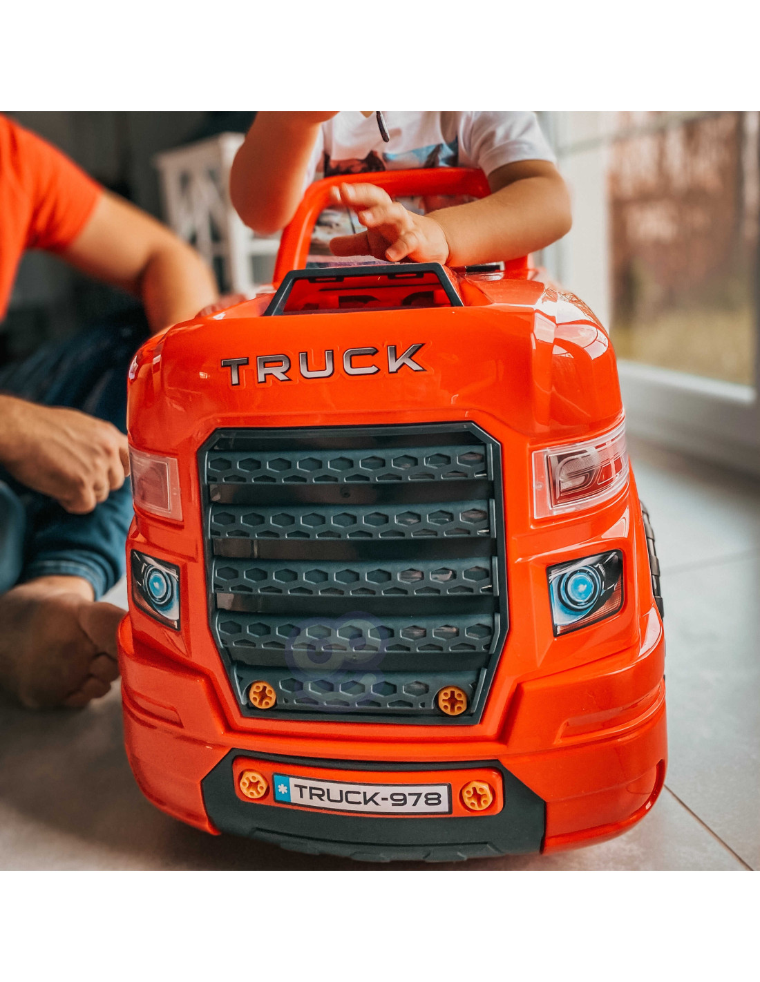 Zabawka imitująca przód ciężarówki marki WOOPIE z podnoszoną maską, kierownicą oraz deską rozdzielczą. Po otworzeniu schowku pod kierownicą dziecko znajdzie w środku mnóstwo atrakcji w postaci narzędzi, pokręteł i śrub. Młody mechanik może dokonywać wielu napraw i przeglądów swojego pojazdu (np. kół, błotników, silnika, świec zapłonowych, grilla chłodnicy). Zabawka wyposażona jest w moduł dźwiękowy (odgłosy silnika i klakson) i świetlny (świecą reflektory). Dodatkowo w zestawie jest pilot umożliwiający sterowanie modułami. W celu zdjęcia kół można zastosować umieszczony w zabawce podnośnik. Z całą pewnością jest to zestaw jedyny w swoim rodzaju, oferujący niezliczoną ilość możliwości zabawy.