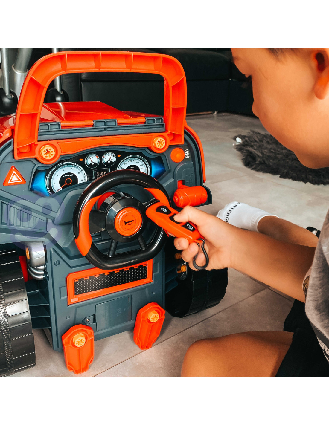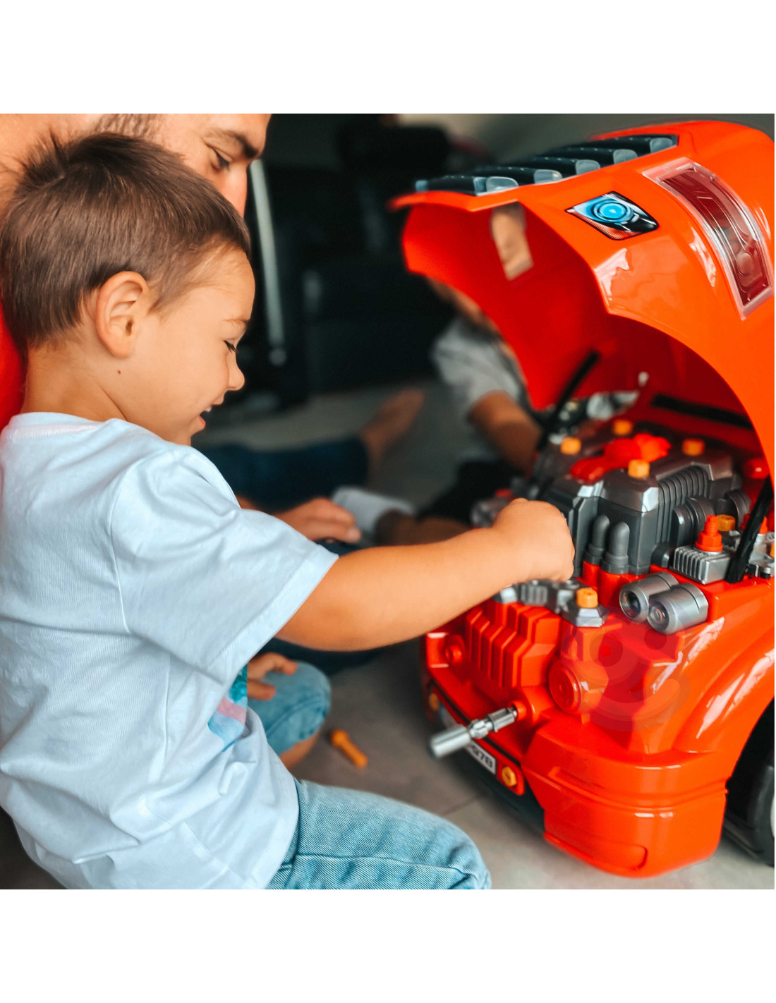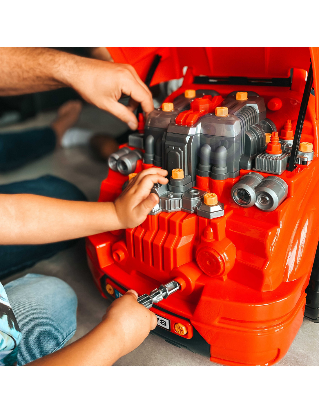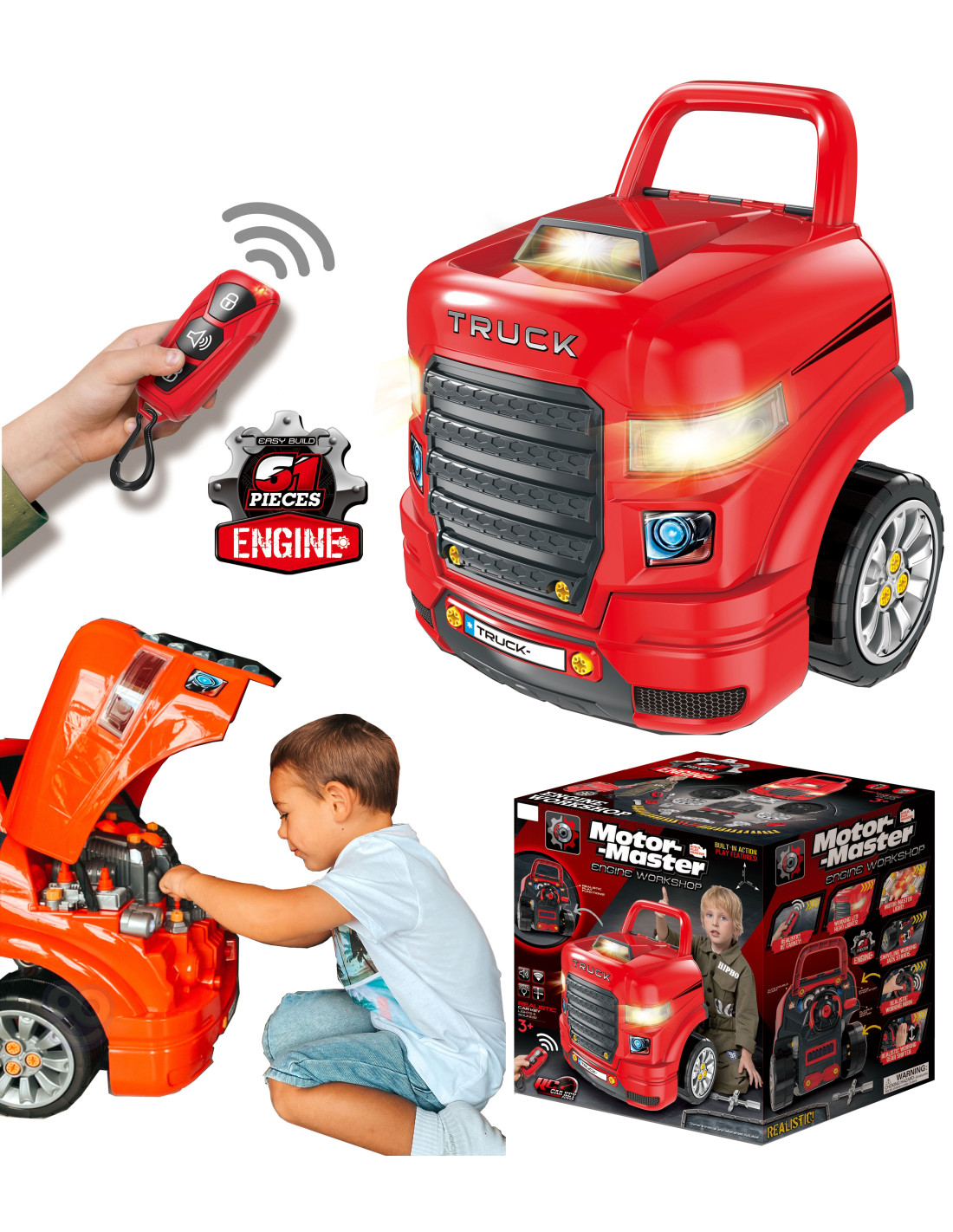 Zabawka imitująca przód ciężarówki marki WOOPIE z podnoszoną maską, kierownicą oraz deską rozdzielczą. Po otworzeniu schowku pod kierownicą dziecko znajdzie w środku mnóstwo atrakcji w postaci narzędzi, pokręteł i śrub. Młody mechanik może dokonywać wielu napraw i przeglądów swojego pojazdu (np. kół, błotników, silnika, świec zapłonowych, grilla chłodnicy). Zabawka wyposażona jest w moduł dźwiękowy (odgłosy silnika i klakson) i świetlny (świecą reflektory). Dodatkowo w zestawie jest pilot umożliwiający sterowanie modułami. W celu zdjęcia kół można zastosować umieszczony w zabawce podnośnik. Z całą pewnością jest to zestaw jedyny w swoim rodzaju, oferujący niezliczoną ilość możliwości zabawy.