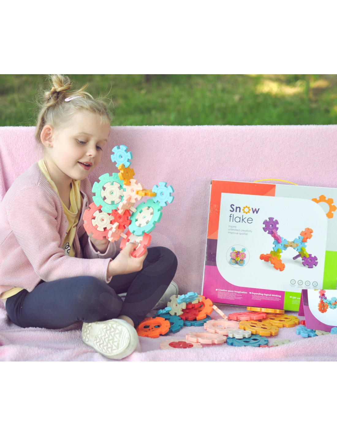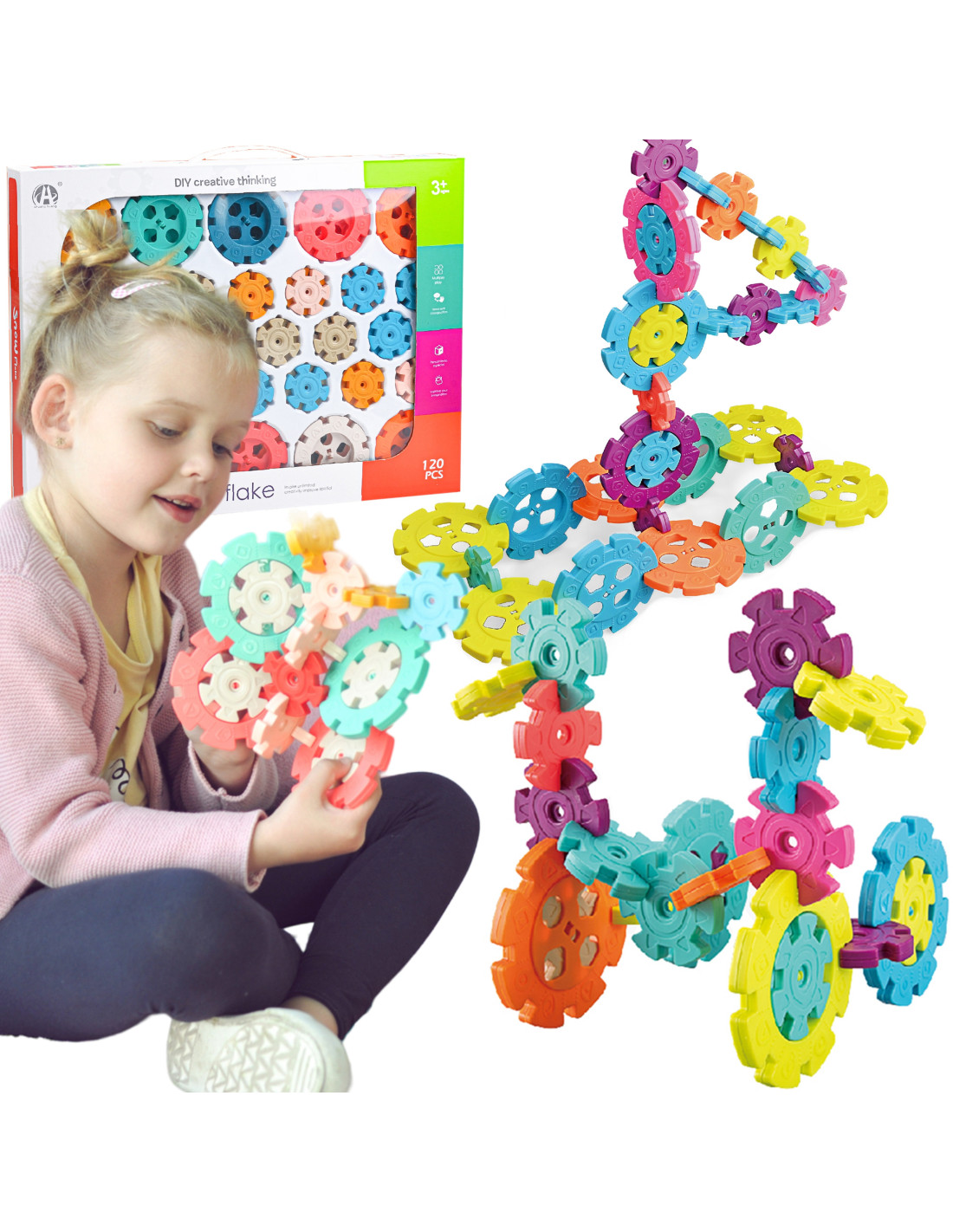 Klocki Konstrukcyjne Wafle od marki WOOPIE zwrócą uwagę i zafascynują Twoje dziecko. Kolorowe elementy przypominają wyglądem płatki śniegu. Klocki w bardzo łatwy sposób łączą się ze sobą, a ze względu na swoją budowę i sposób łączenia można z nich tworzyć ciekawe trójwymiarowe konstrukcje. Zastosowane otwory w śnieżynkach pozwalają na łączenie ich pod skosem, a nie tylko prostopadle. Zestaw zawiera 120 elementów: w tym 40 dużych i 80 małych klocków. Samo budowanie konstrukcji rozwinie u dziecka logiczne myślenie, wyobraźnie, kreatywność oraz pomoże mu się skoncentrować podczas tworzenia. Przez układanie klocków dziecko poznaje kształty i kolory oraz ćwiczy zdolności manualne tzw. motorykę małą.