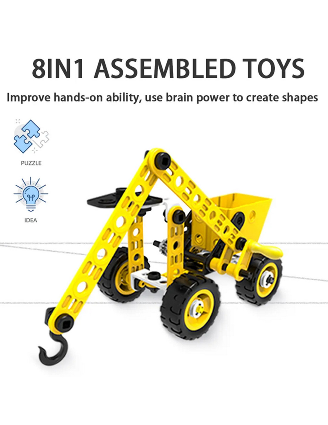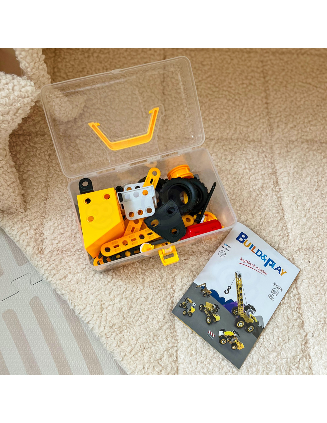 - - Zestaw zawiera 100 elementów, które umożliwiają budowanie aż 8 różnych modeli maszyn i pojazdów.