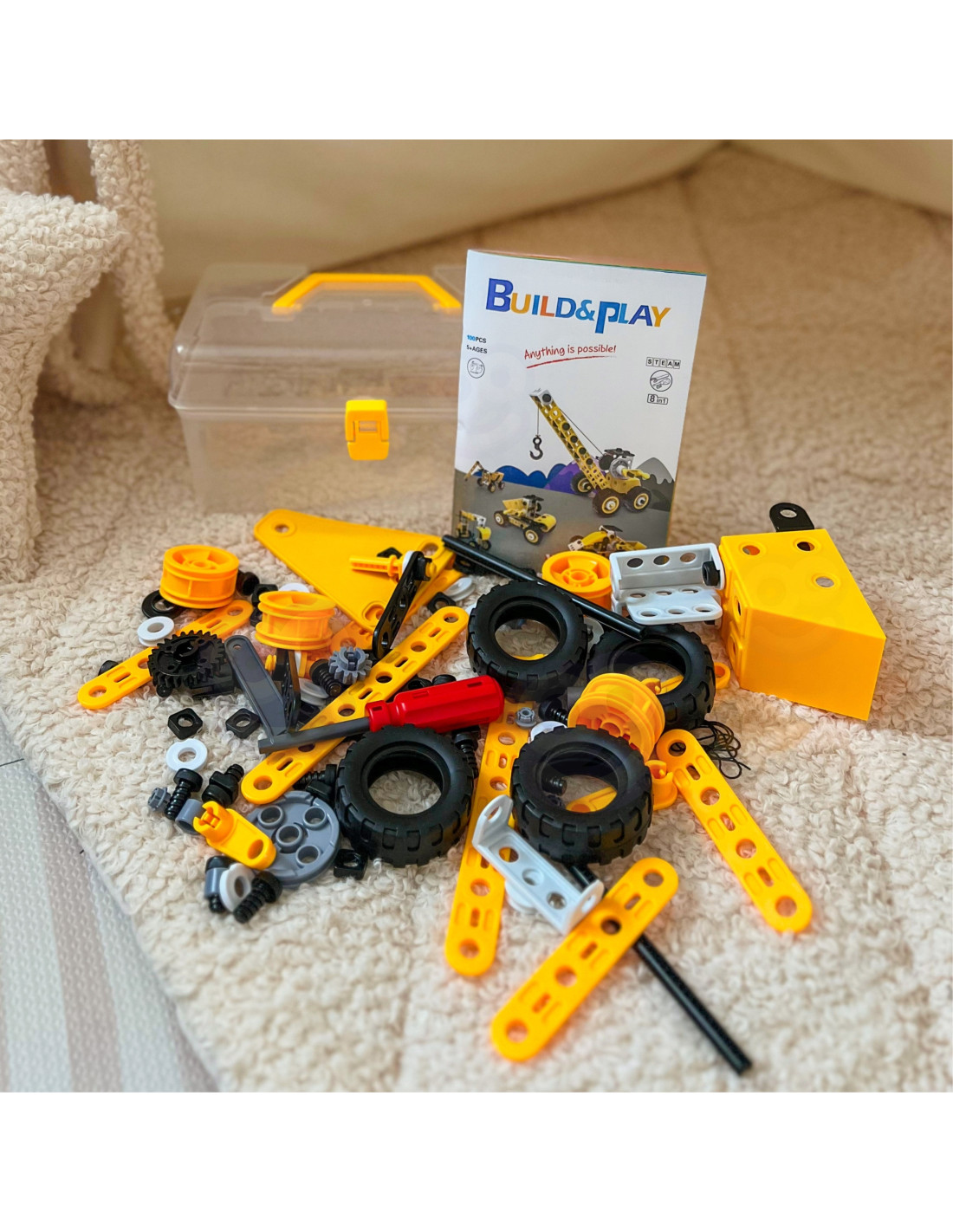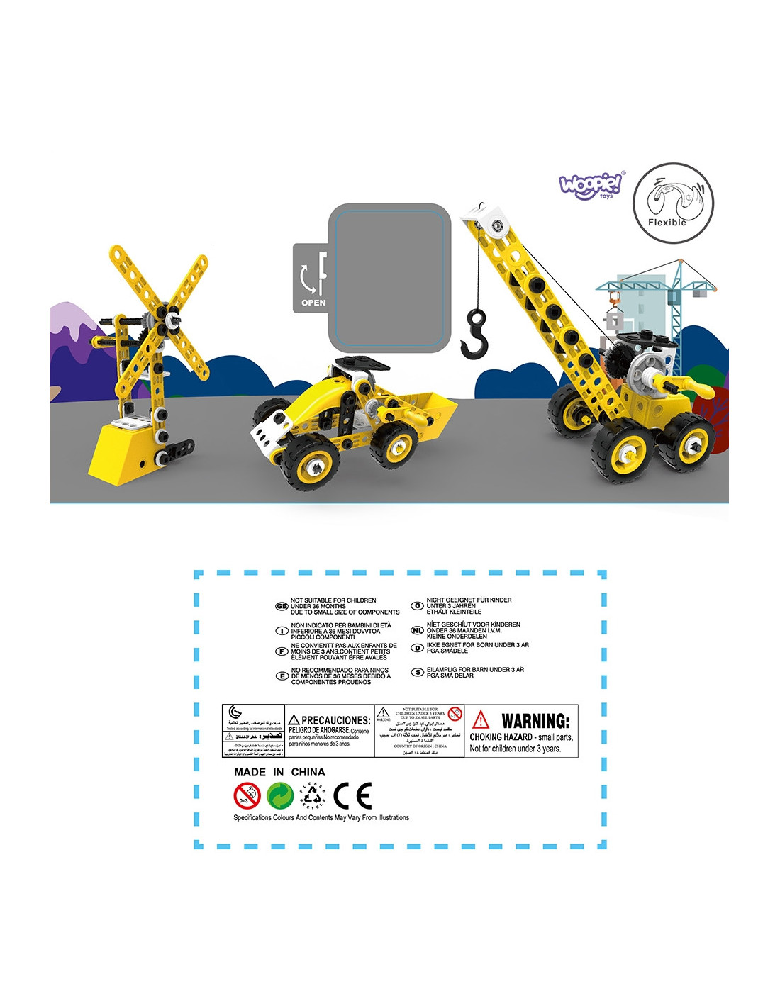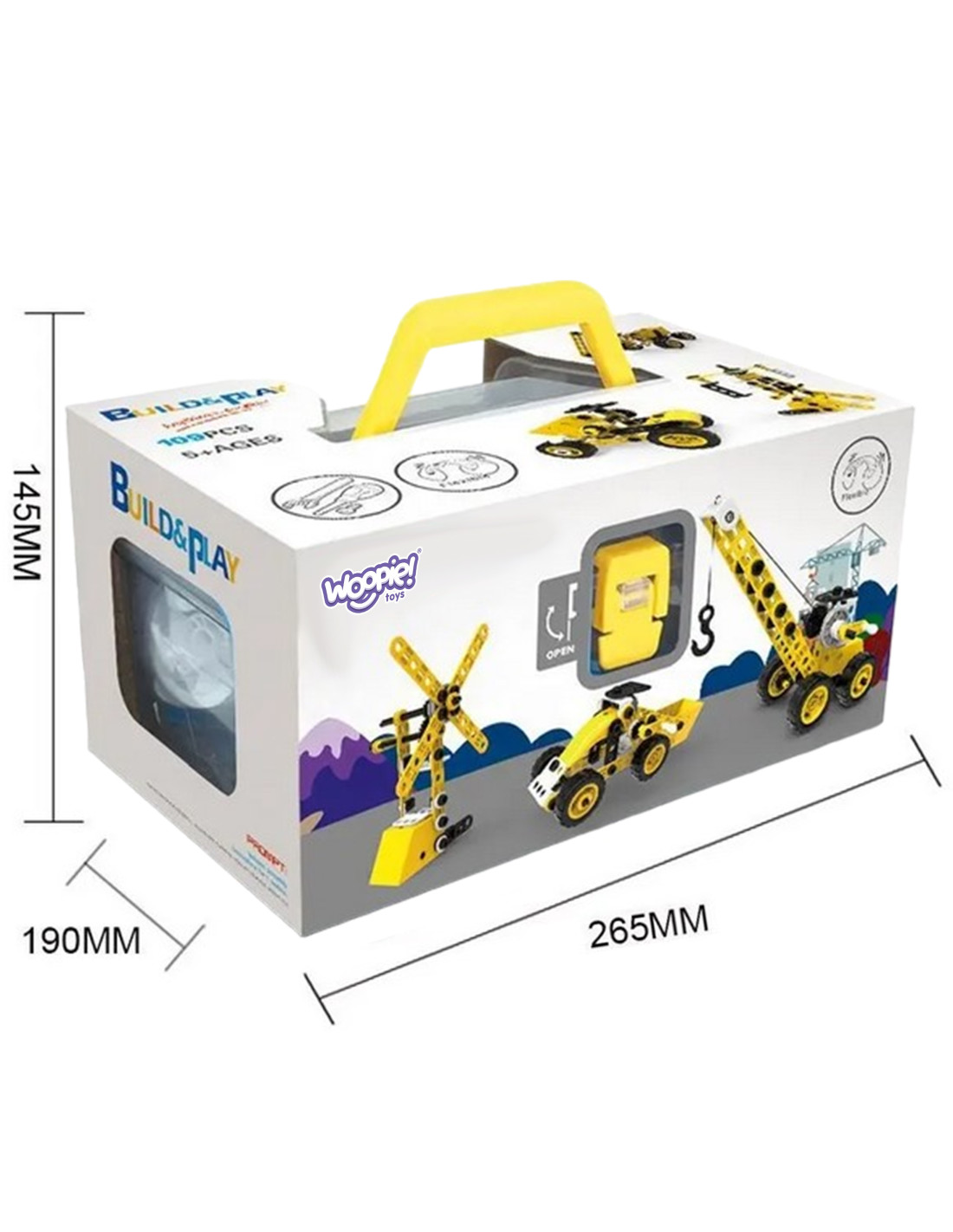 Zestaw pojazdów konstrukcyjnych od marki WOOPIE to 100 elementów, z których młody konstruktor może stworzyć 8 różnych modeli, takich jak dźwig, wiatrak, ciężarówka i inne maszyny budowlane! Dzięki prostemu systemowi skręcania i rozkręcania, dzieci z łatwością wejdą w fascynujący świat konstrukcji, rozwijając przy tym zdolności manualne, logiczne myślenie i wyobraźnię przestrzenną. To zabawka, która uczy zasad budowy maszyn i mechanizmów, a przy tym wprowadza w świat narzędzi i ich bezpiecznego użytkowania.