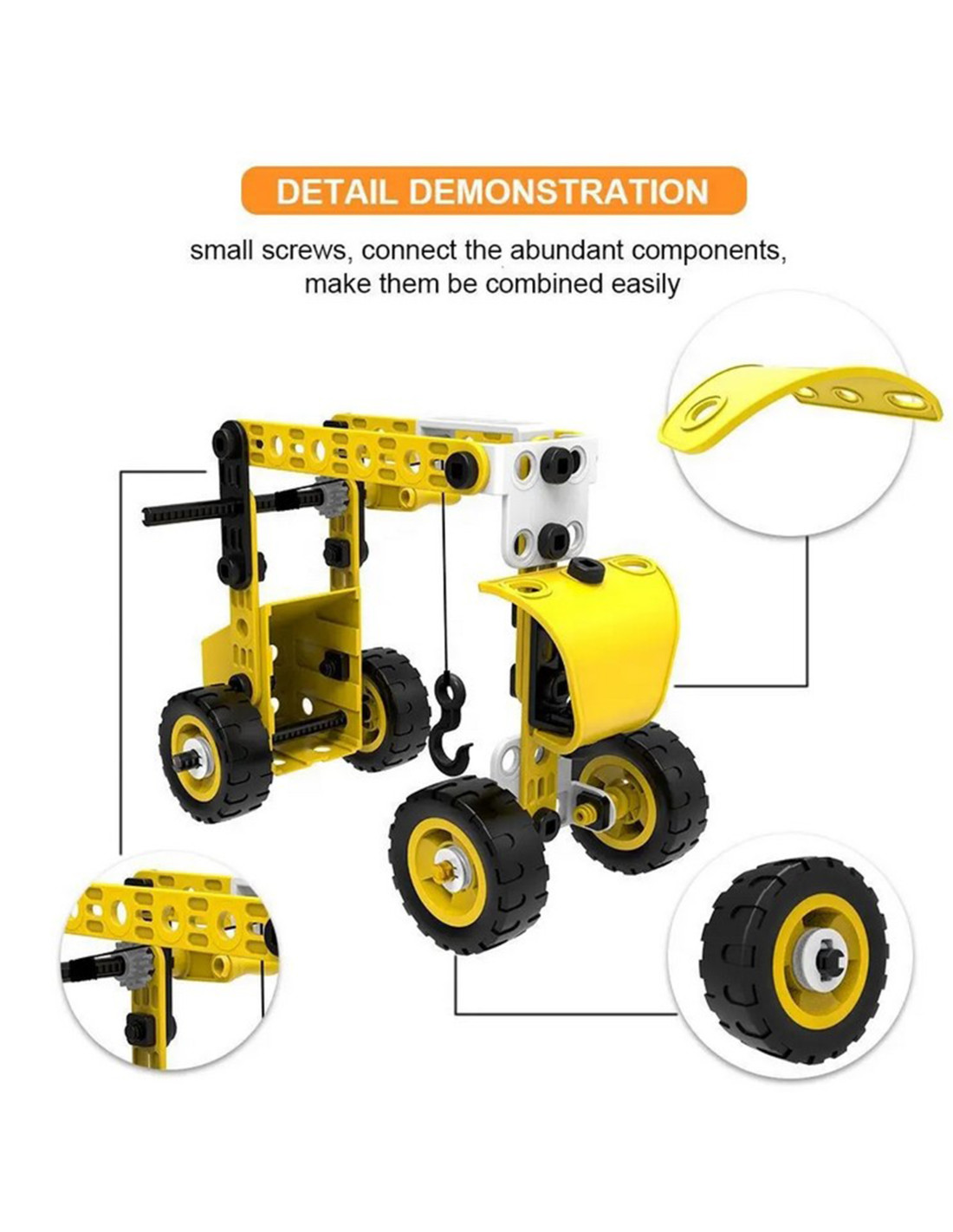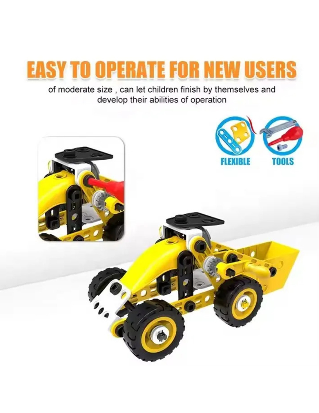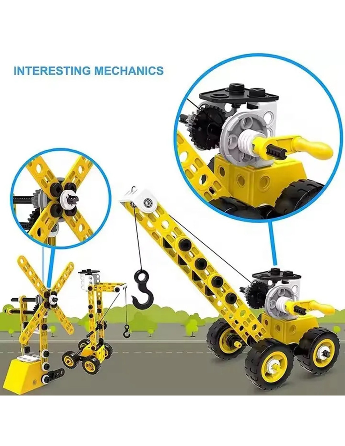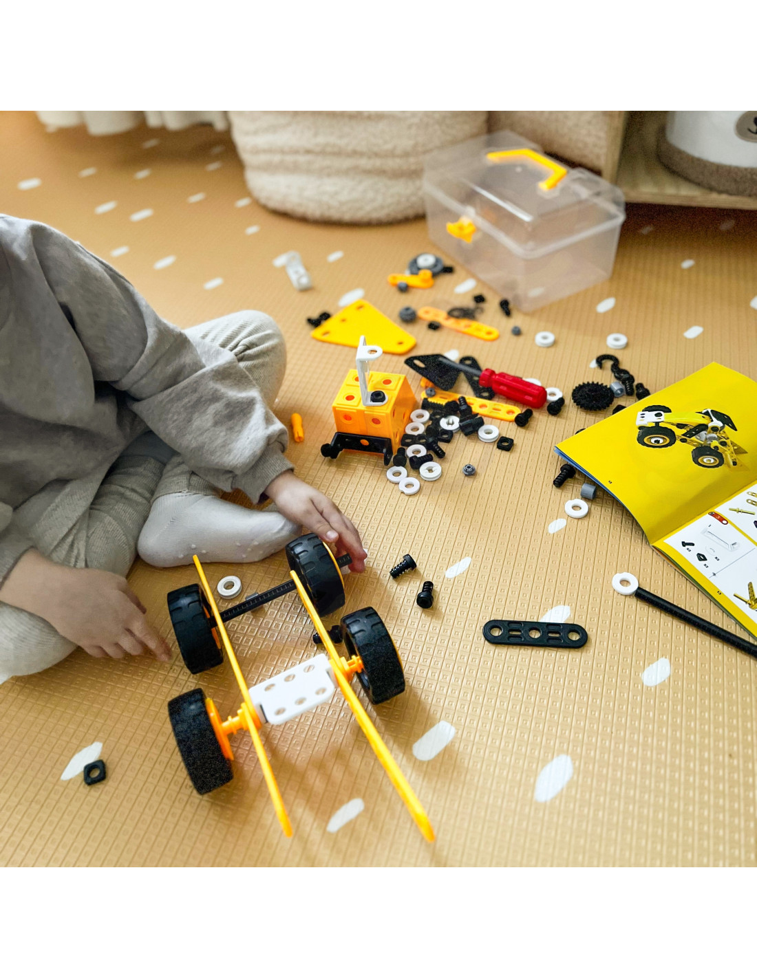 Zestaw pojazdów konstrukcyjnych od marki WOOPIE to 100 elementów, z których młody konstruktor może stworzyć 8 różnych modeli, takich jak dźwig, wiatrak, ciężarówka i inne maszyny budowlane! Dzięki prostemu systemowi skręcania i rozkręcania, dzieci z łatwością wejdą w fascynujący świat konstrukcji, rozwijając przy tym zdolności manualne, logiczne myślenie i wyobraźnię przestrzenną. To zabawka, która uczy zasad budowy maszyn i mechanizmów, a przy tym wprowadza w świat narzędzi i ich bezpiecznego użytkowania.