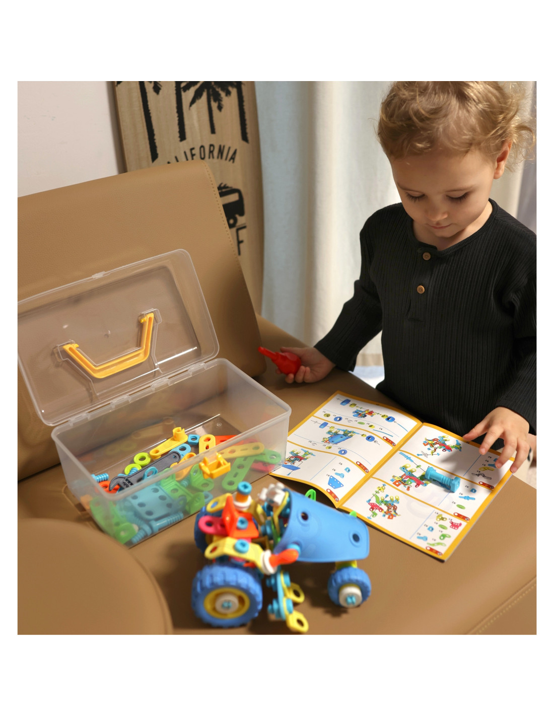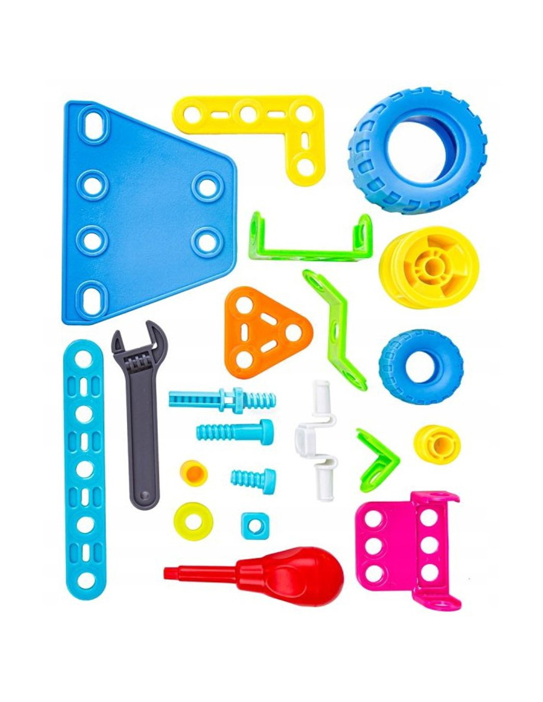 - Zestaw zawiera: Różnokształtne klocki, Śrubokręt i klucz płaski, Śruby mocujące z nakrętkami, Koła, Obrazkową instrukcję do zbudowania 6 różnych pojazdów