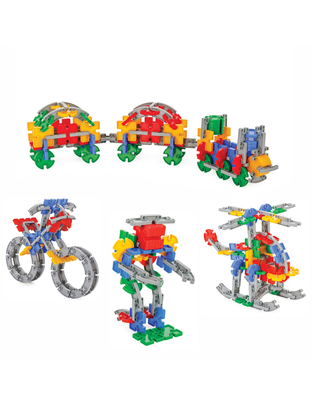 - - możliwość ułożenia różnych konstrukcji przestrzennych w różnym kolorze (w tym helikoptera, motoru, konia, piłki, robota, statek, formułę i pociąg)